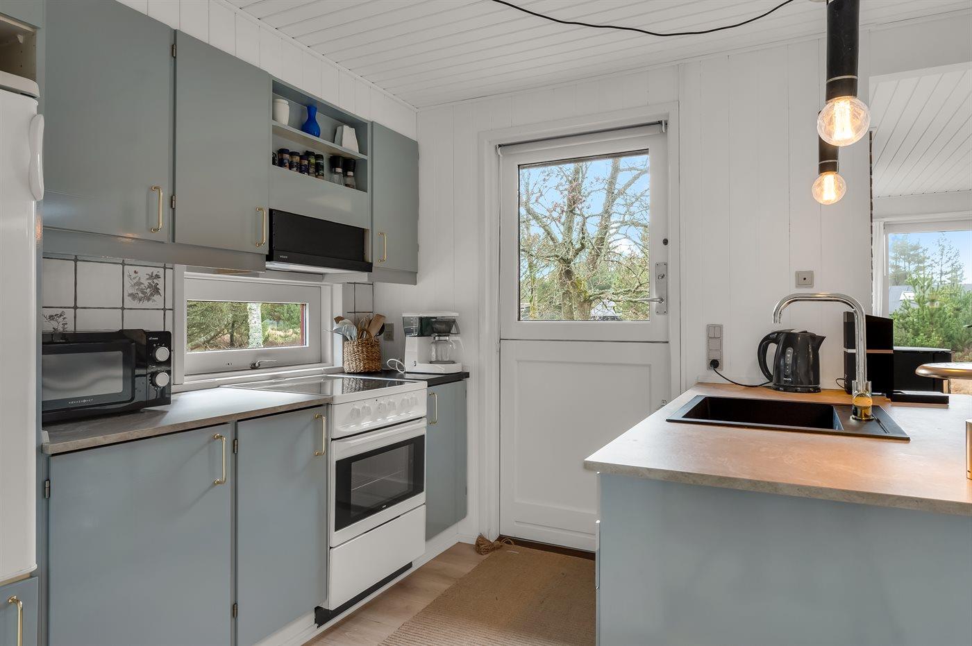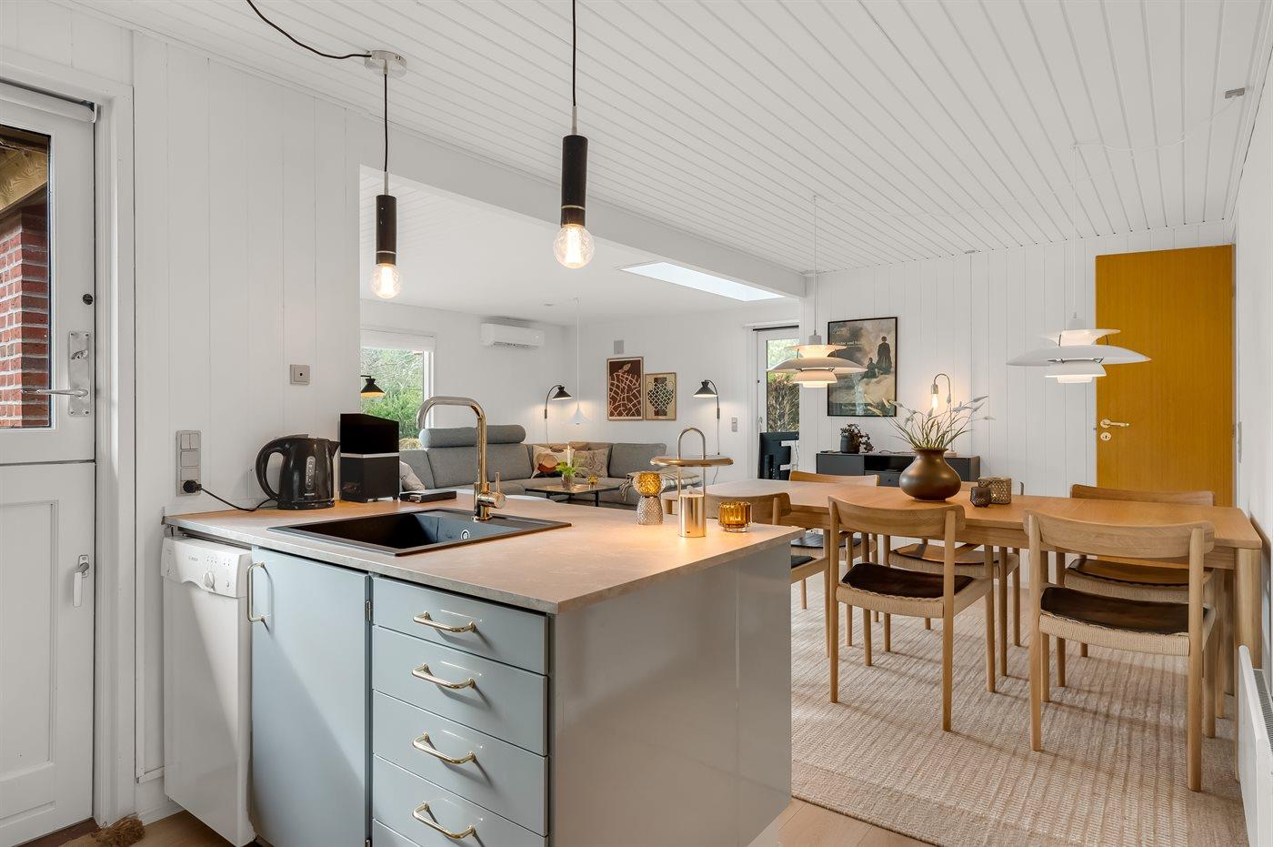 Køkkenet er udstyret med 1 køleskab. Der er 4 keramiske kogeplader, varmluftovn, mikrobølgeovn samt opvaskemaskine.