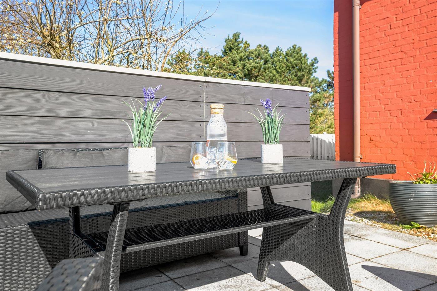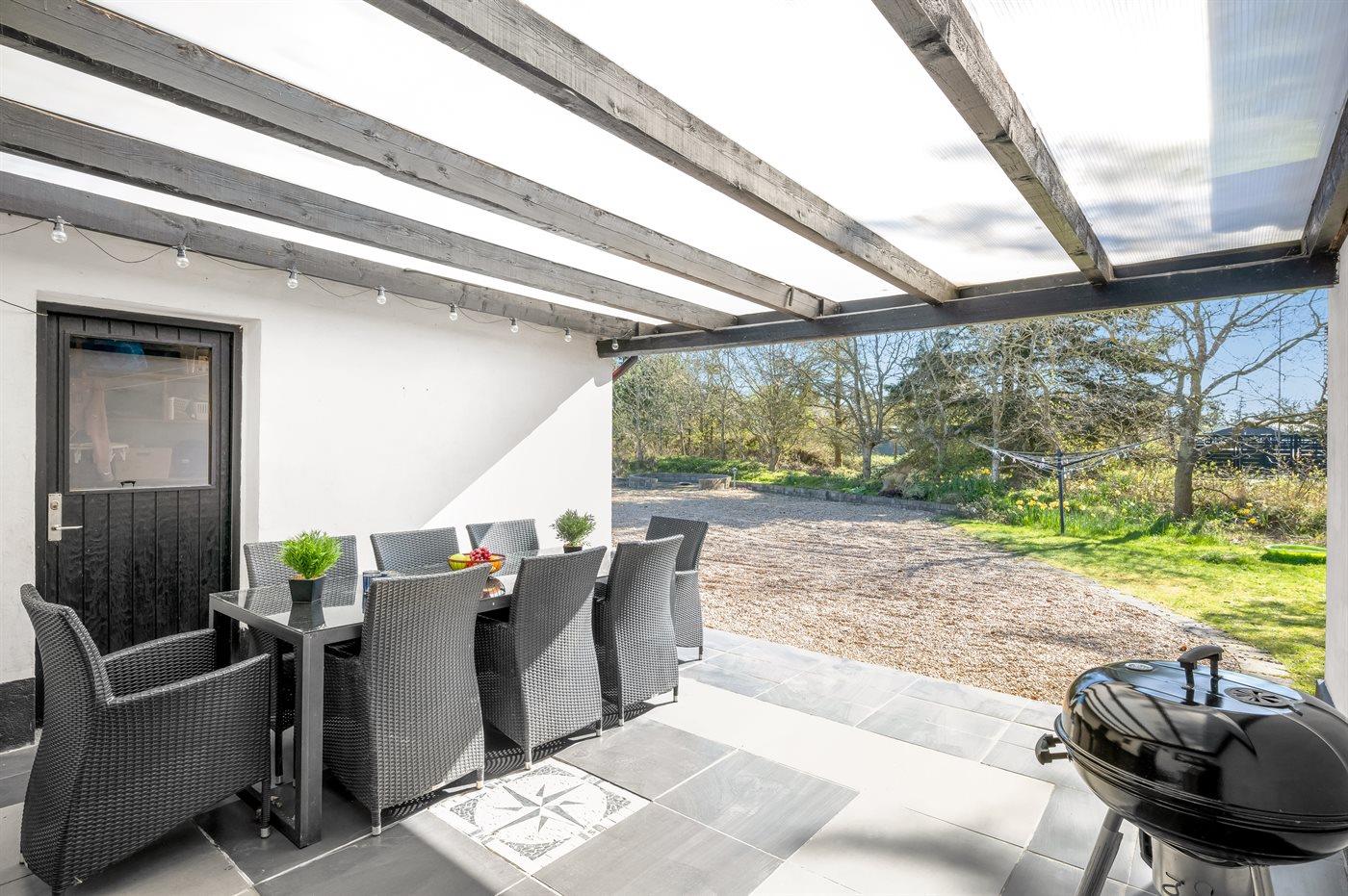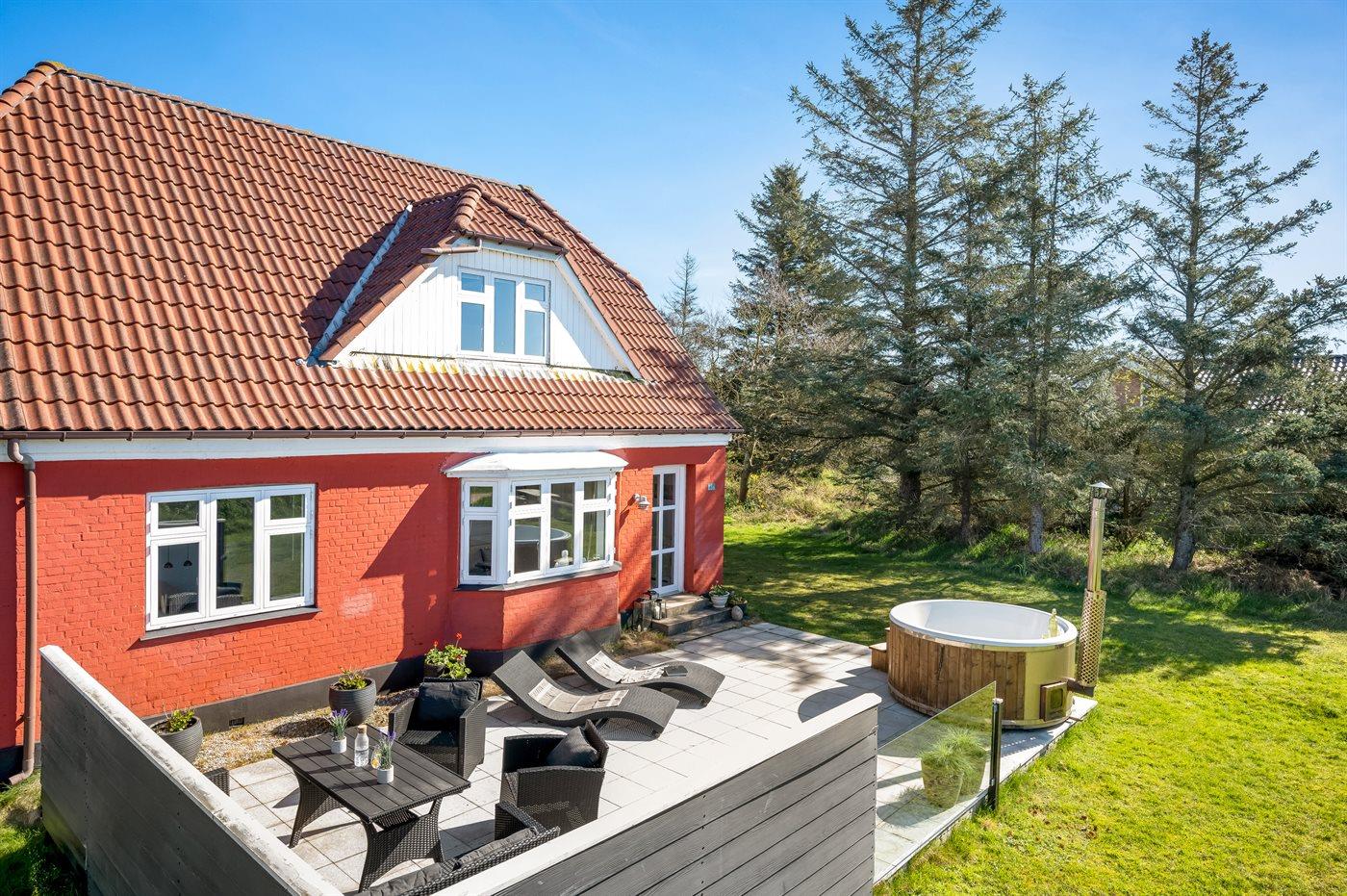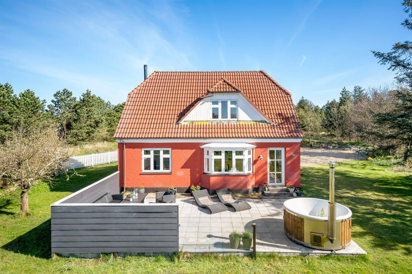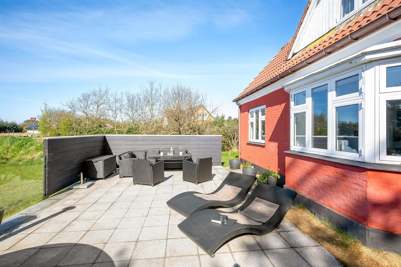 Hyggeligt sommerhus i Blåvand med vildmarksbad og stor terrasse nær strand og natur.