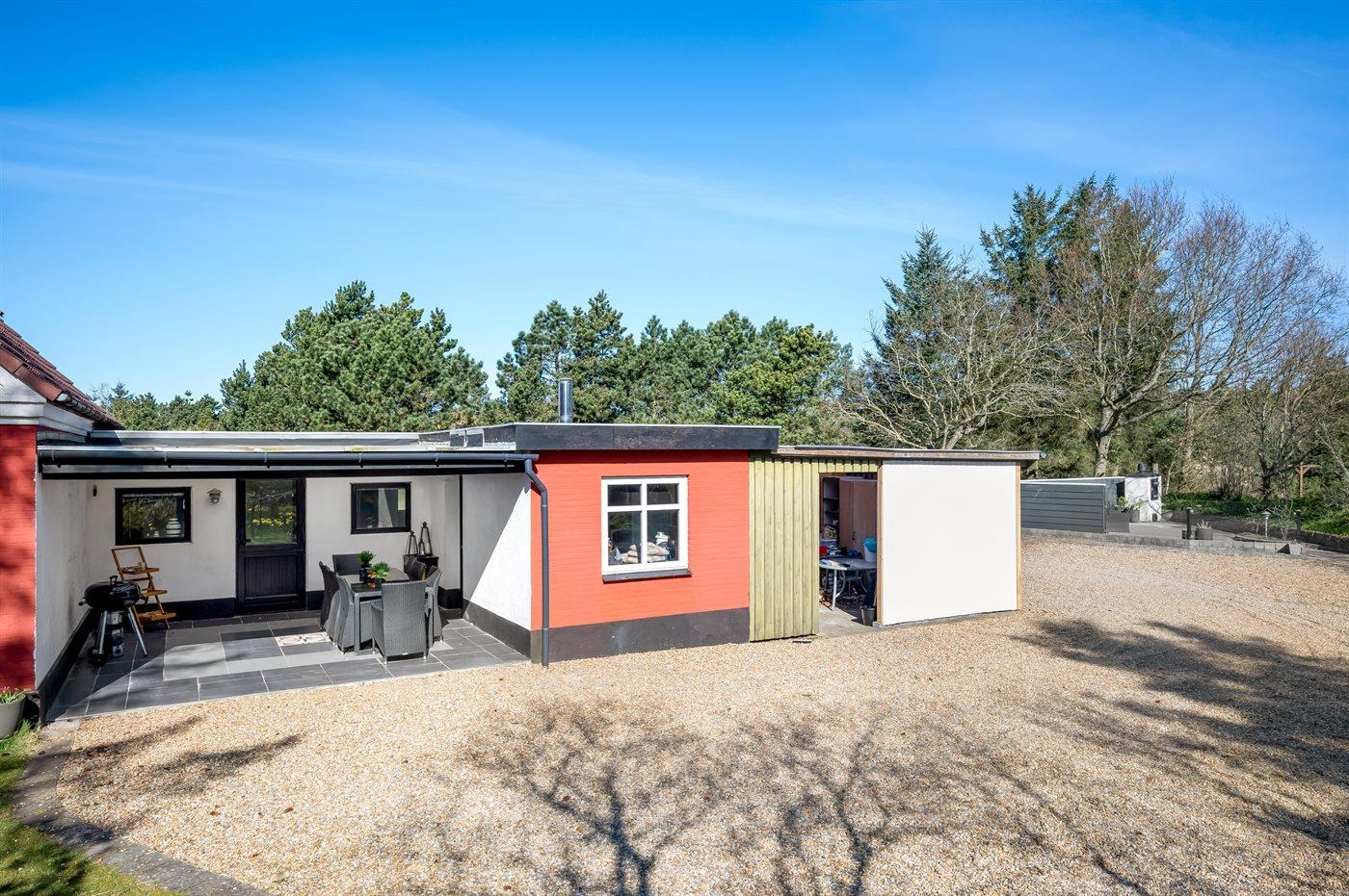 Ferieboligen er beliggende på en 3900 m² stor naturgrund. Der er 1000 m til havet. Nærmeste forretning er beliggende i en afstand af 500 m. Til ferieboligen hører 80 m² terrasseareal. Desuden er der 40 m² overdækket terrasse. Bålsted. Grill til rådighed. Parkering ved ferieboligen.