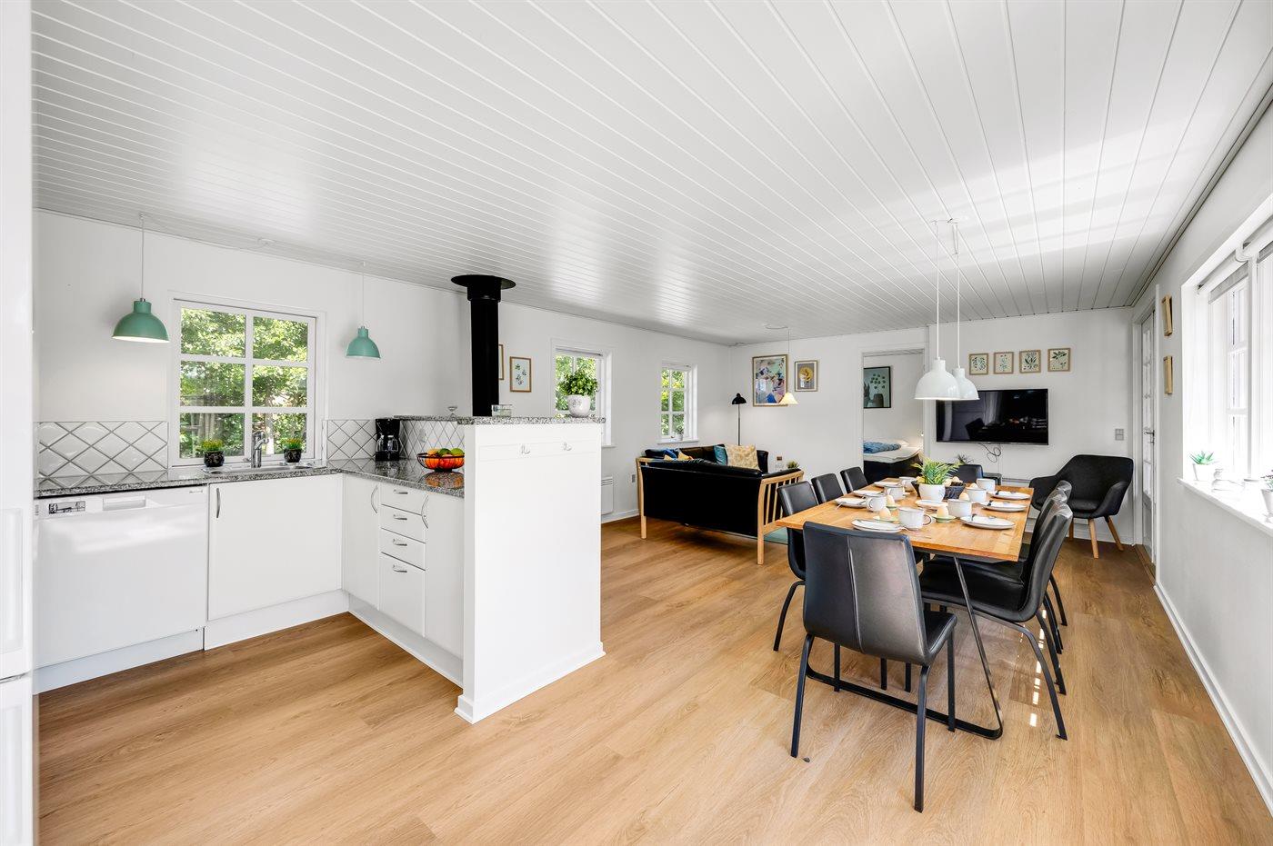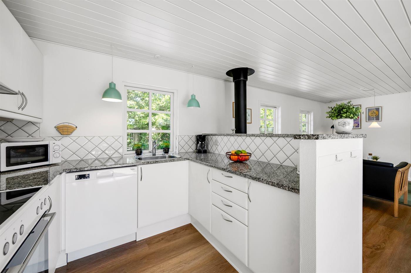Køkkenet er udstyret med 1 køleskab. Der er 4 keramiske kogeplader, varmluftovn, mikrobølgeovn samt opvaskemaskine.