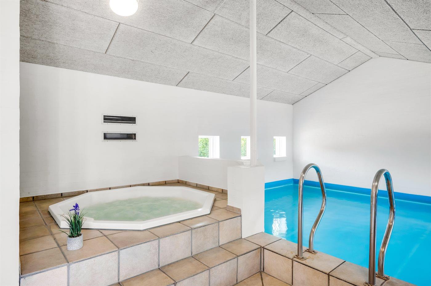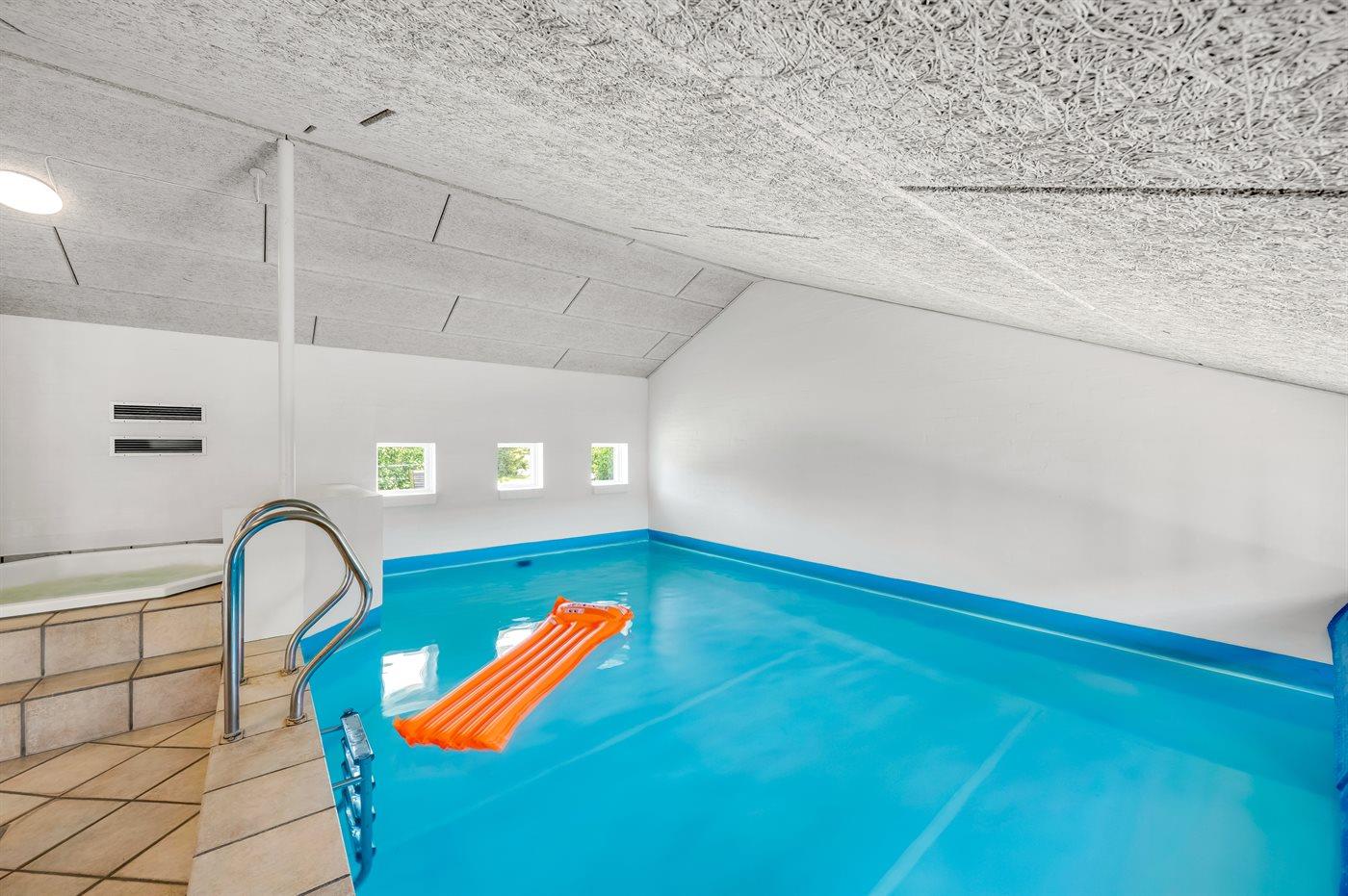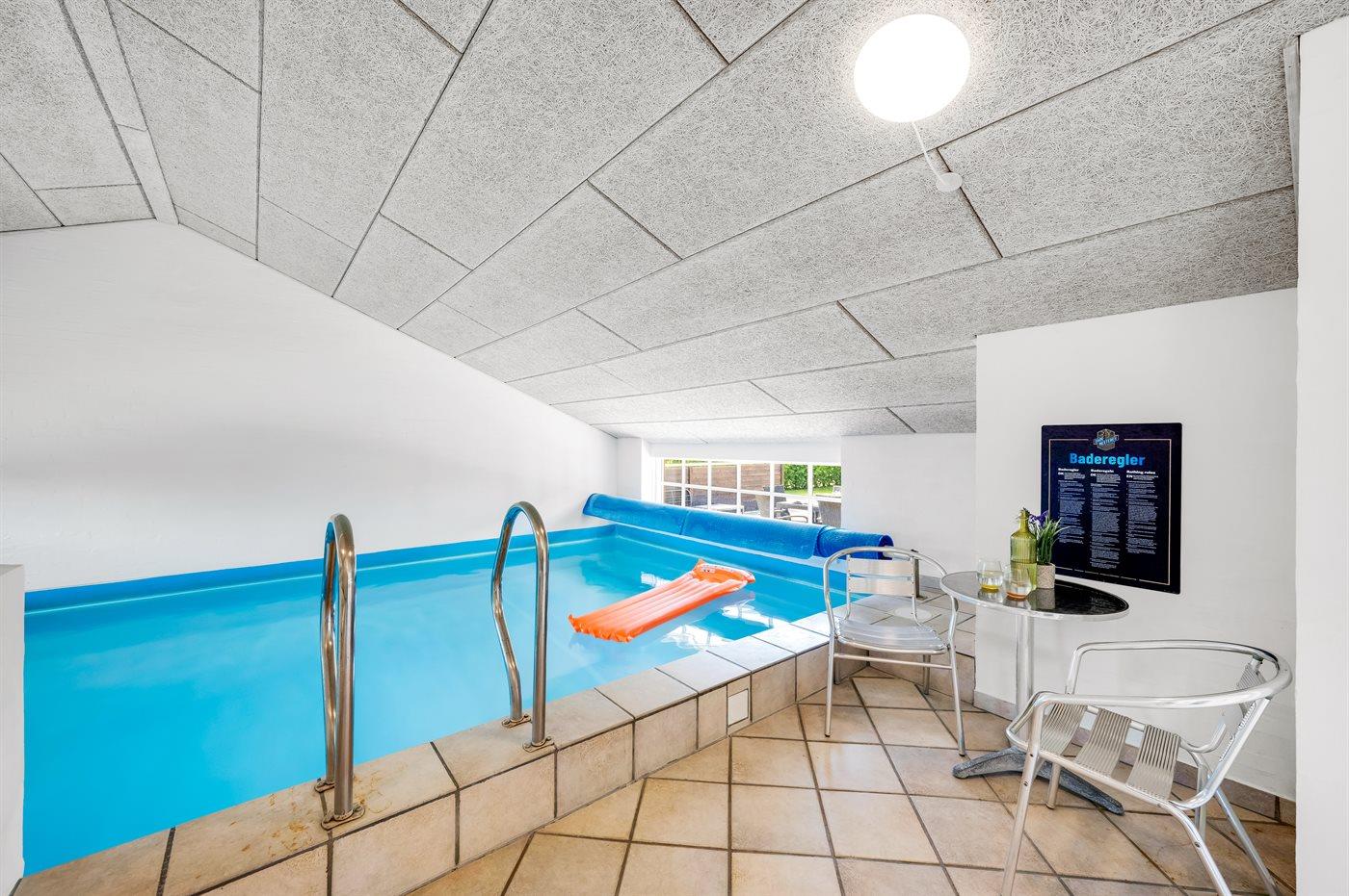 I den indendørs swimmingpool er der mulighed for leg og hyggeligt samvær. Der er gulvvarme i swimmingpoolområdet.