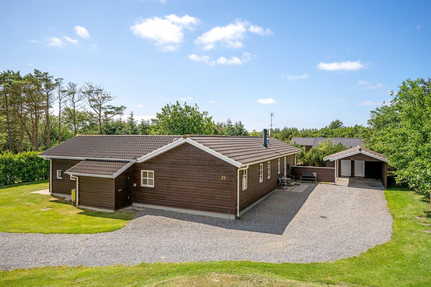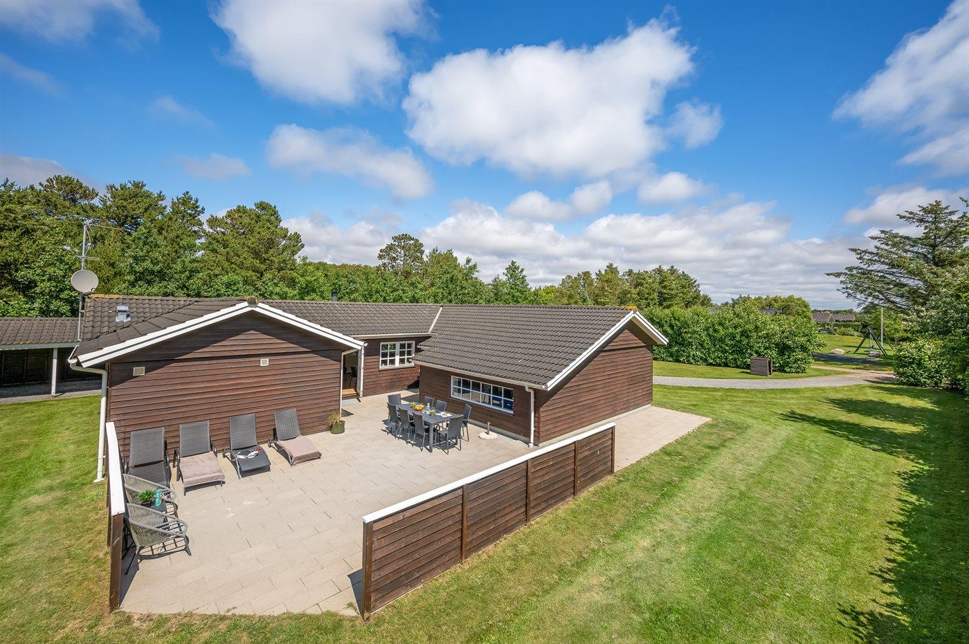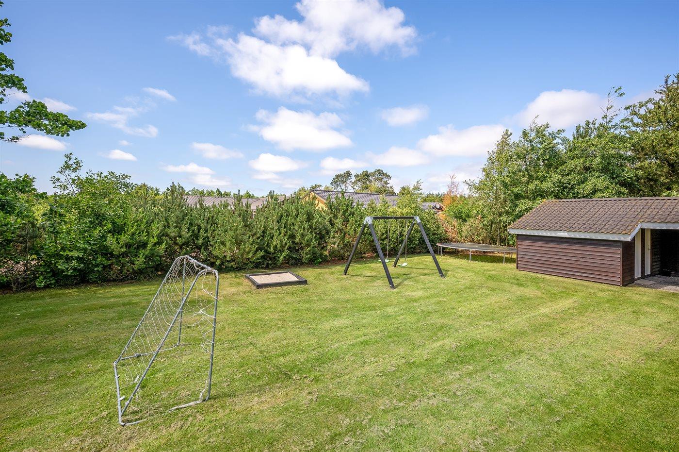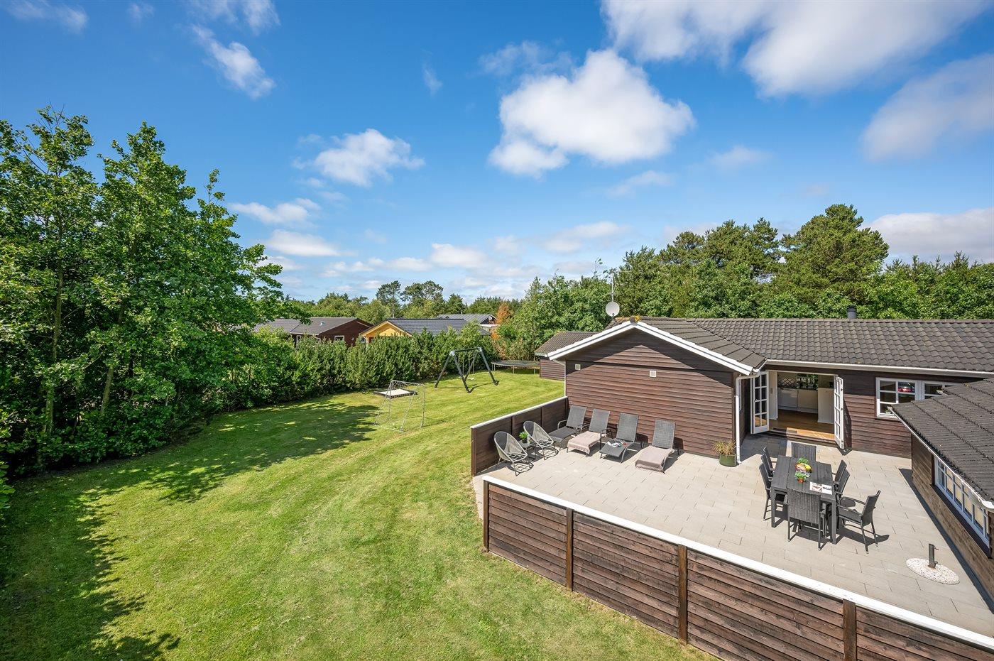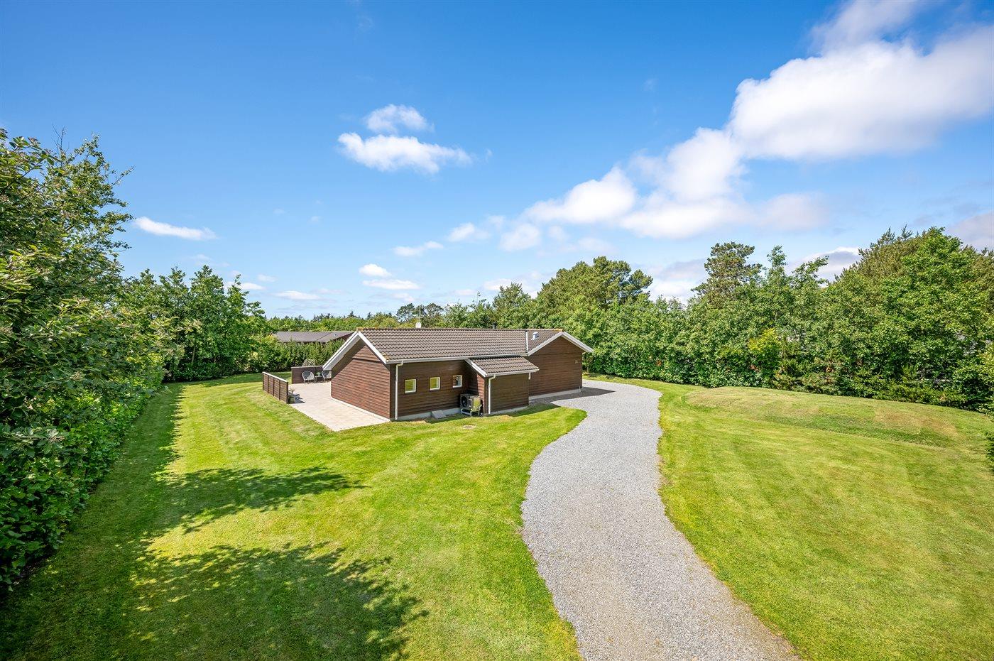 Ferieboligen er beliggende på en 2000 m² stor naturgrund. Der er 400 m til havet. Til ferieboligen hører åbent terrasseareal. Gynge. Sandkasse. Trampolin. Grill til rådighed. Der er installeret stik til opladning af elbil. Type 2 stik. Med 11 kW ladeeffekt. Parkering ved ferieboligen.