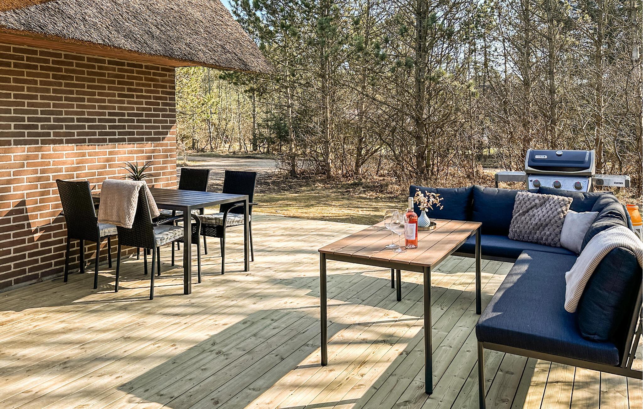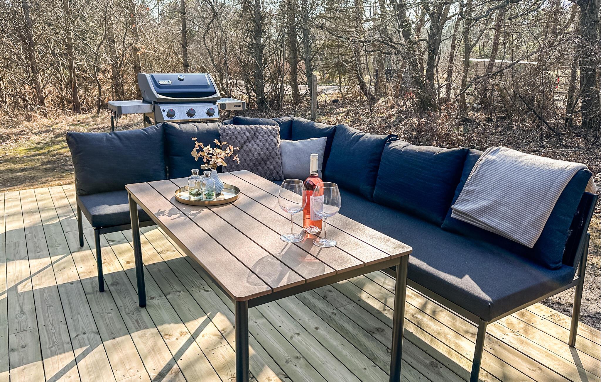 Den store, åbne terrasse er udstyret med kvalitetshavemøbler. Nyd morgenmaden på solrige dage, få varmen i saunaen eller spabadet efter en lang gåtur på stranden og nyd de lune sommeraftener med stemningsfulde grillaftener under åben himmel.