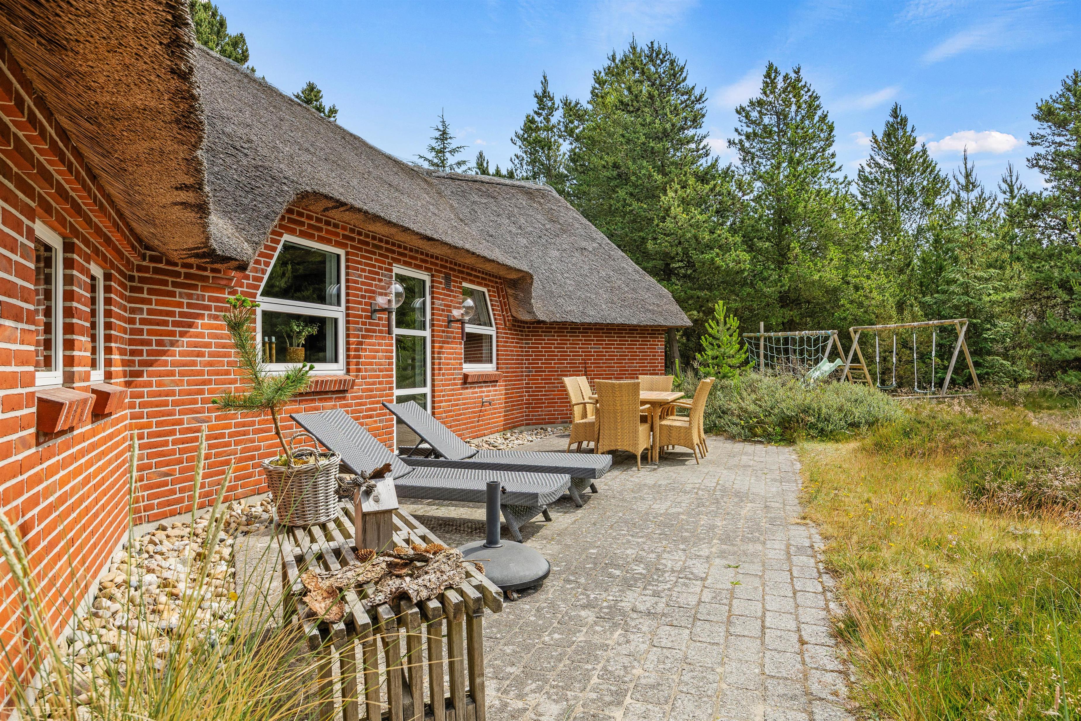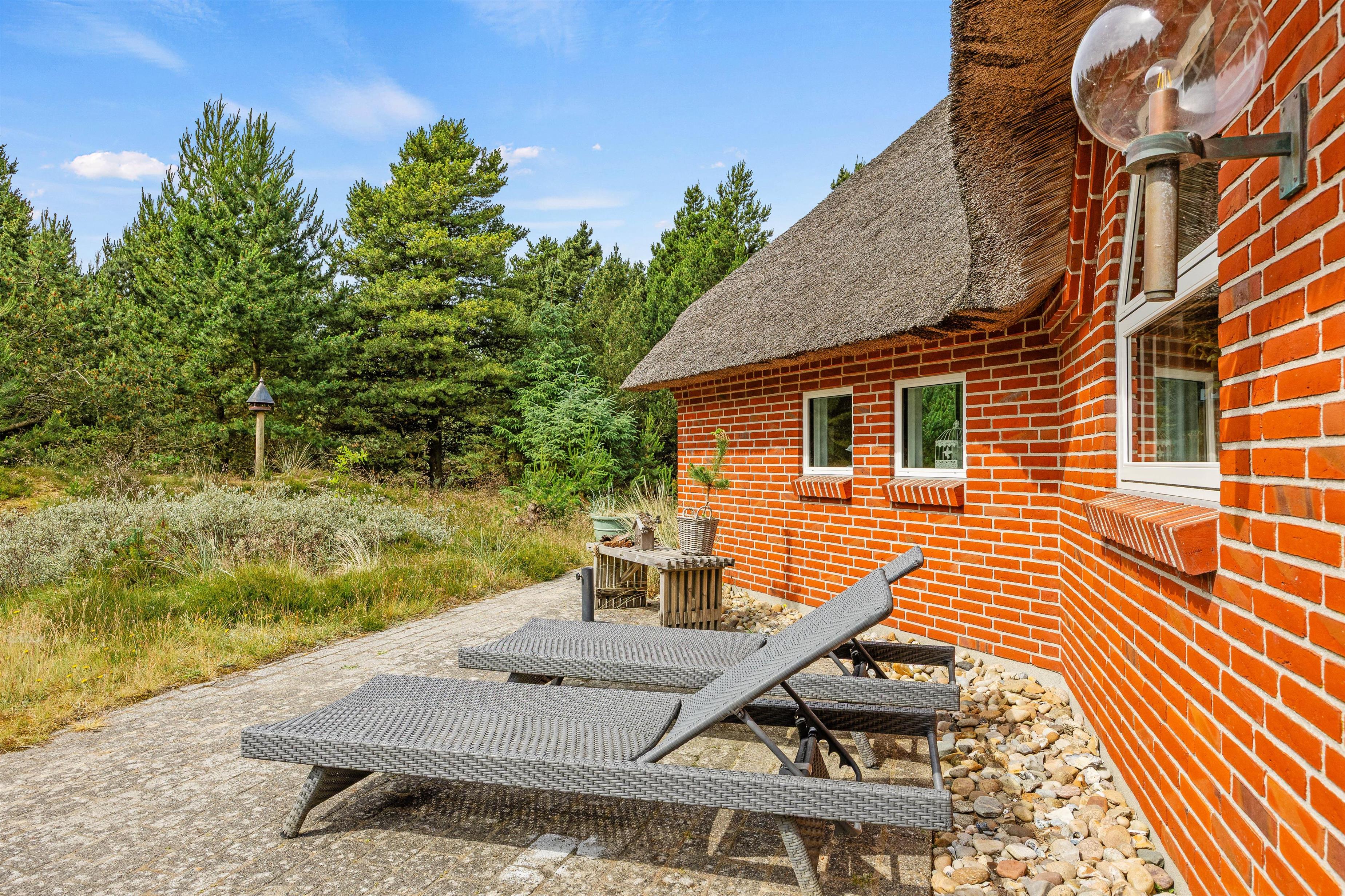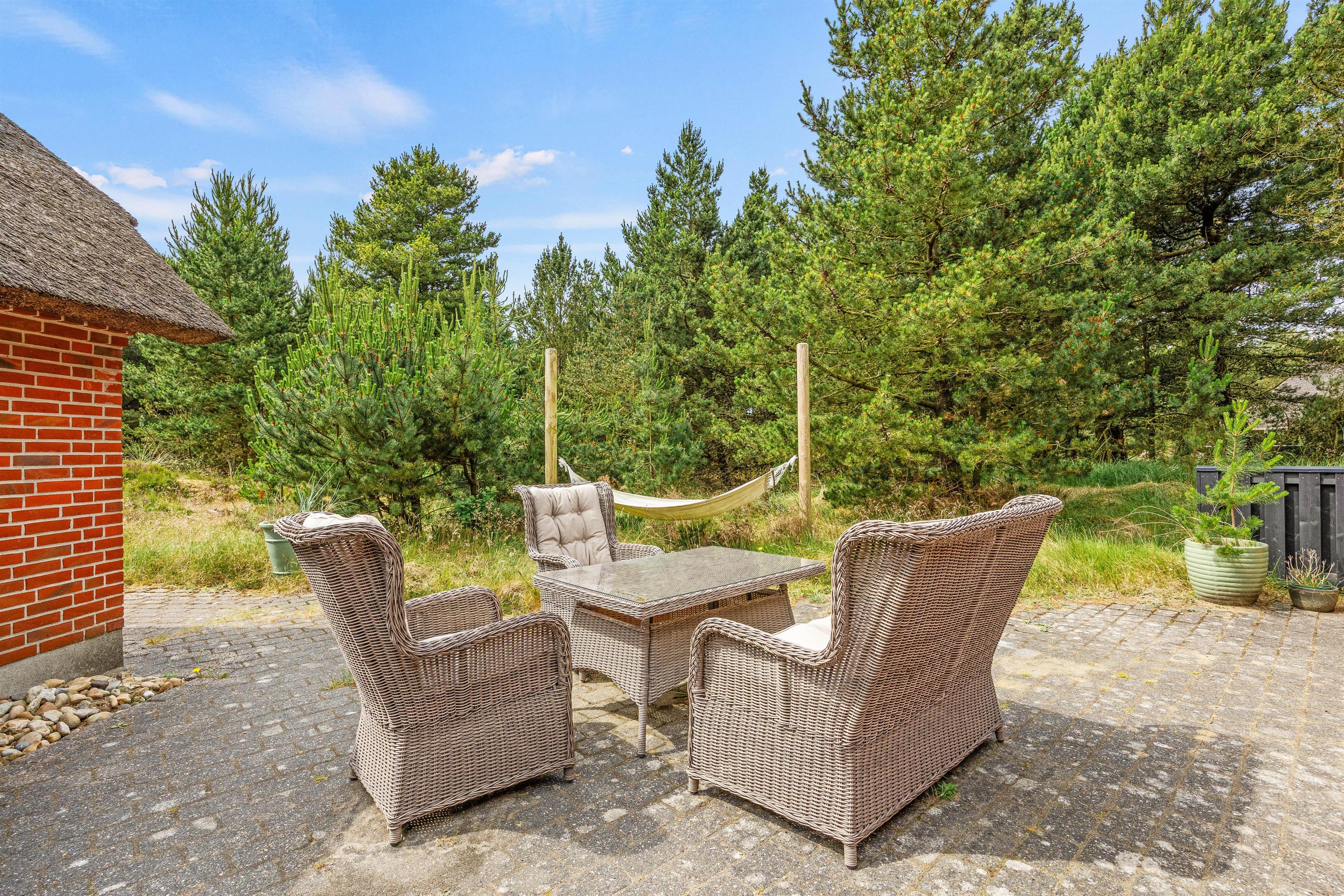 Udenfor kan I nyde solskinstimerne på terrassen. Feriehuset har en åben fliseterrasse med udsigt udover den smukke naturgrund. Rundt om feriehuset finder I flere små hyggekroge, hvor I kan sætte jer til rette med en friskbrygget kop kaffe og en spændende bog.