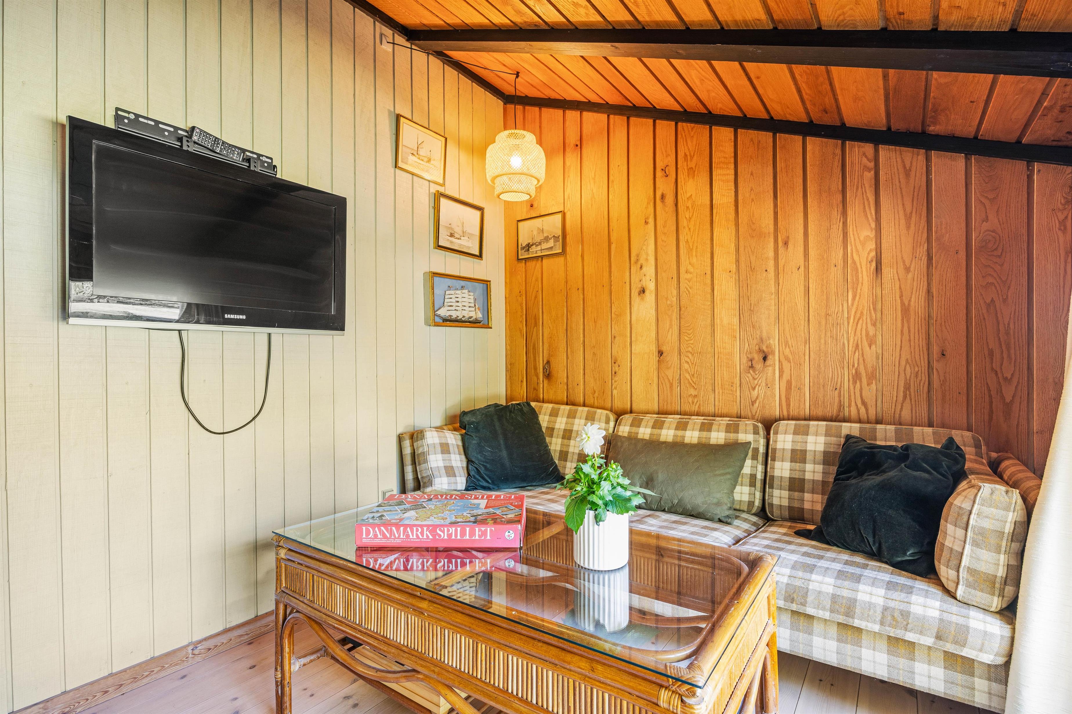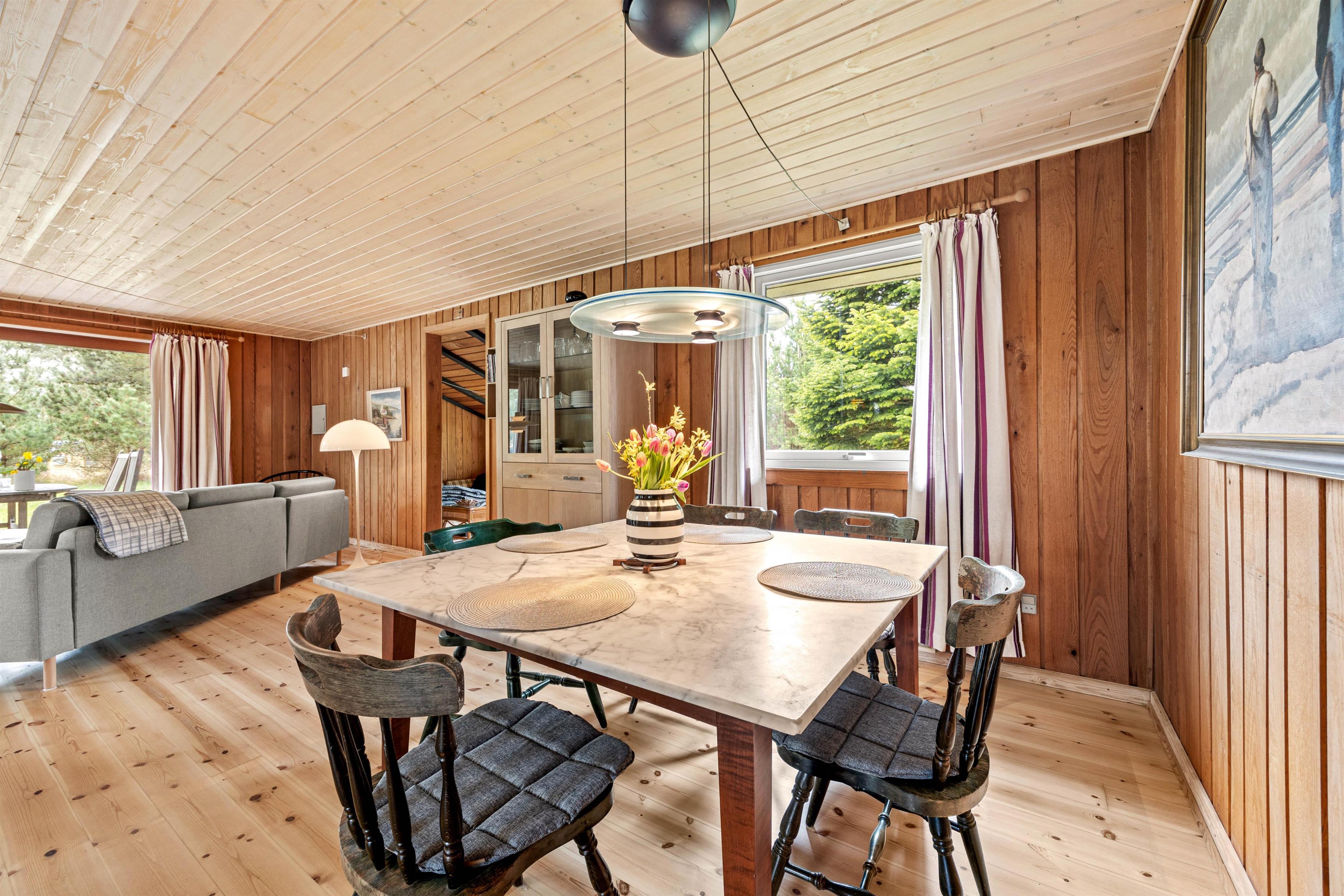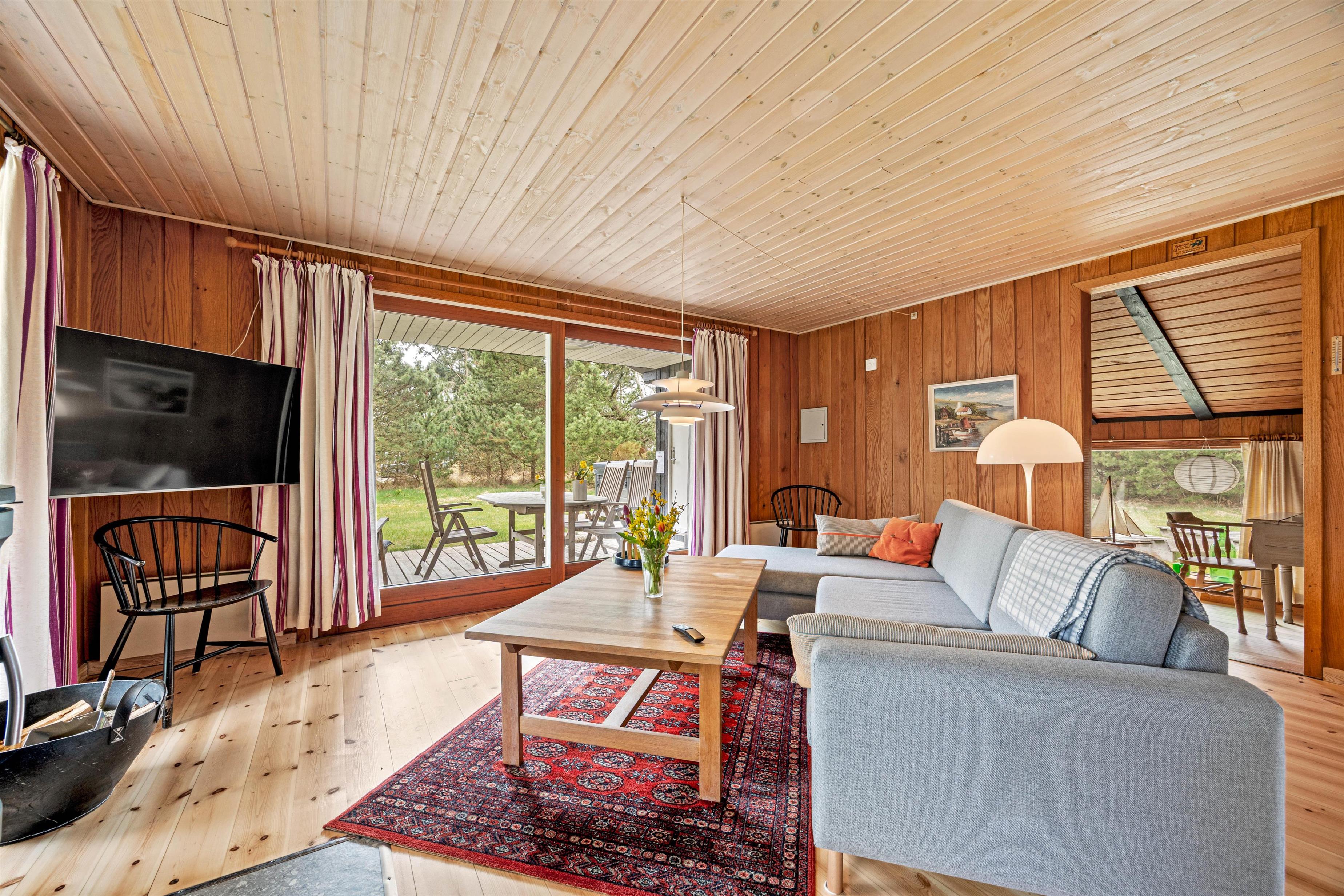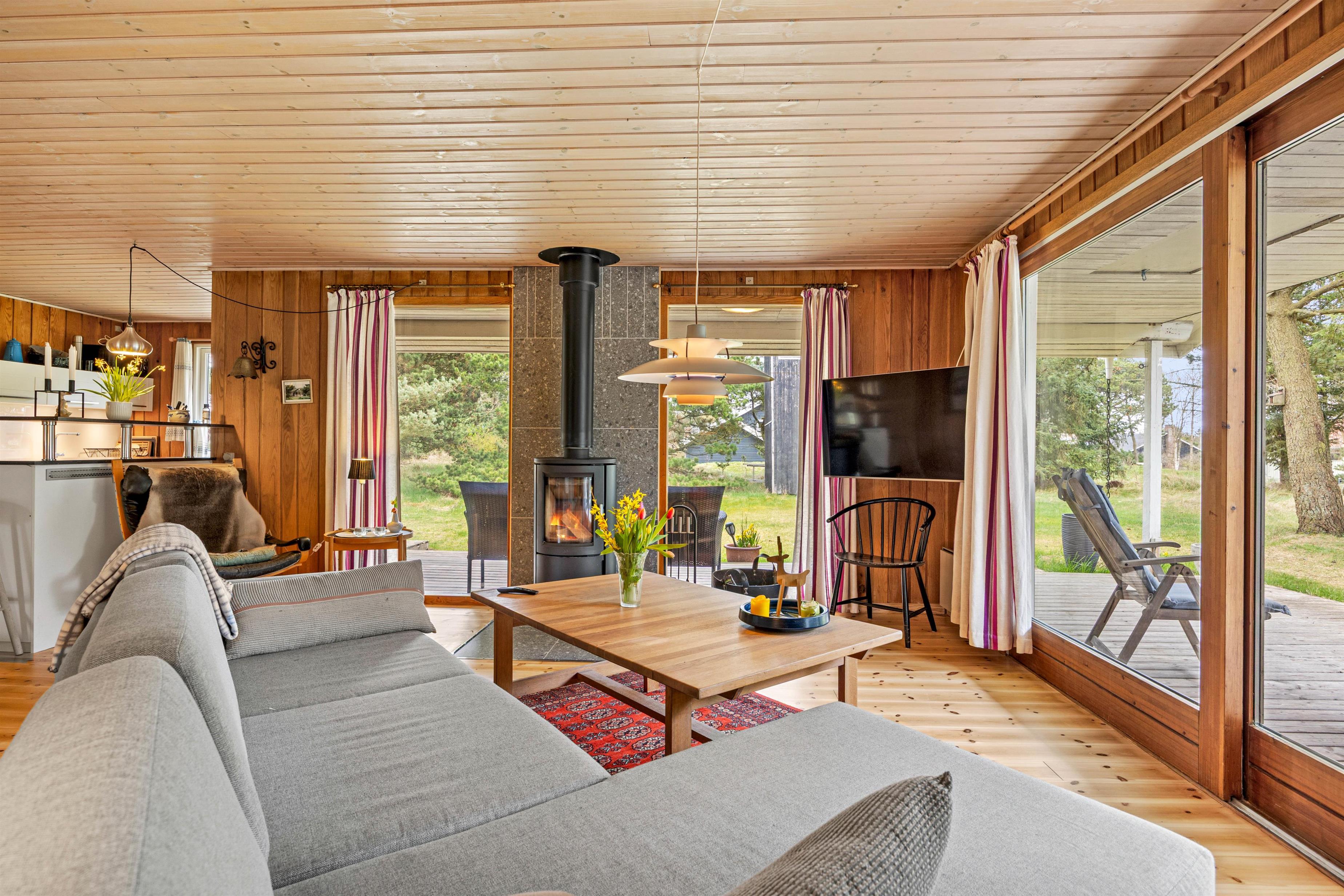 Det praktiske køkken, spisepladsen og stuen er i åben forbindelse med hinanden, så I kan forberede aftensmaden, mens børnene leger i stuen og dermed stadig er tæt på. Efter middagen kan I gøre jer det behageligt i stuen og se en film over en gang hjemmelavede popcorn, mens I luner jer på brændeovnen.