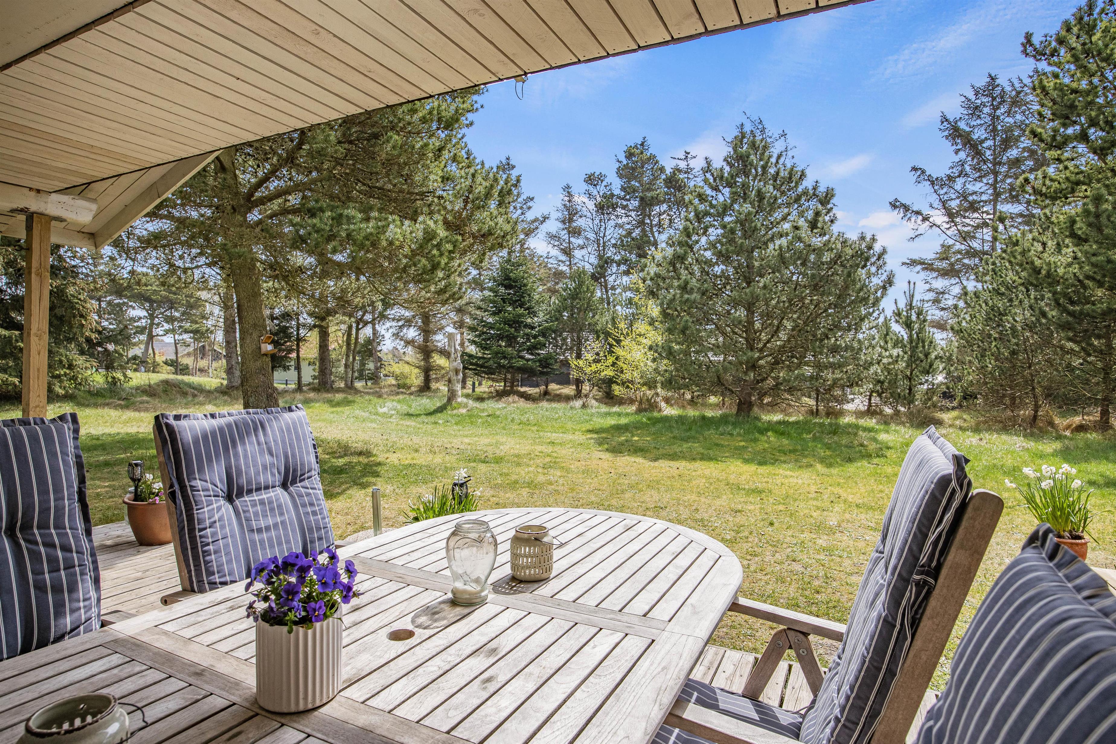På sommerhusets udenomsarealer kan I tilbringe mange timer i den friske luft. Der er terrasse på to sider af sommerhuset, så I kan følge solen rundt eller finde et skyggefuldt sted under den overdækkede del af terrassen og måske nyde en kold øl.
