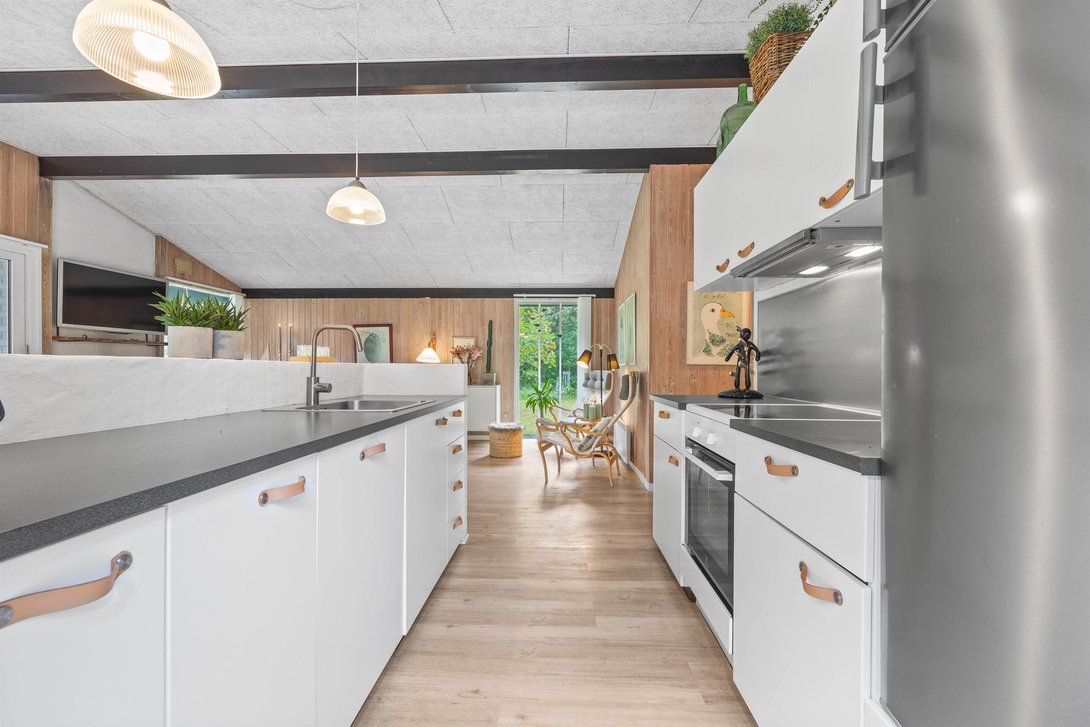 I sommerhusets alrum kan hele familien samles til hyggelige stunder, hvad enten det er over madlavningen i køkkenet, et godt måltid rundt om spisebordet eller afslapning foran brændeovnen. Det sydvendte vinduesparti mod terrassen giver et godt lysindfald til rummet, der er hyggeligt og indbydende indrettet. Sæt jer godt til rette i sofaen og nyd ferien med en filmaften for hele familien. Der er både danske tv-kanaler og Chromecast i sommerhuset. Udover brændeovnen kan I også benytte den energibesparende varmepumpe.