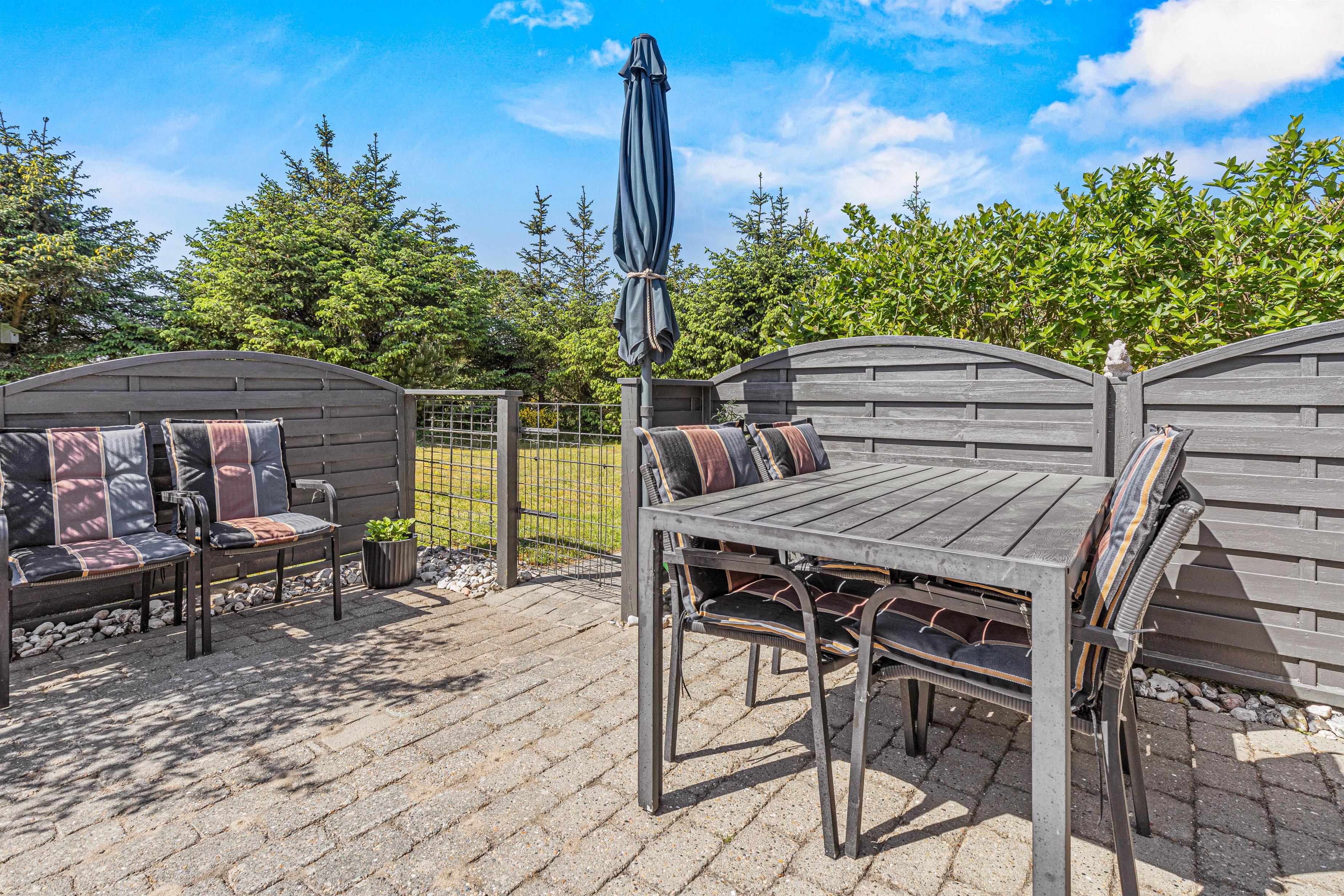 Når ferievejret er i top, kan I rykke jeres ferie ud på sommerhusets terrasse, der er lukket. På terrassen kan I finde jer til rette i havemøblerne og liggestolene, hvorfra I kan nyde solens varme stråler. I har desuden en grill til rådighed, så I kan nyde de lune ferieaftener på terrassen med lækker grillmad.