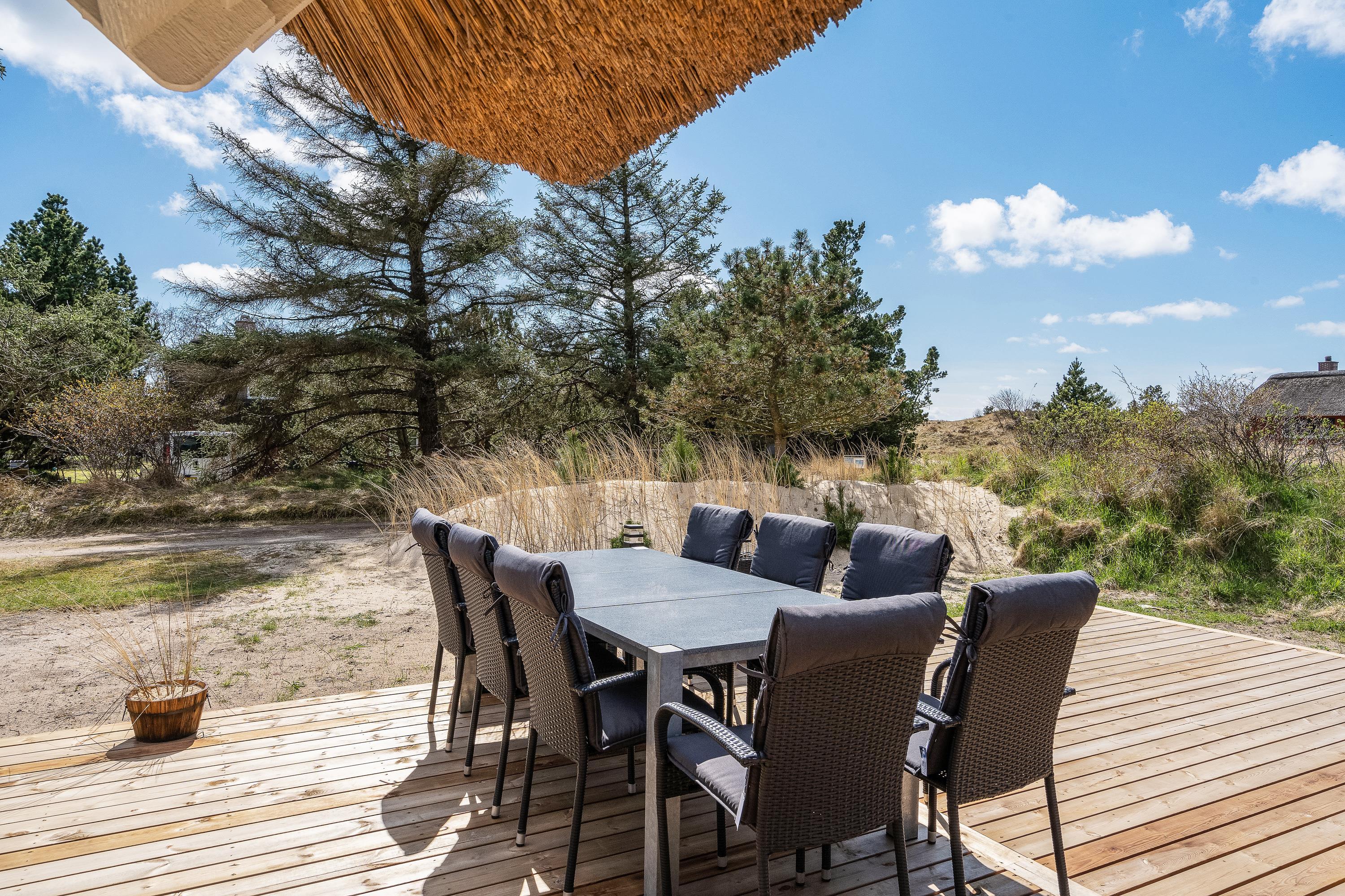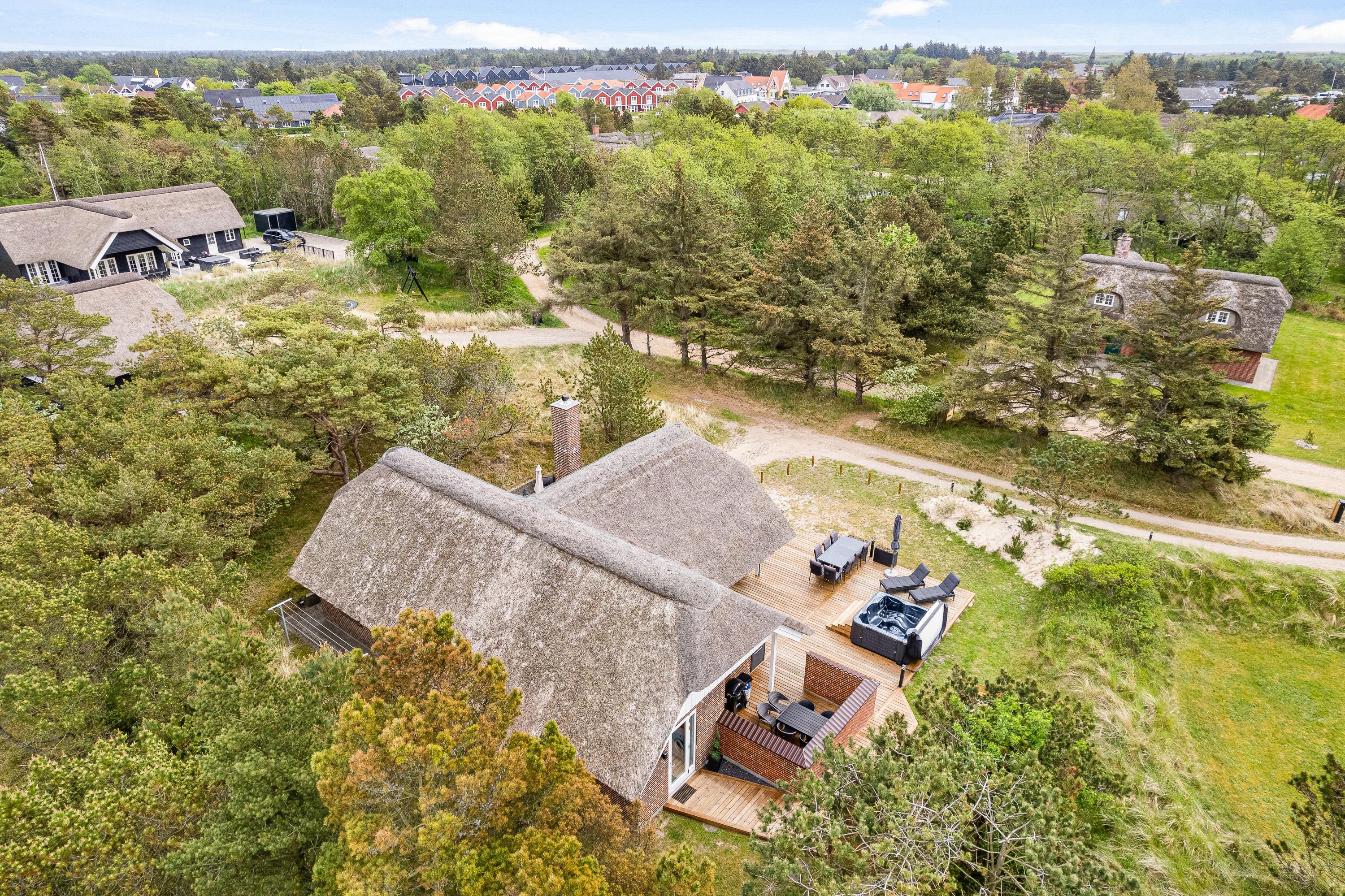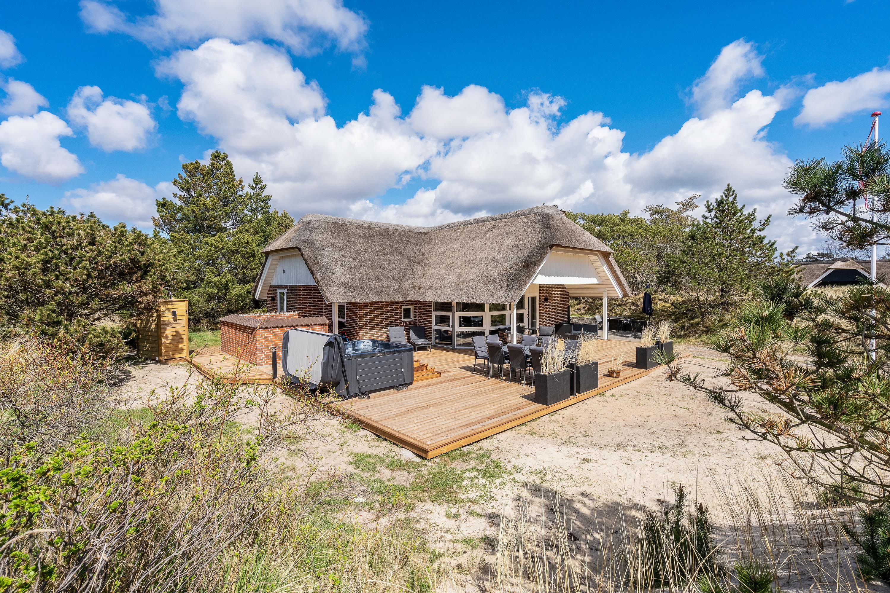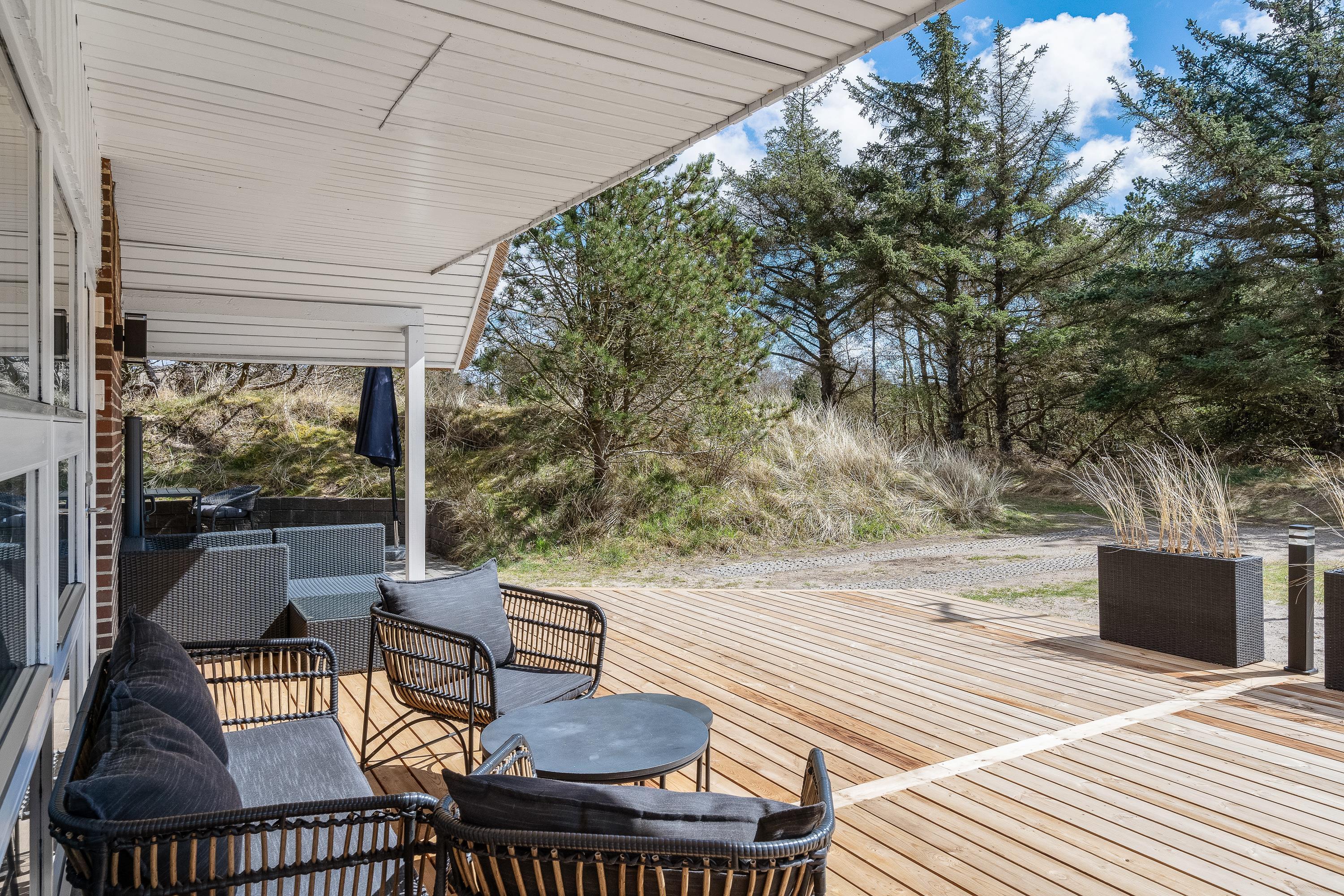 Sommerhuset ligger på en godt 1.500 kvadratmeter stor naturgrund, der er omgivet af høje træer og buskads, så I på ugeneret vis kan nyde den friske luft på terrassen. Den store træterrasse er både delvist afskærmet og overdækket, og det er også her, I finder endnu et af feriens højdepunkter – det lækre udendørs spabad med plads til 5 personer.