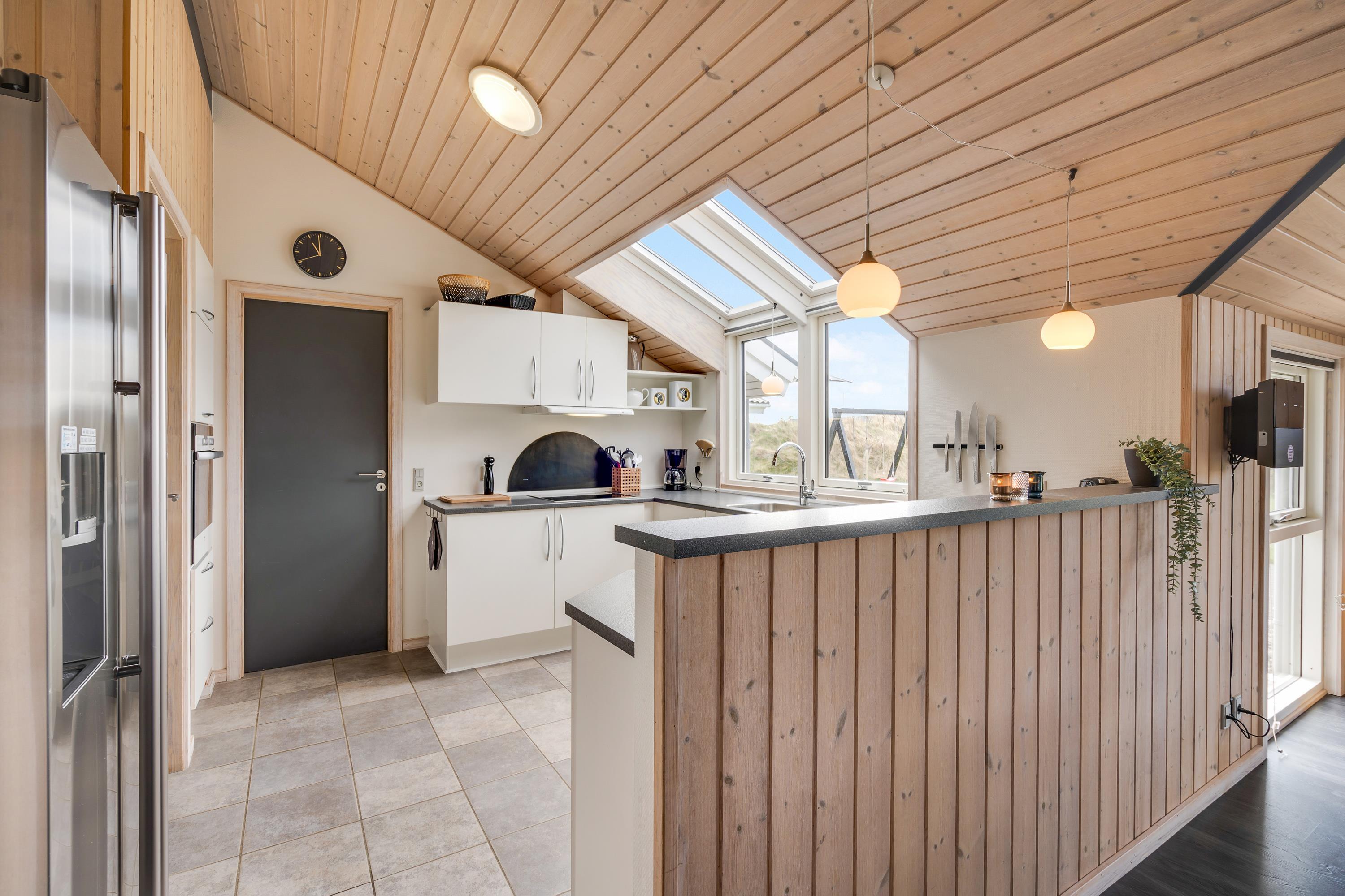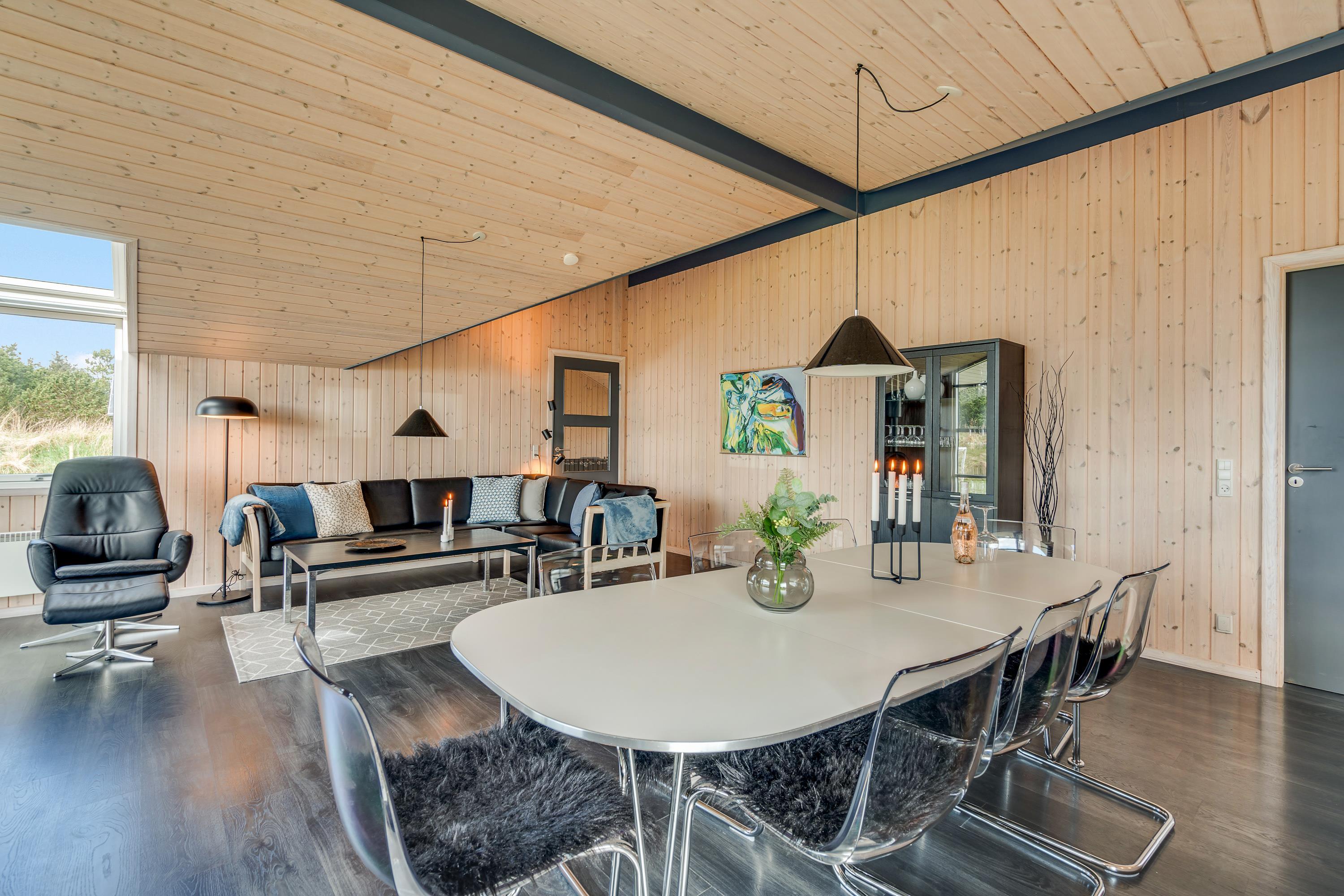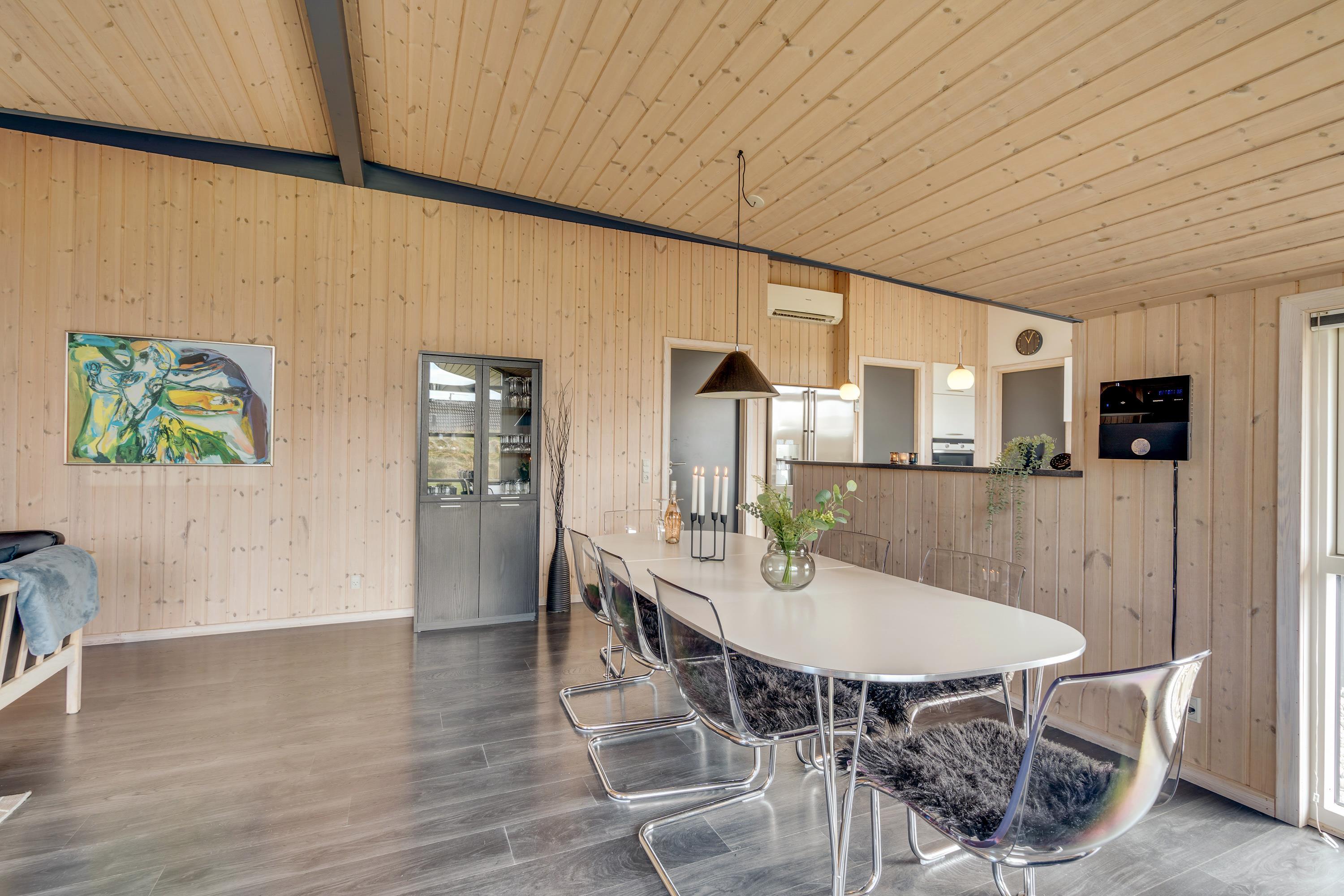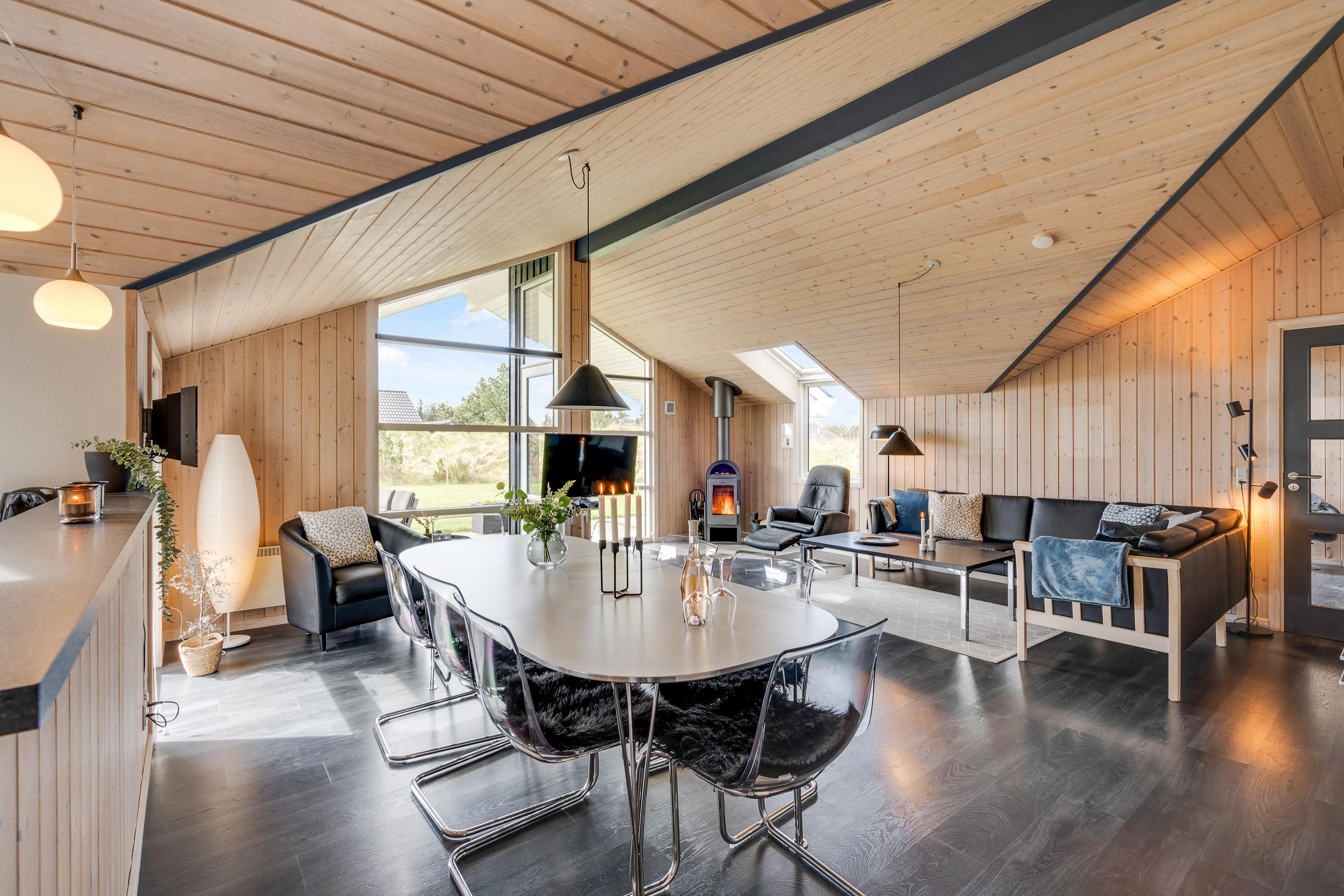 Den energibesparende varmepumpe sørger for, at I står op til en behagelig rumtemperatur, og at jeres feriebudget ikke sprænges. Om aftenen kan et højdepunkt være at tænde op i brændeovnen og betragte flammernes dansen. Læn jer tilbage i den store sofa med et glas vin i hånden og smæk benene op. Det velindrettede stue- og spiseområde er et dejligt rum, der lægger op til masser af hygge, samvær og snak, og hvor der er god plads til jer alle.