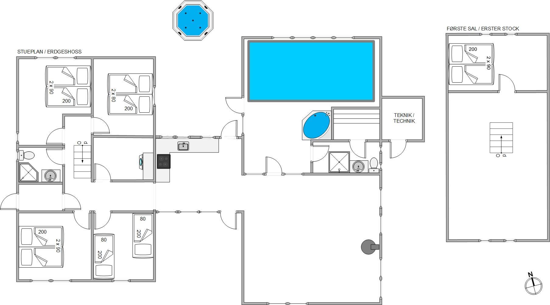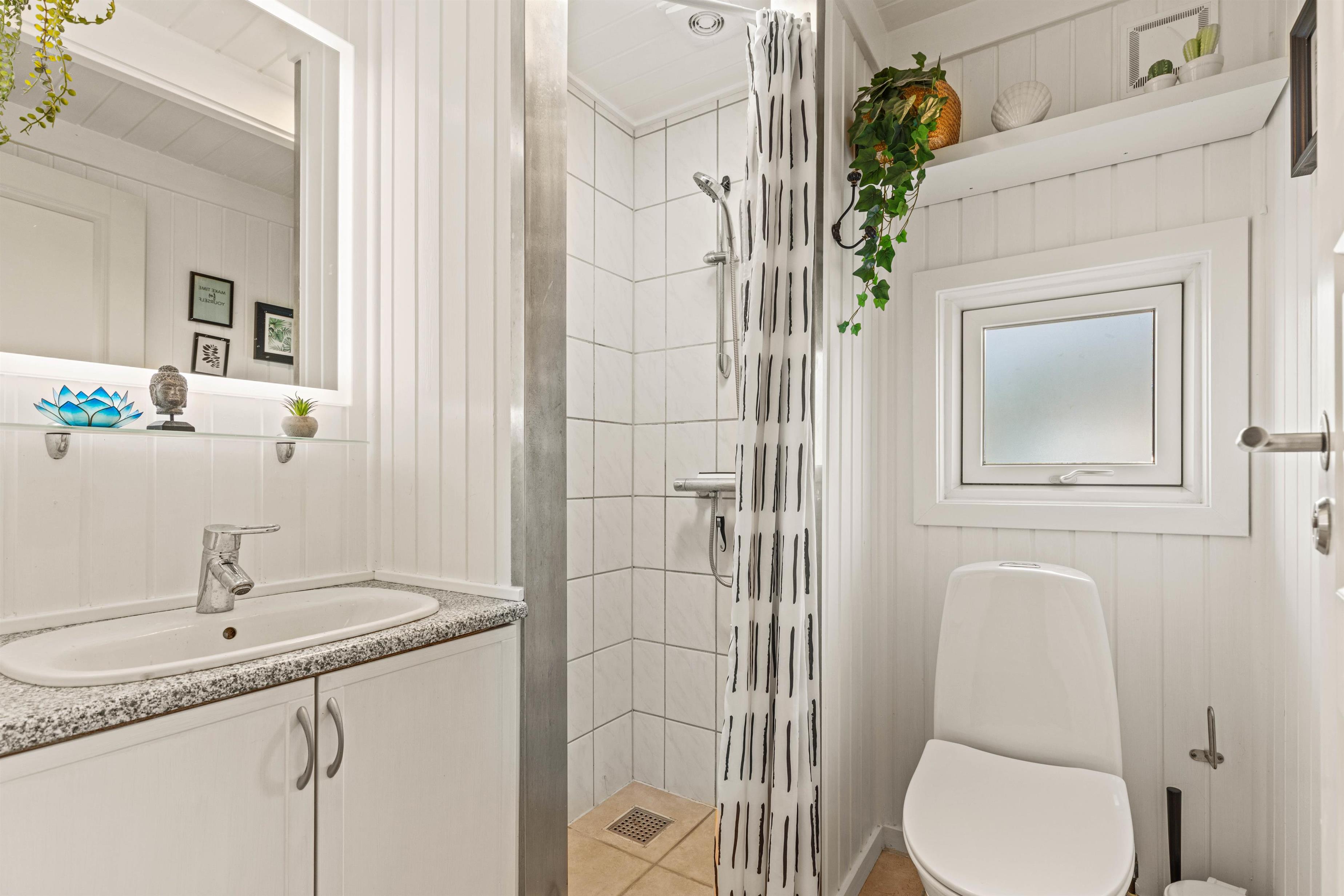 Derudover har sommerhuset 2 badeværelser, så hvis I er 2 familier afsted på ferie, kan hver familie have deres eget badeværelse. Begge badeværelser er selvfølgelig med gulvvarme, så I undgår at få kolde fødder. Varmepumpen sørger desuden for behagelige temperaturer til lave omkostninger. Der er desuden en pusleplads i bryggerset.