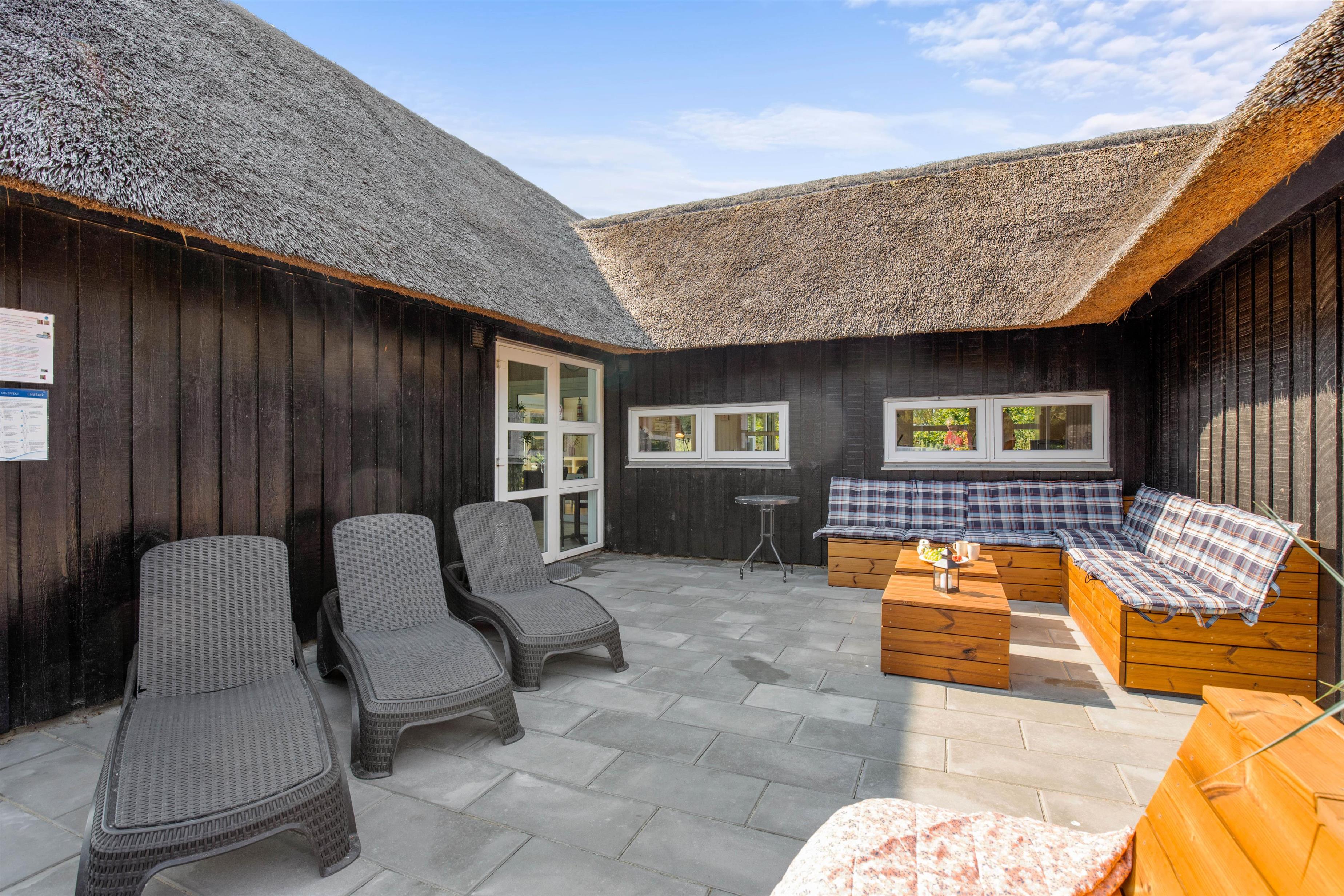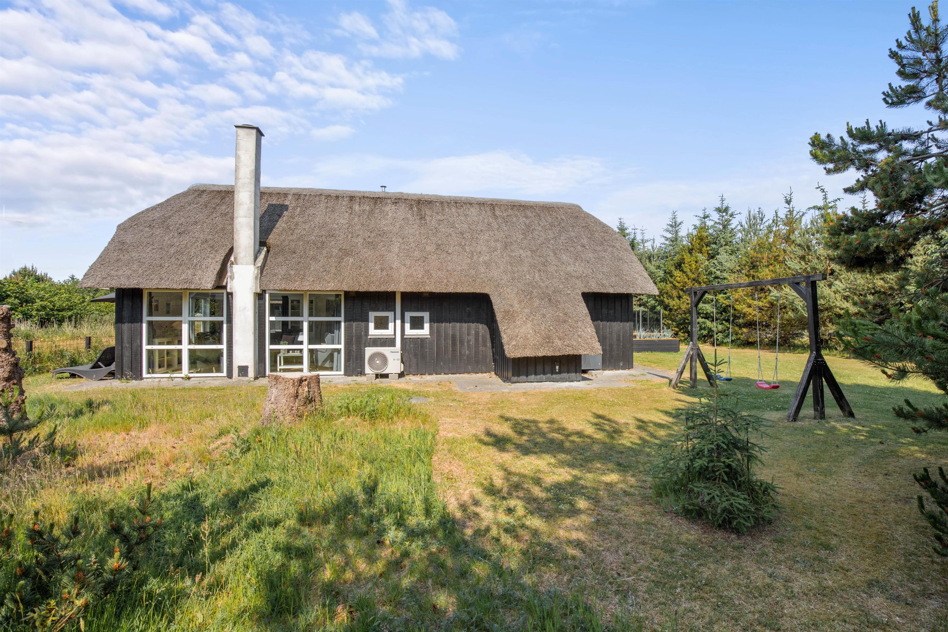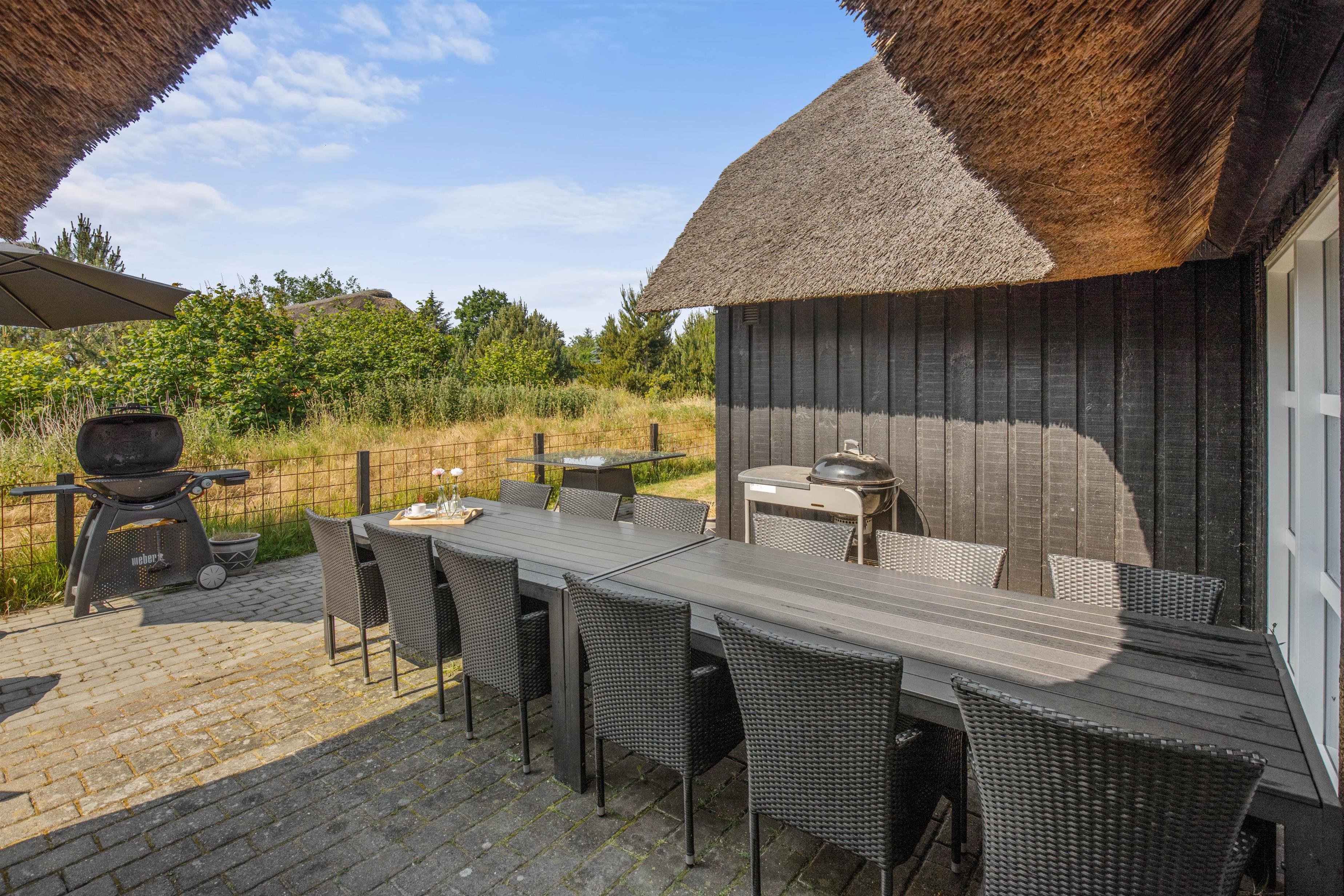 Udenfor omgiver terrassen sommerhuset, og her kan I nyde solen i diverse havemøbler og liggestole. Læn dig tilbage i din valgte liggestol med et godt glas vin i hånden, mens du ser på børnene, der leger i haven. Her er der både et legetårn med rutsjebane og et gyngestativ. I kan også hive grillen frem og tilberede et lækkert måltid.