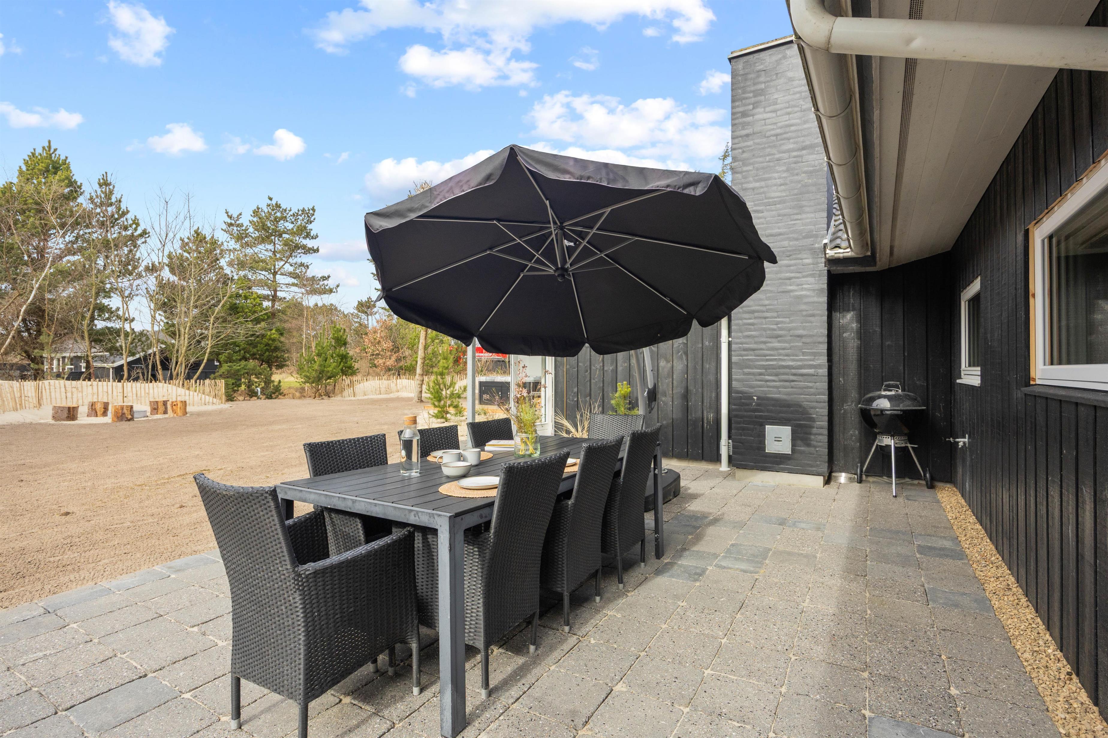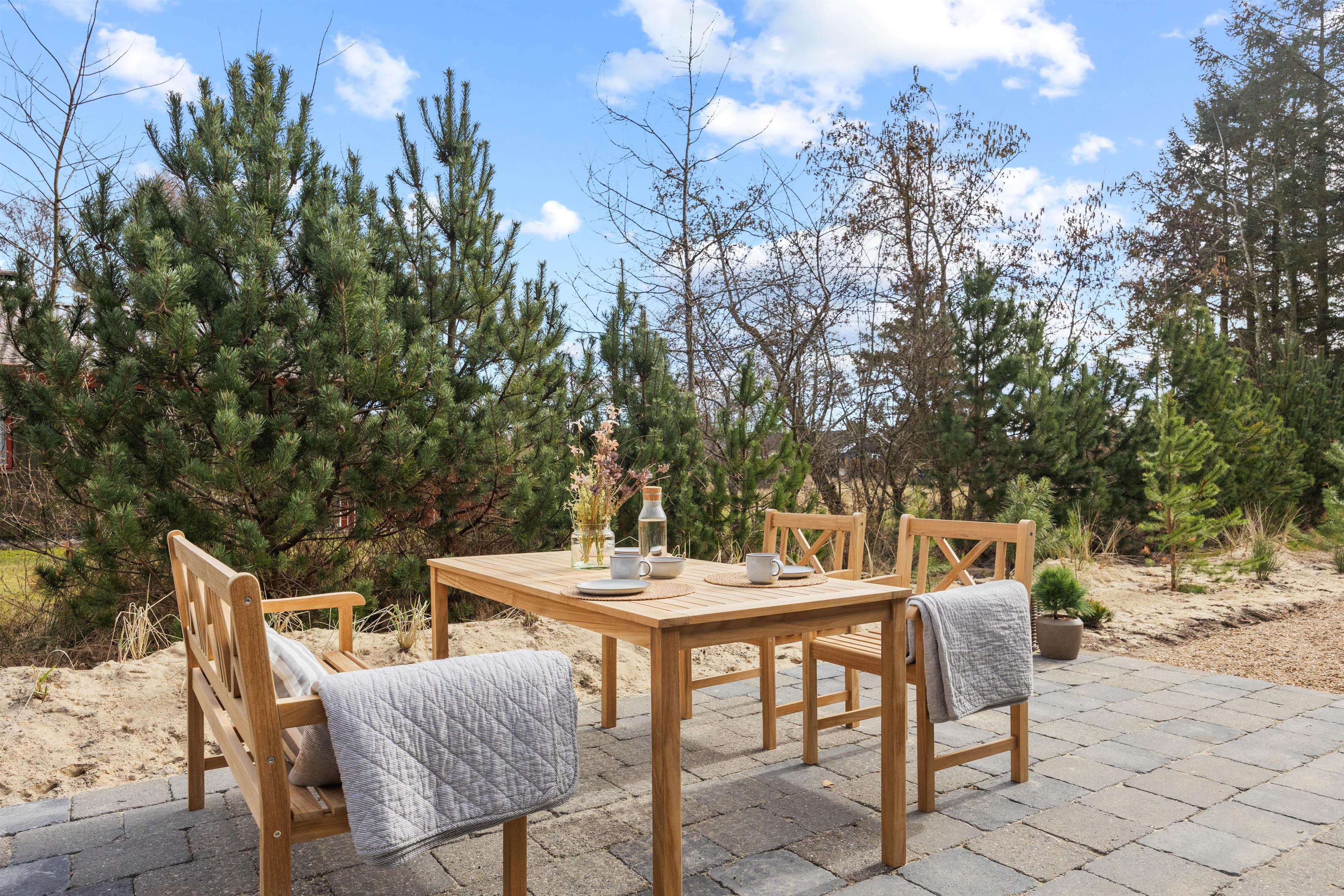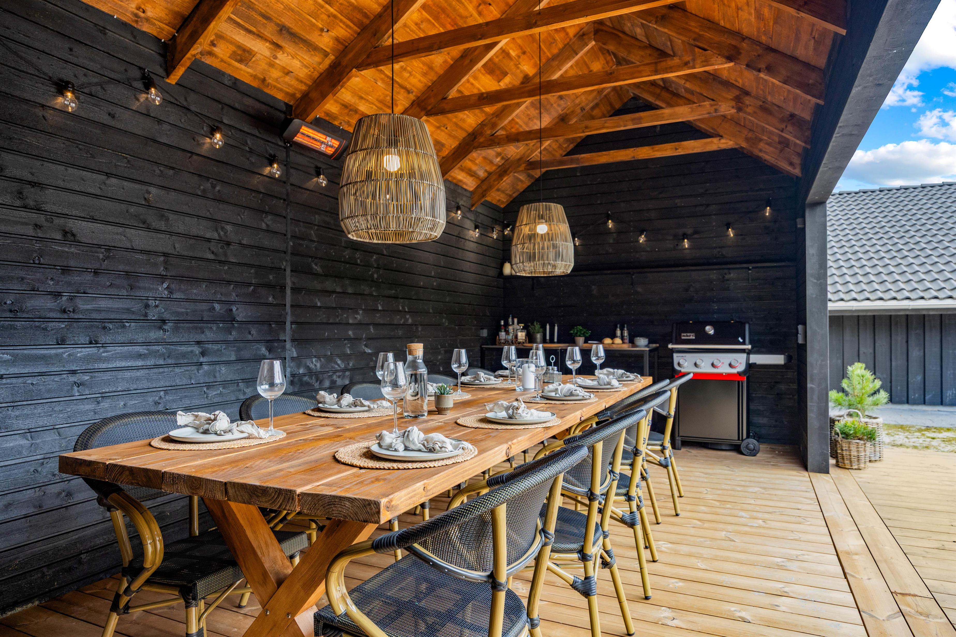 Den overdækkede terrasse på 23 m² med terrassevarmer gør det muligt at nyde lange aftener under åben himmel – selv når duggen falder. Her er også et praktisk udekøkken og en gasgrill, klar til at skabe lækre grillmiddage uden besvær. Når solen skinner, står liggestolene klar til ren afslapning, og den udendørs bruser giver sommerhusferien den helt rigtige luksusfornemmelse.