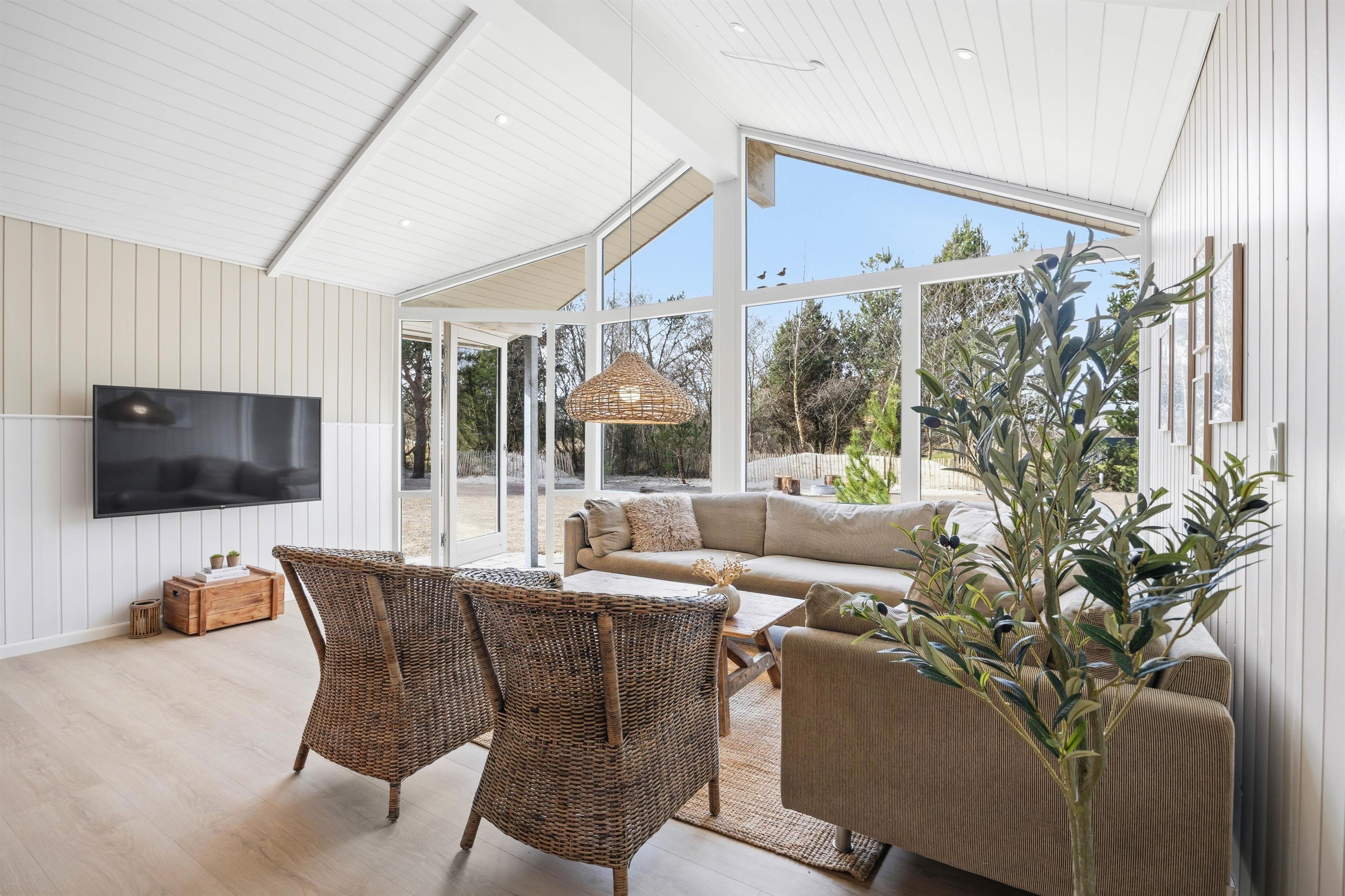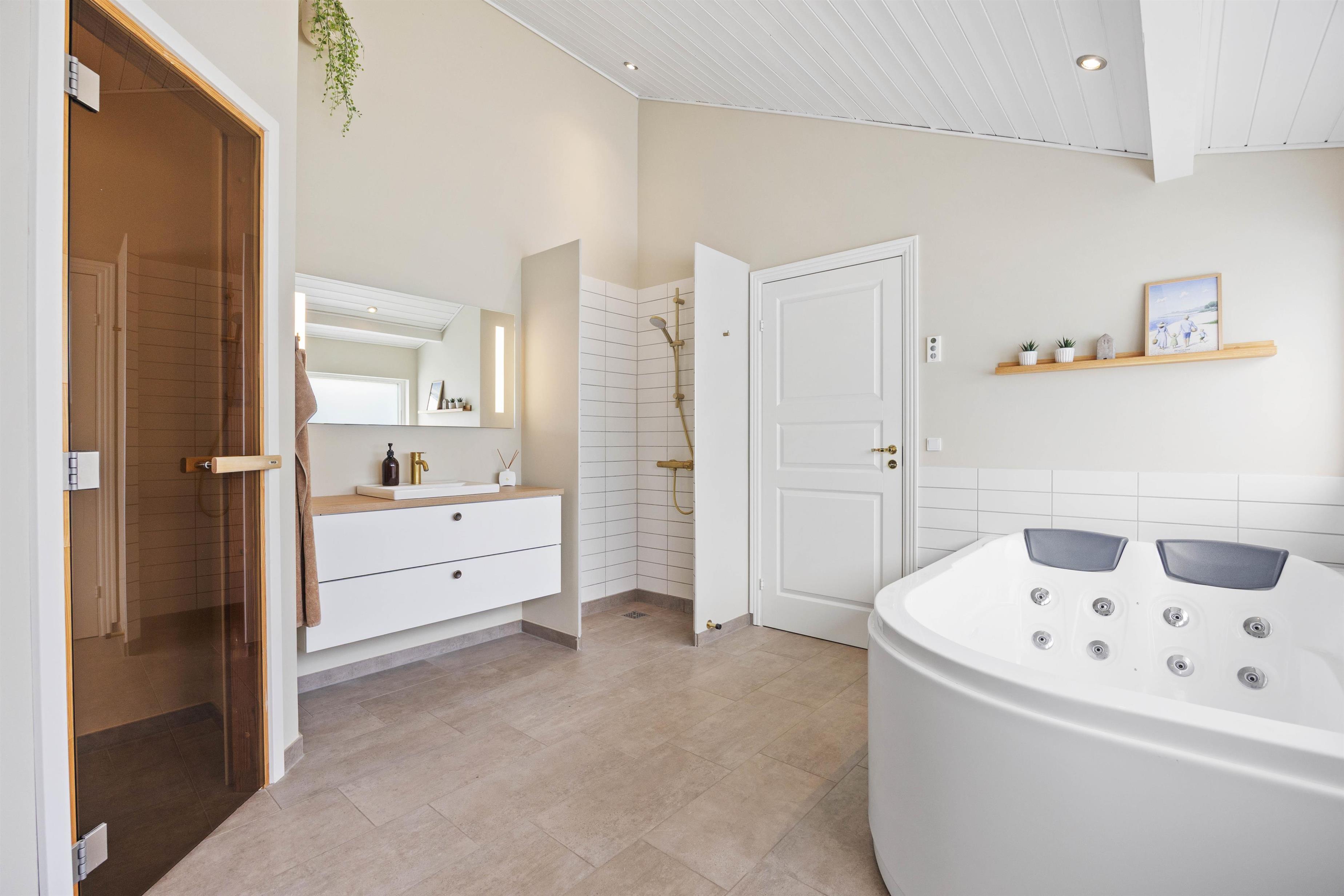 Huset byder på hele tre flotte badeværelser, hvoraf det ene er en del af den helt nye poolafdeling. I det største kan I forkæle jer selv ekstra med både 2-personers spa og sauna – ren luksus efter en dag ved stranden.