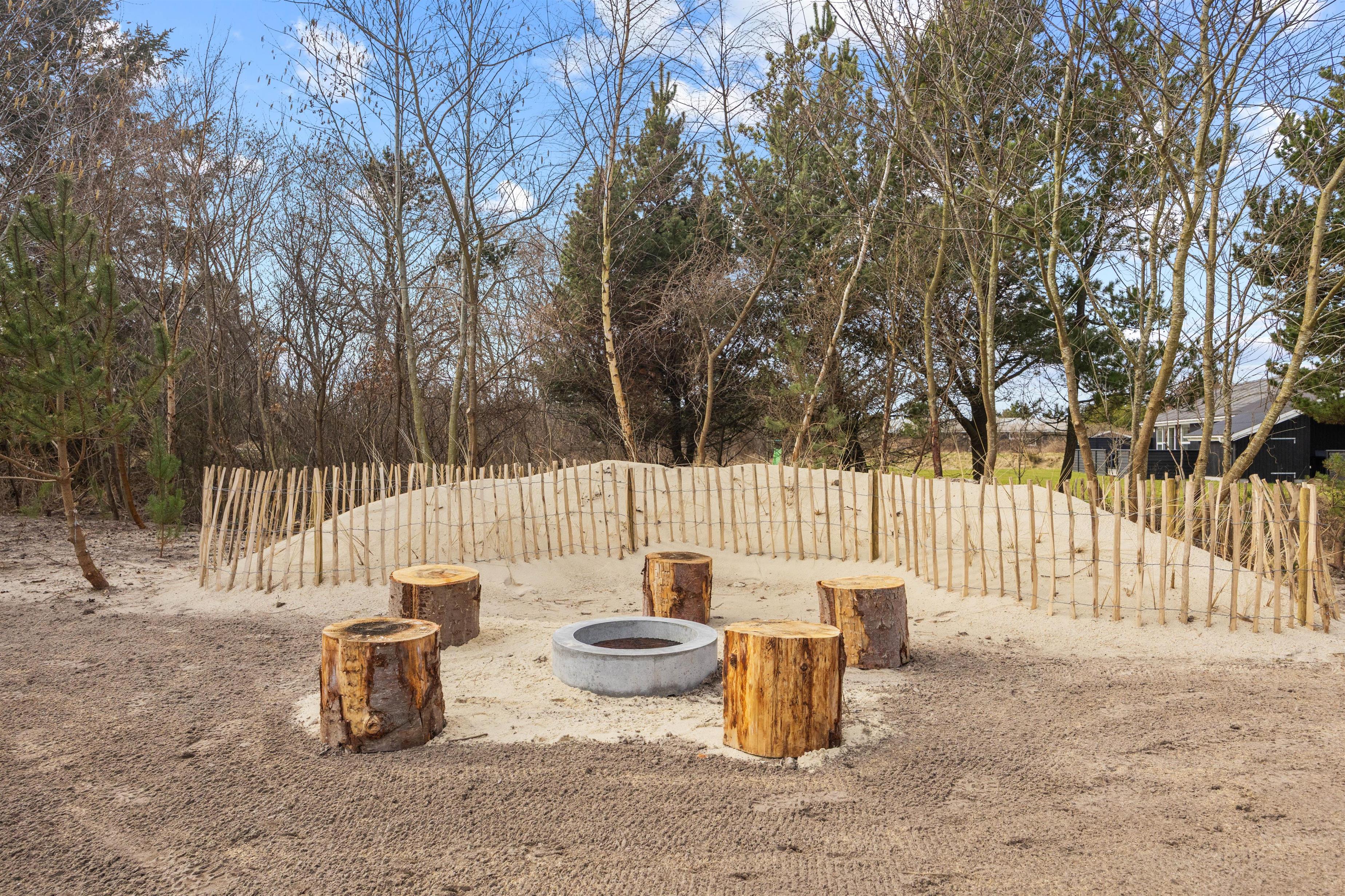 Den store, ugenerte naturgrund på 2379 m2 med masser af fyrtræer byder på masser af plads til leg og liv: fodboldmål, sandkasse, bålplads, klatretårn, rutsjebane og gynger – et paradis for familiens yngste.