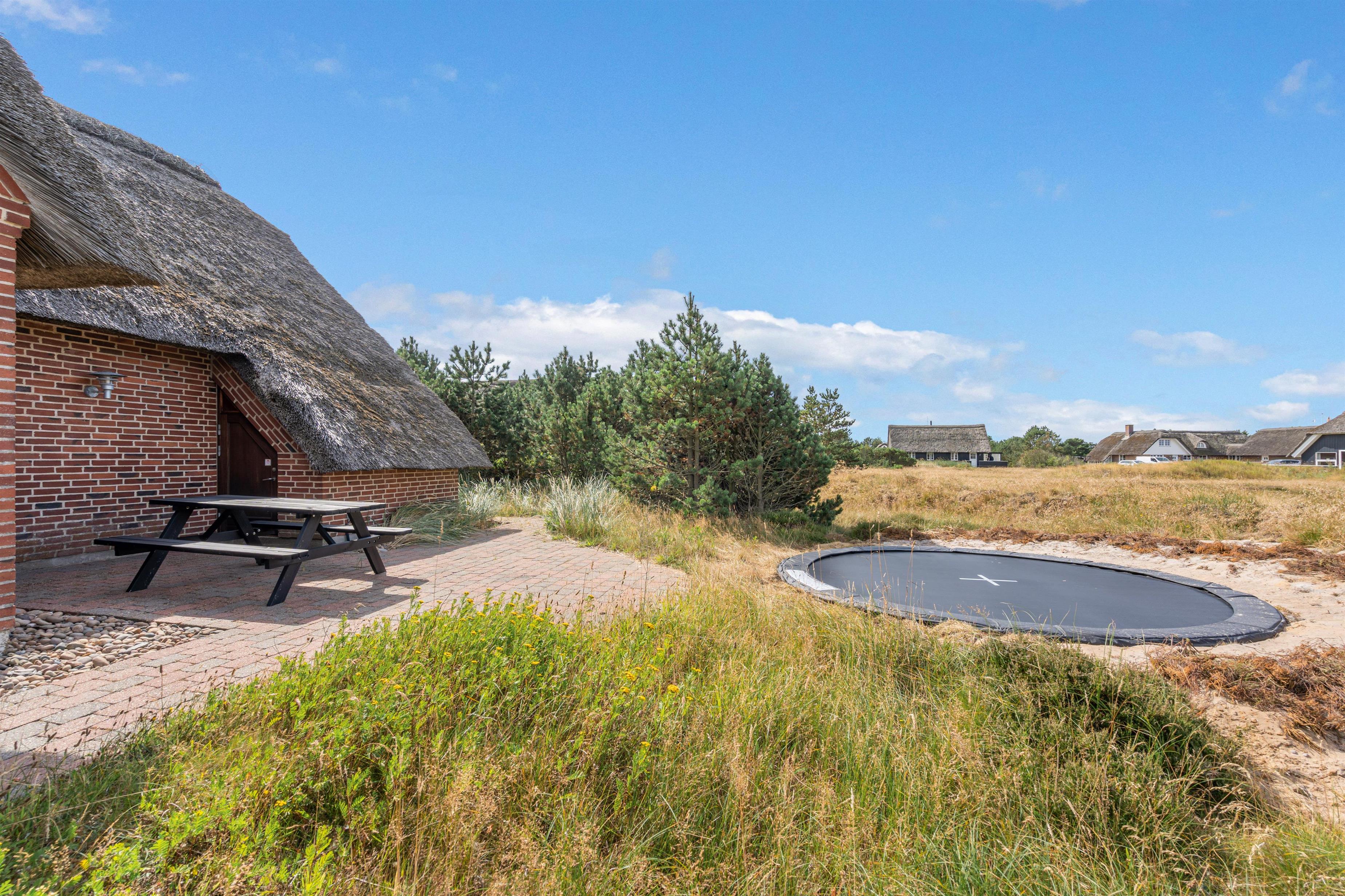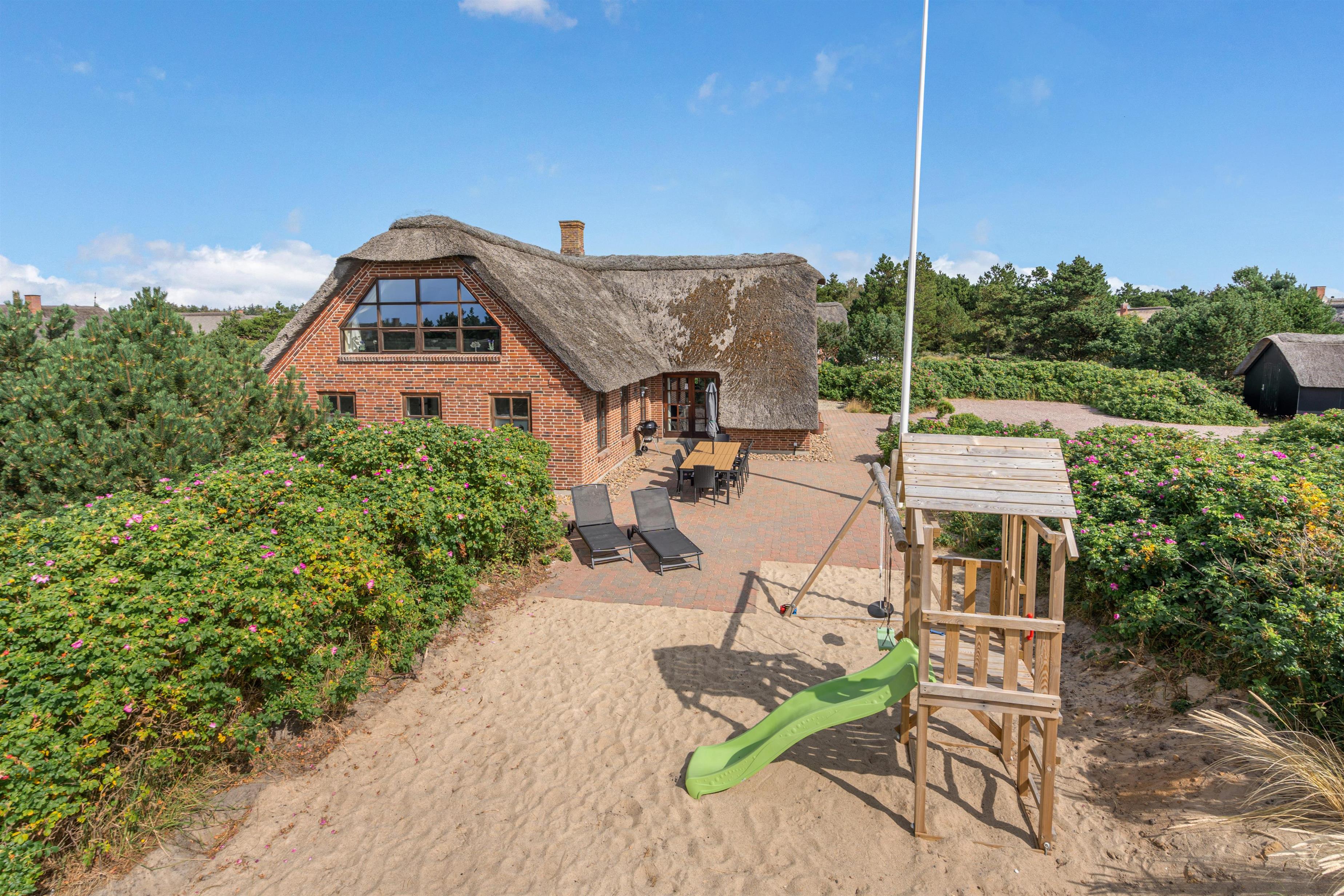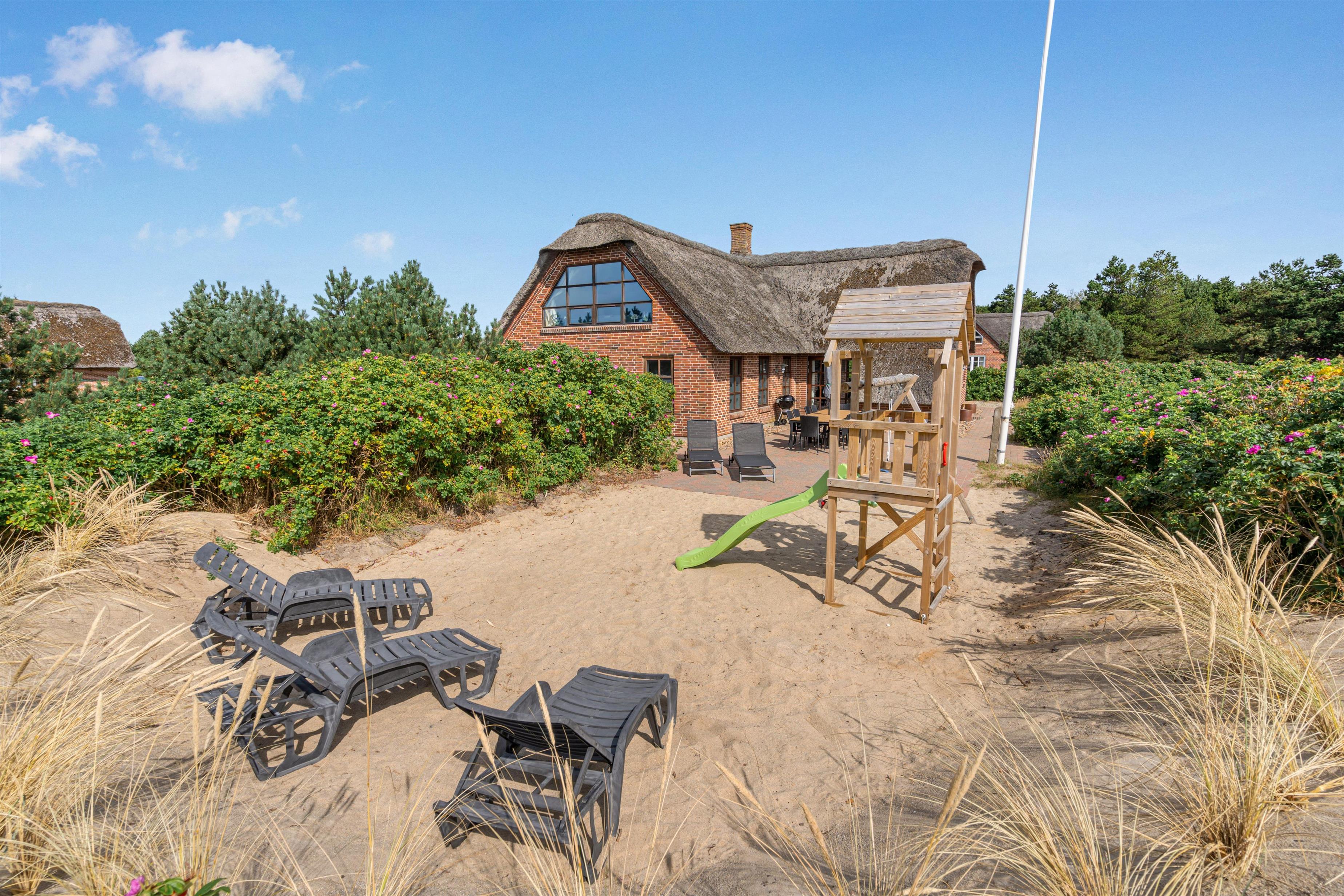 Der er selvfølgelig også tænkt på feriens yngste gæster. Til børnene er der et stort, lækkert sandområde med legetårn og gynger samt en trampolin bag feriehuset, hvor de kan tilbringe mange timer med leg.