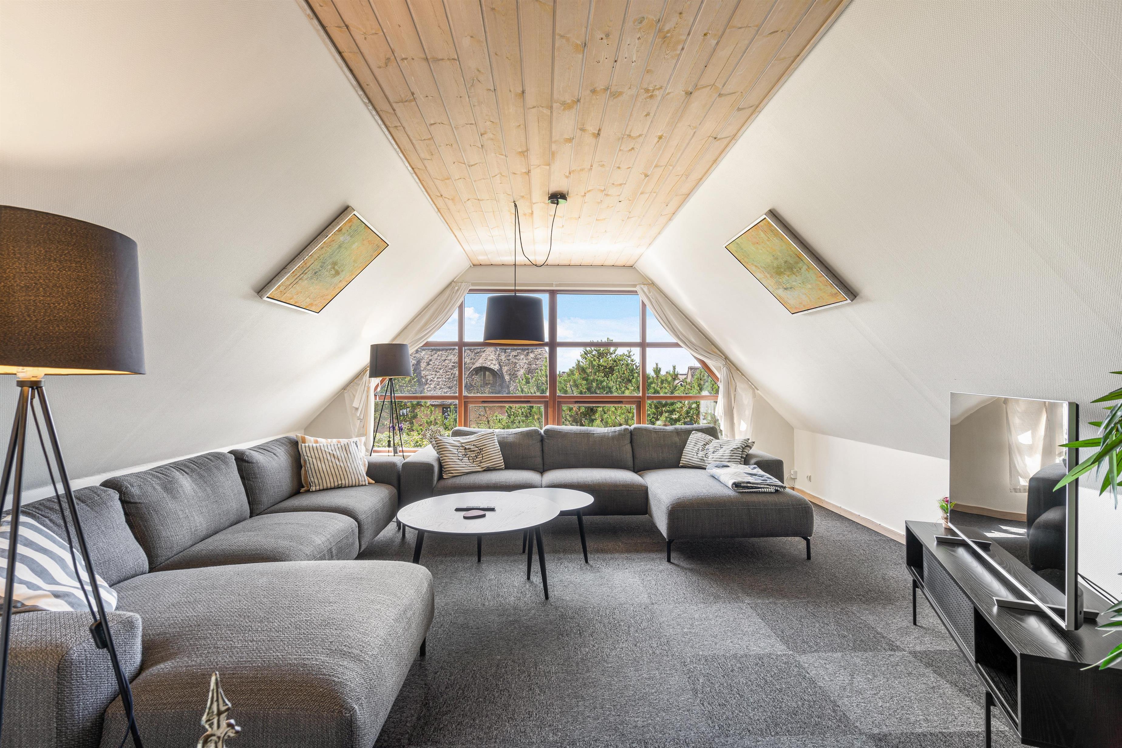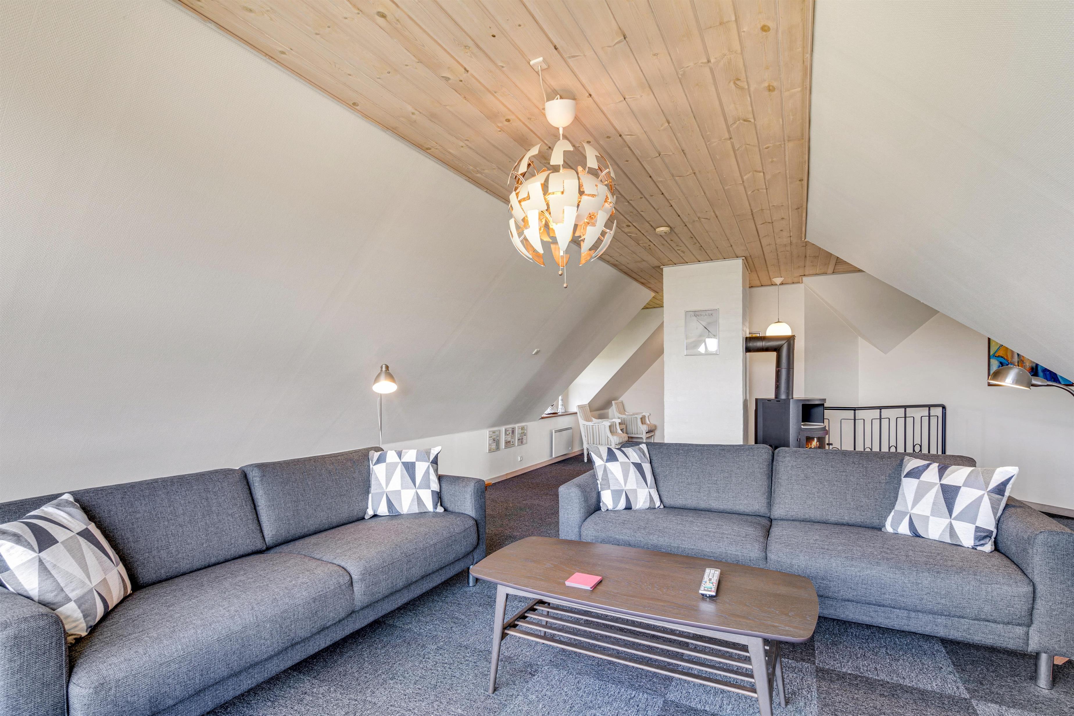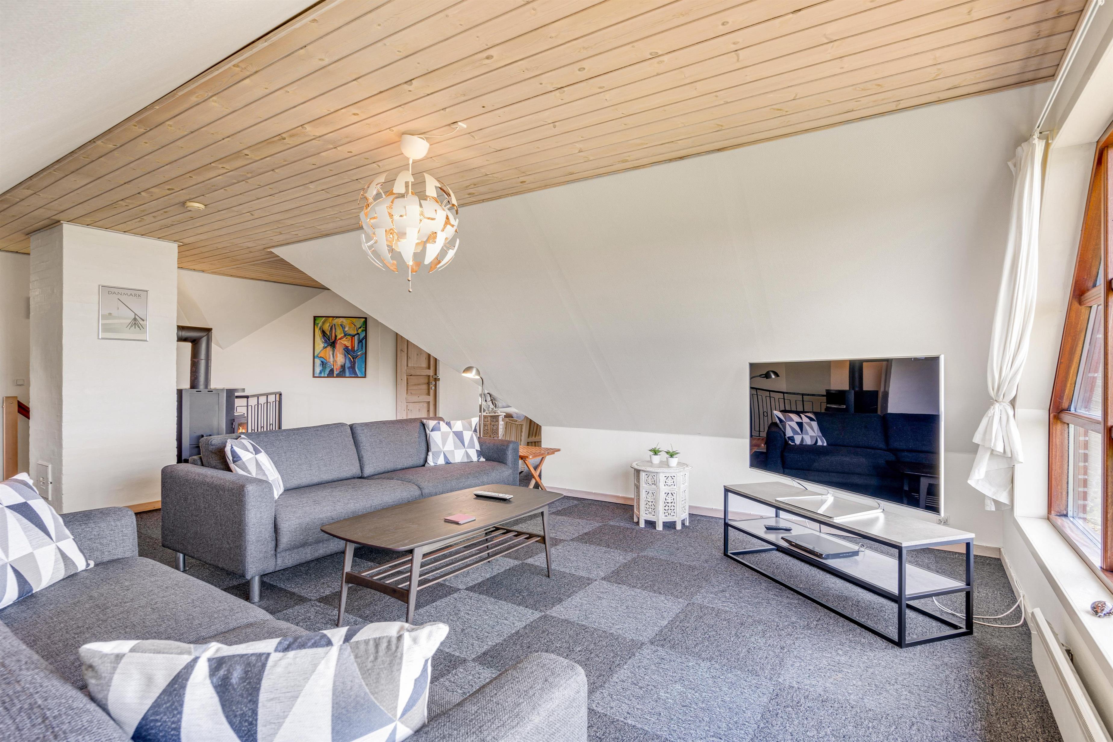 I kan også tilbringe hyggelige feriestunder på sommerhusets førstesal, hvor der venter jer en stor vinkelstue, der har en smuk udsigt over sommerhusetområdet samt en flot udsigt mod Blåvand Fyr. Her kan I også nyde solnedgangen i fyrtårnets skær om aftenen.