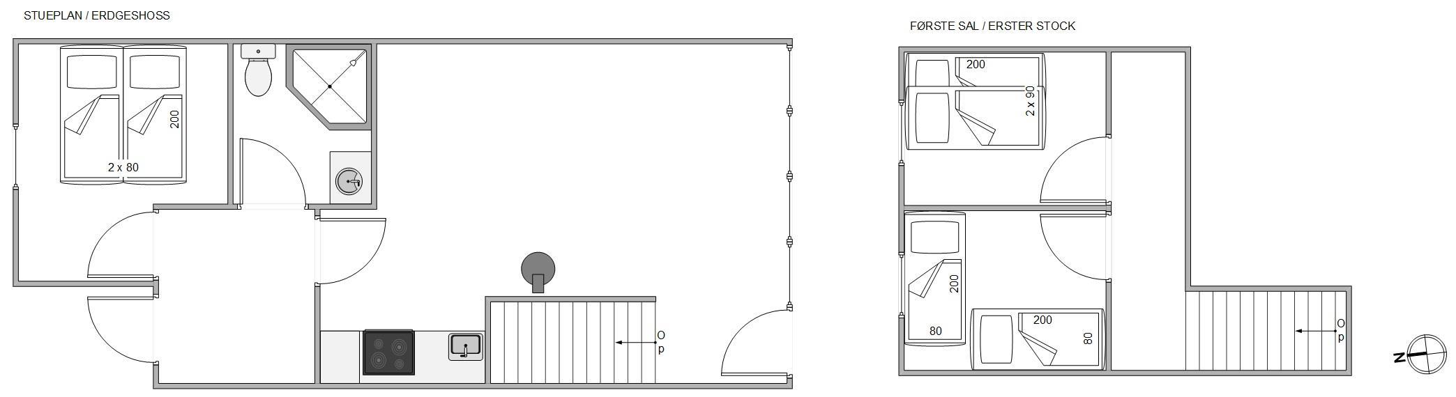 Når mørket falder på og øjnene i, kan I fordele jer rundt på de tre soveværelser. I stueetagen ligger det store værelse med dobbeltseng, 180x200, mens de to andre værelser er at finde på førstesalen. Det ene har en stor enkeltseng, 120x200, mens det tredje værelse med køjeseng vil blive et hit for familiens mindste. Køjesengen måler 2x70x190.