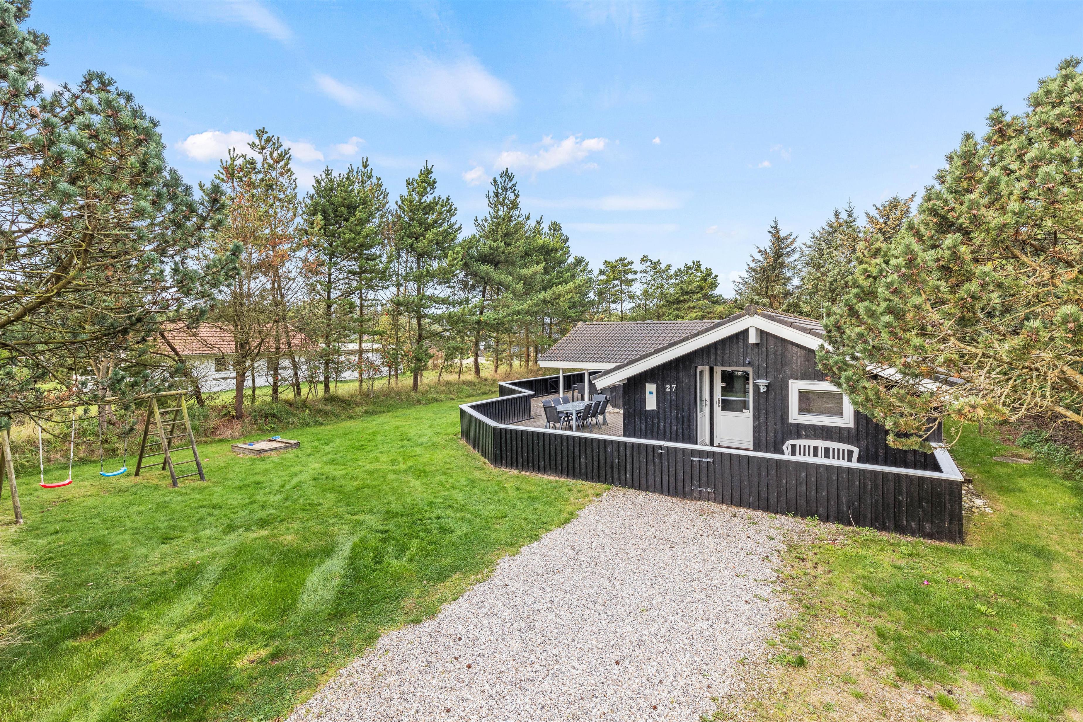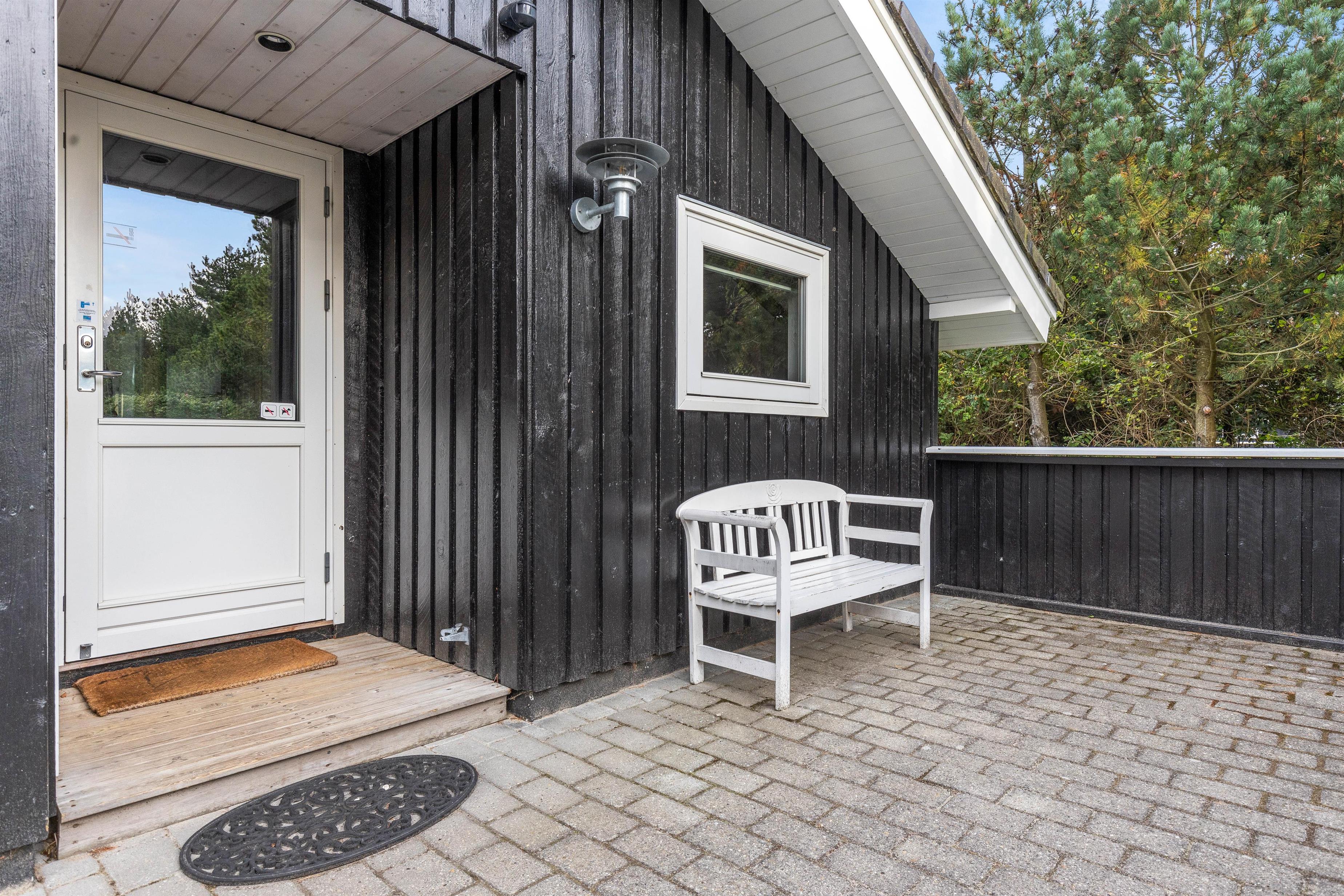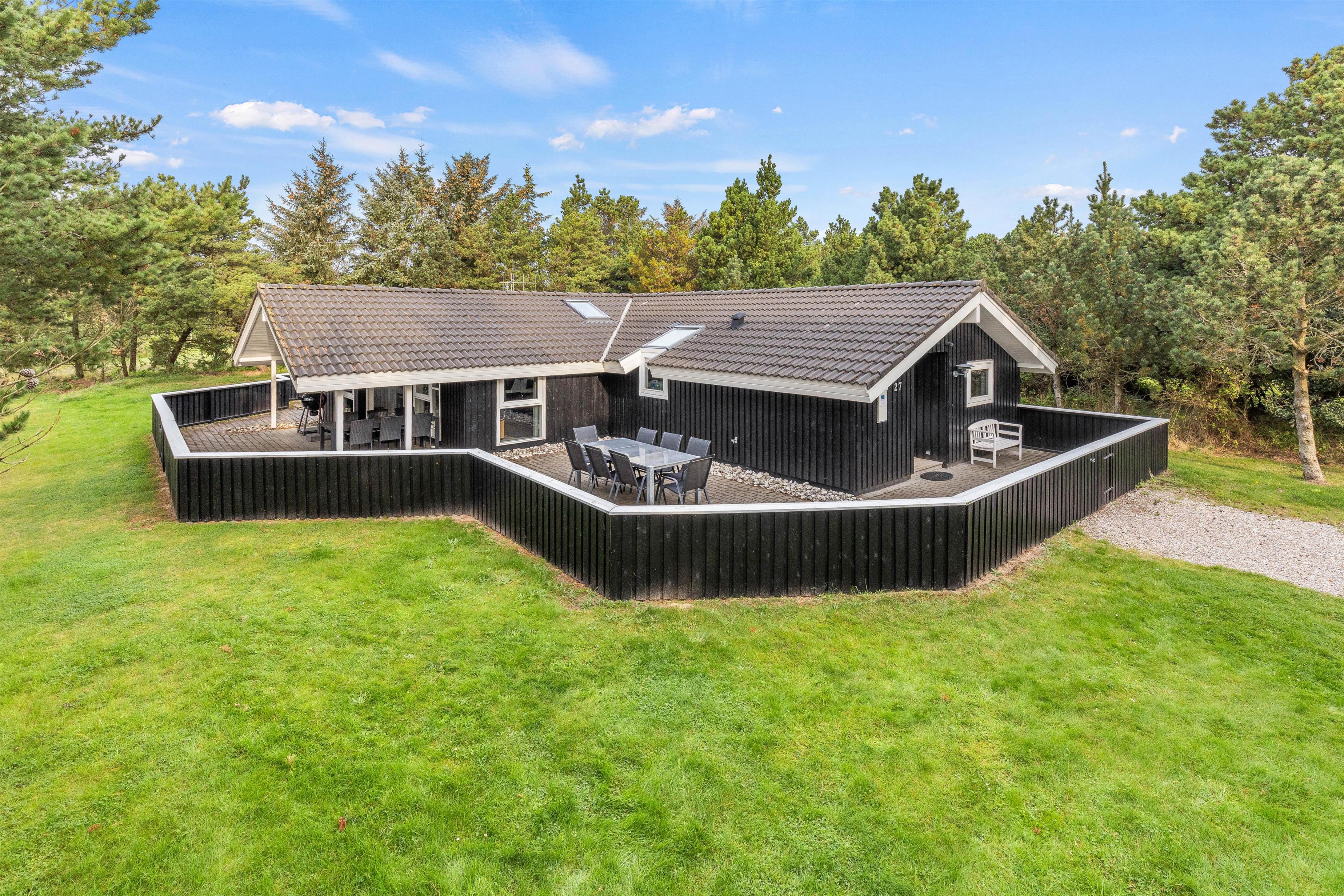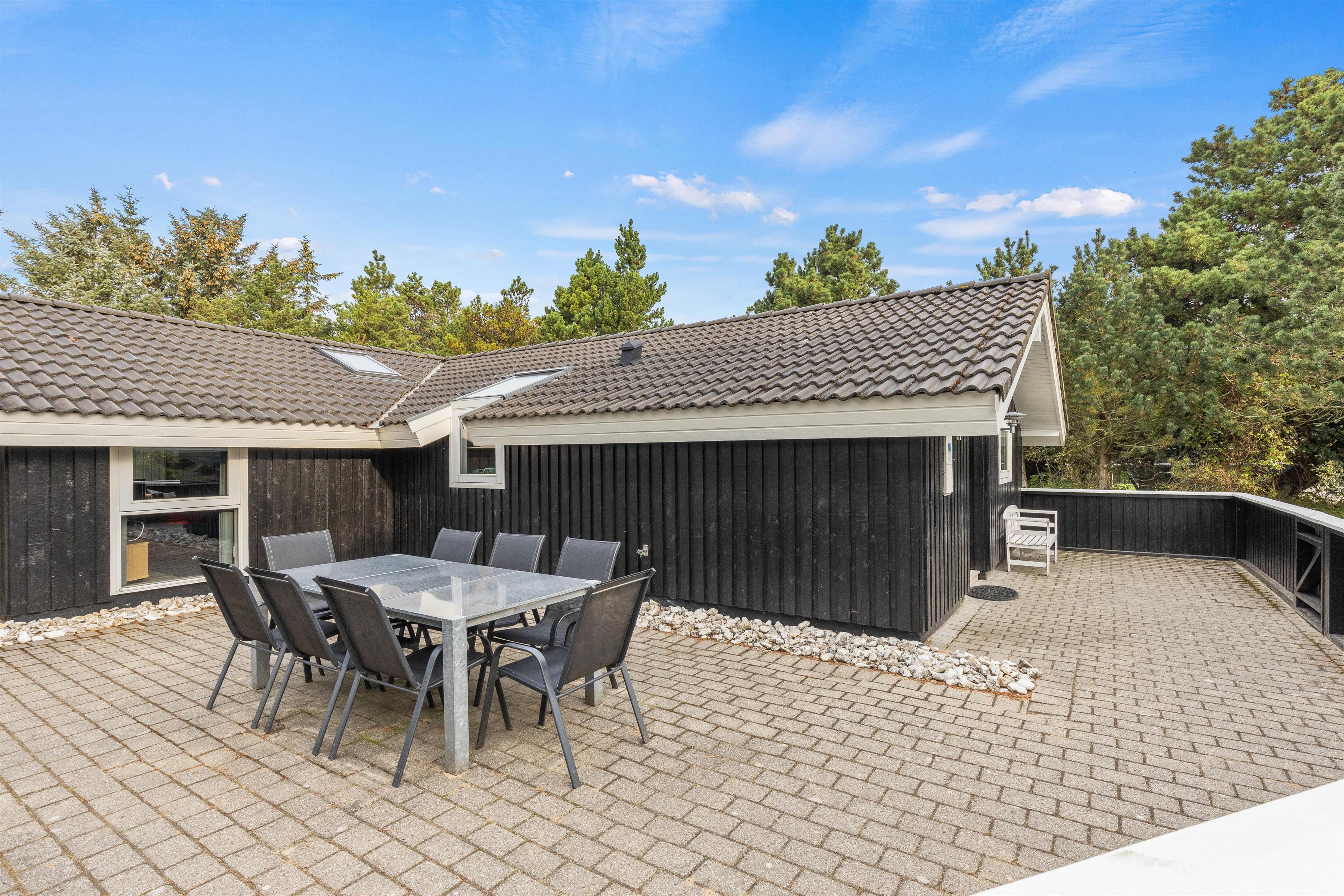 Rundt om feriehuset går en stor, lukket terrasse, der også har et overdækket stykke. I kan altså både sidde i skyggen med en kold drink eller slænge jer i liggestolene ude i solen på de varme sommerdage. Børnene vil elske den store græsplæne, hvor der kan spilles bold, vikingespil og leges på gyngestativet og i sandkassen.