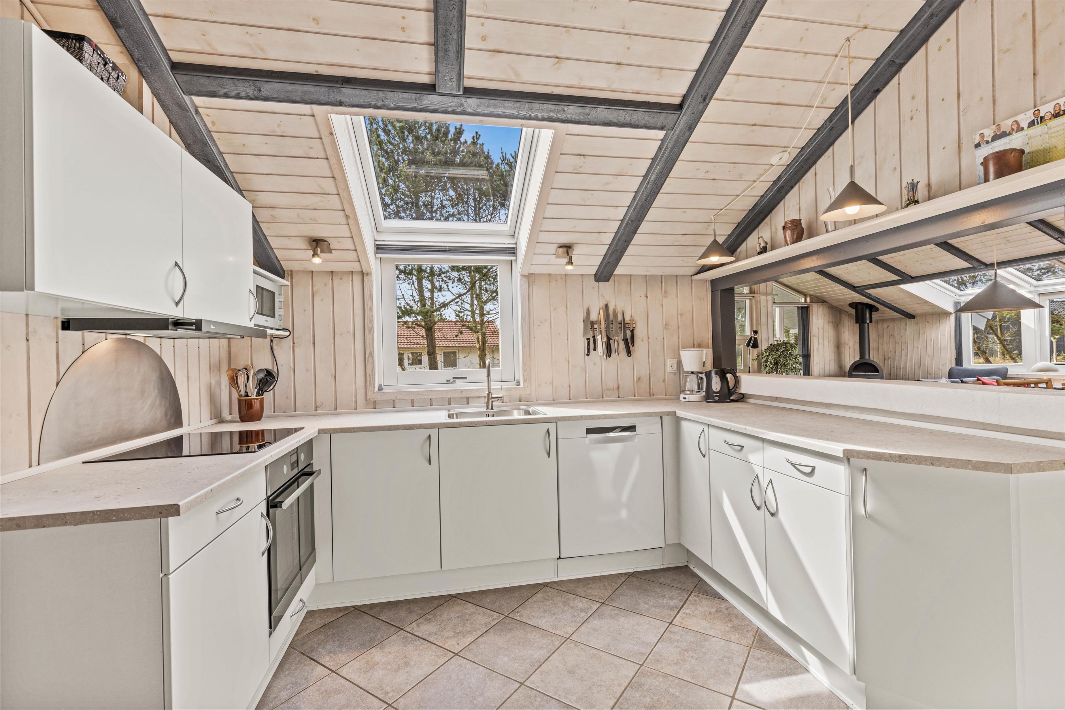 Det skønne træsommerhus i Blåvand råder over hele velindrettede 146 kvadratmeter og har plads til op til 8 personer. De mørke loftsbjælker står i kontrast til de lyse trævægge og -lofter, og sammen med det behagelige møblement og de små detaljer, skabes der en hyggelig og hjemlig stemning i hele huset.