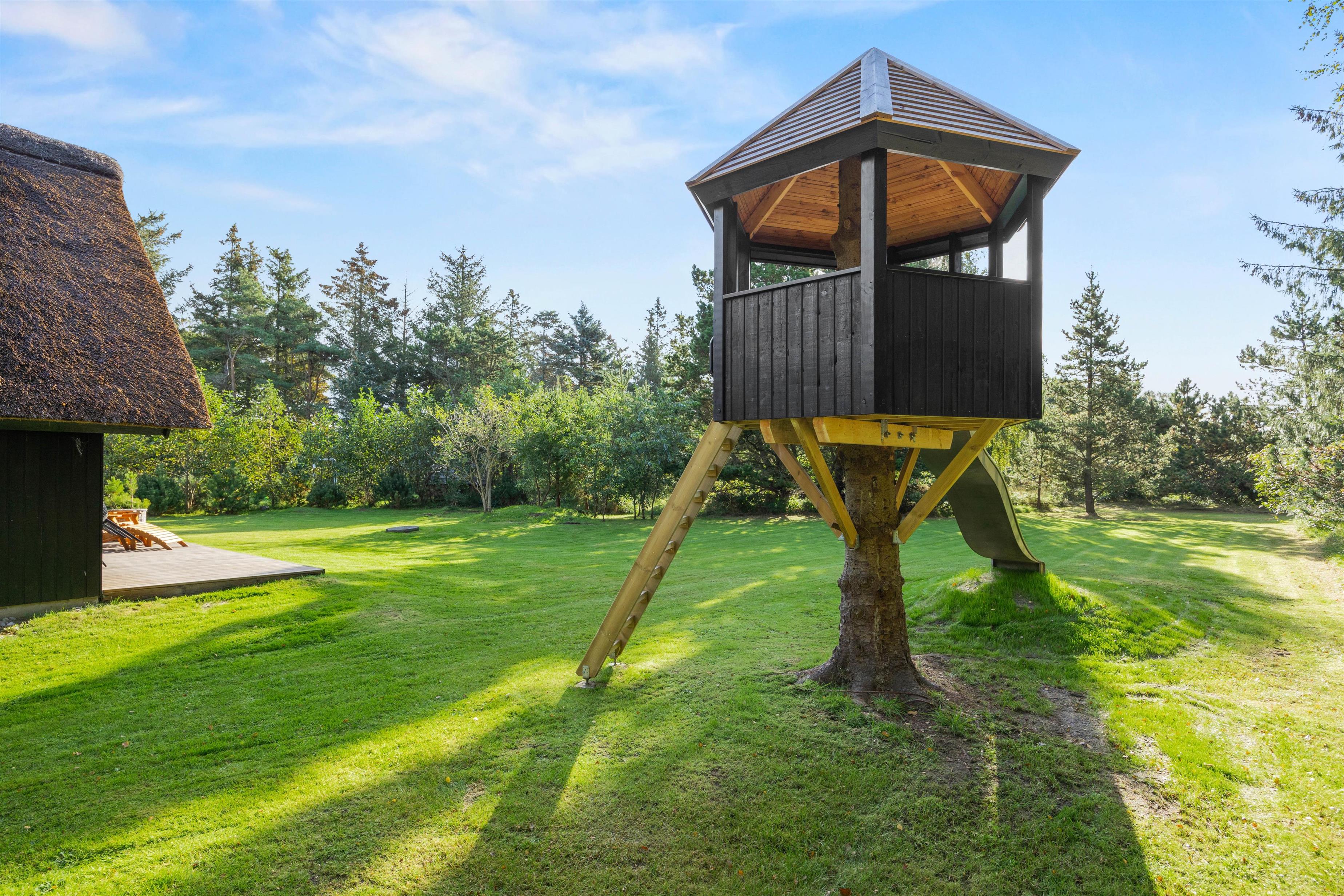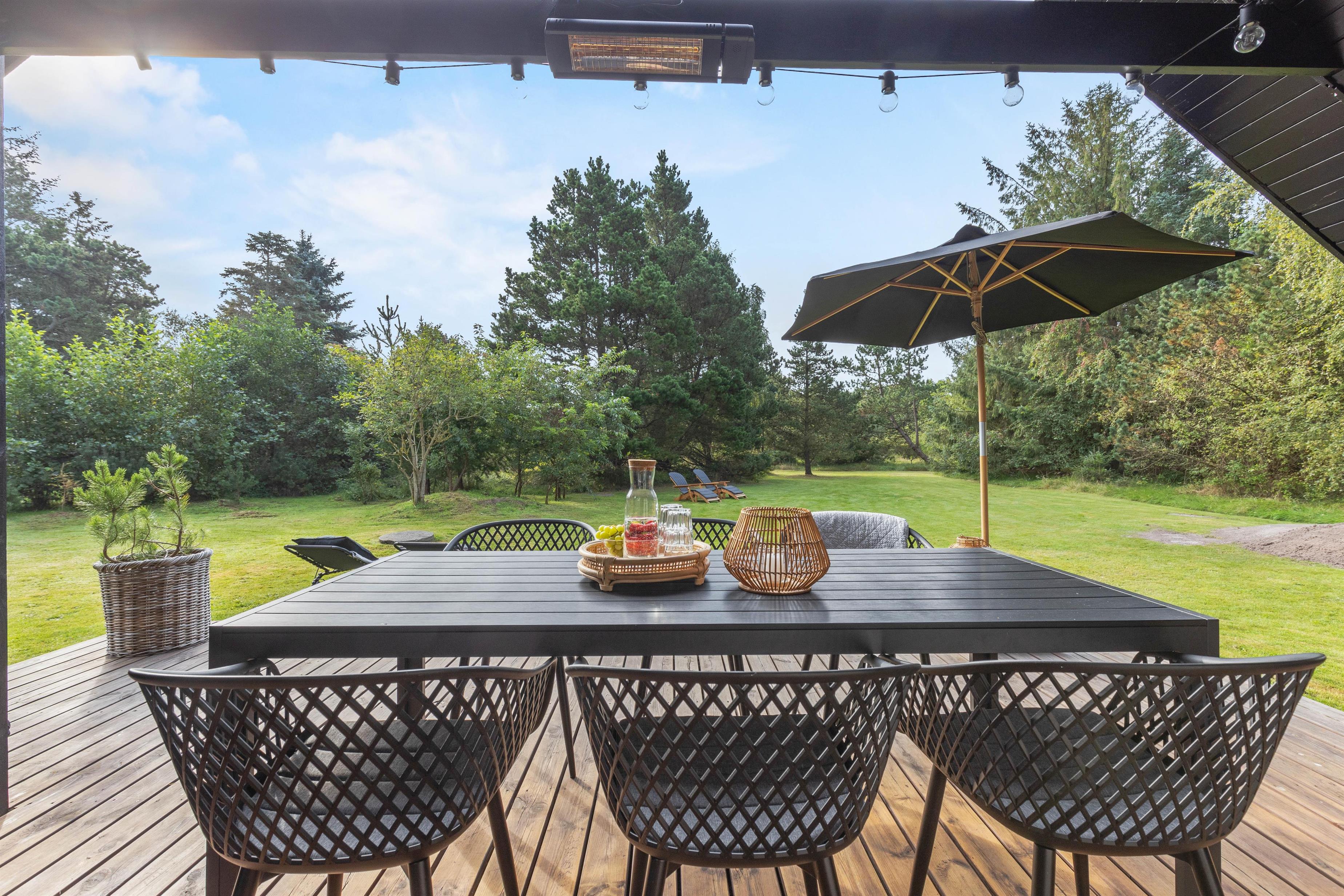 Den 2831 m2 store grund er udlagt både som naturgrund og græsplæne. Der er god plads til at børnene kan lege og gå på opdagelse, og fra terrassen kan I sidde ugenert og nyde ferien i de gode havemøbler. Terrassen er delvist overdækket, og der er god plads til at nyde et godt måltid fra gasgrillen og måske et glas vin, mens aftenen falder på.