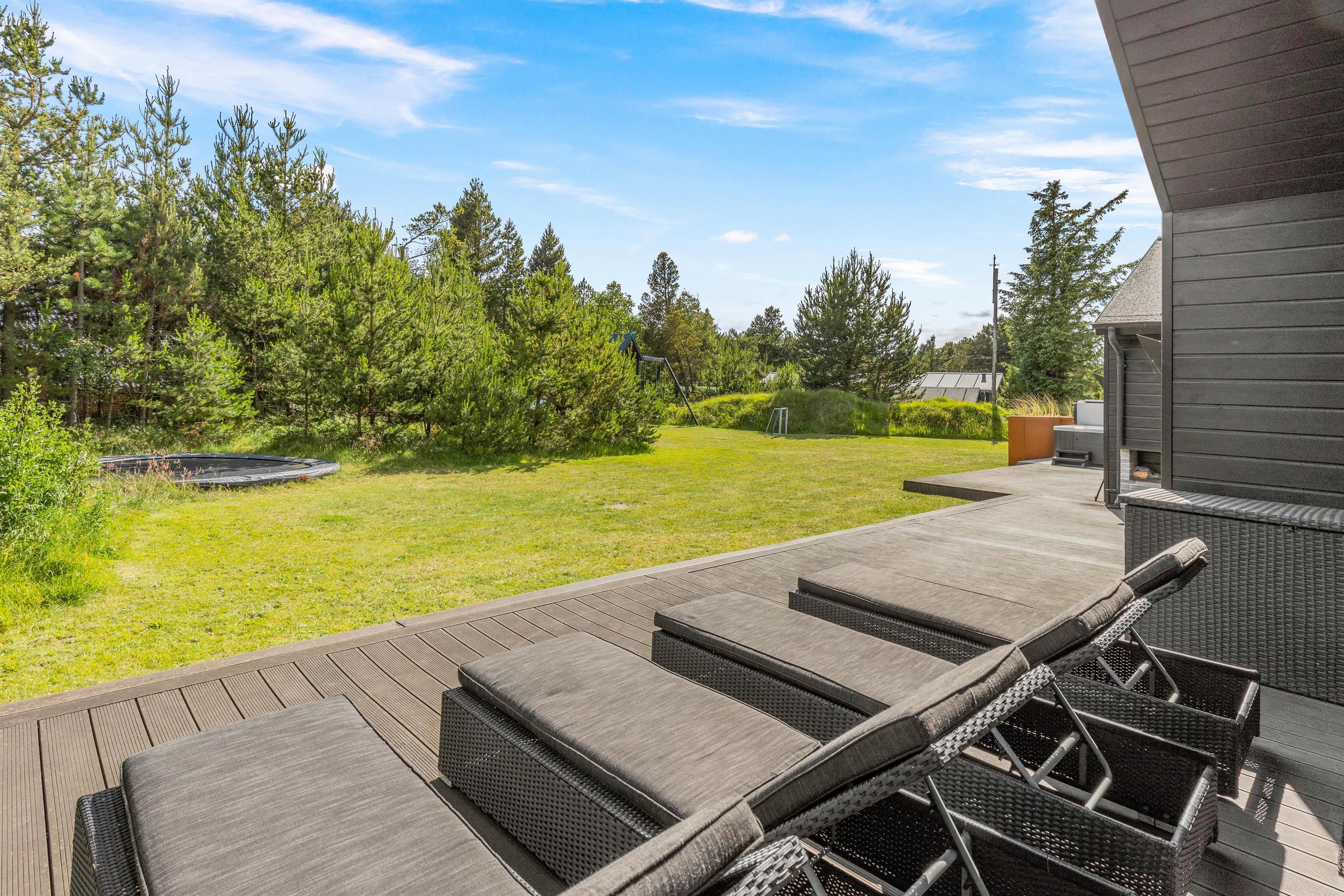 Det store feriehus råder over en tilsvarende stor terrasse, hvor der er flere fine kroge med havemøbler og liggestole. Dele af terrassen med et langt spisebord og gasgrill er tilmed overdækket så I kan nyde naturen og den friske luft selv på regnfulde dage. Som ekstra luksus er der opsat varmelamper på terrassen, så I kan nyde aftenen lidt længere. På den åbne del af terrassen kan I nyde et bad i udendørsspaen og se på stjerner en klar aften. Udebruseren kan benyttes fra 1. april til 31. oktober.