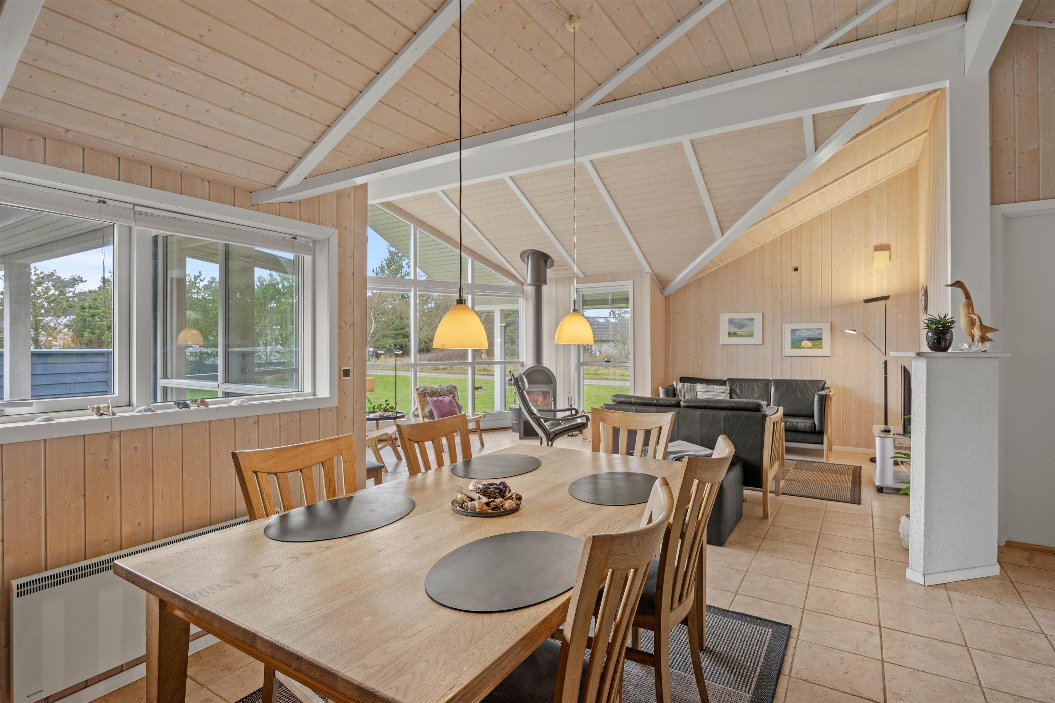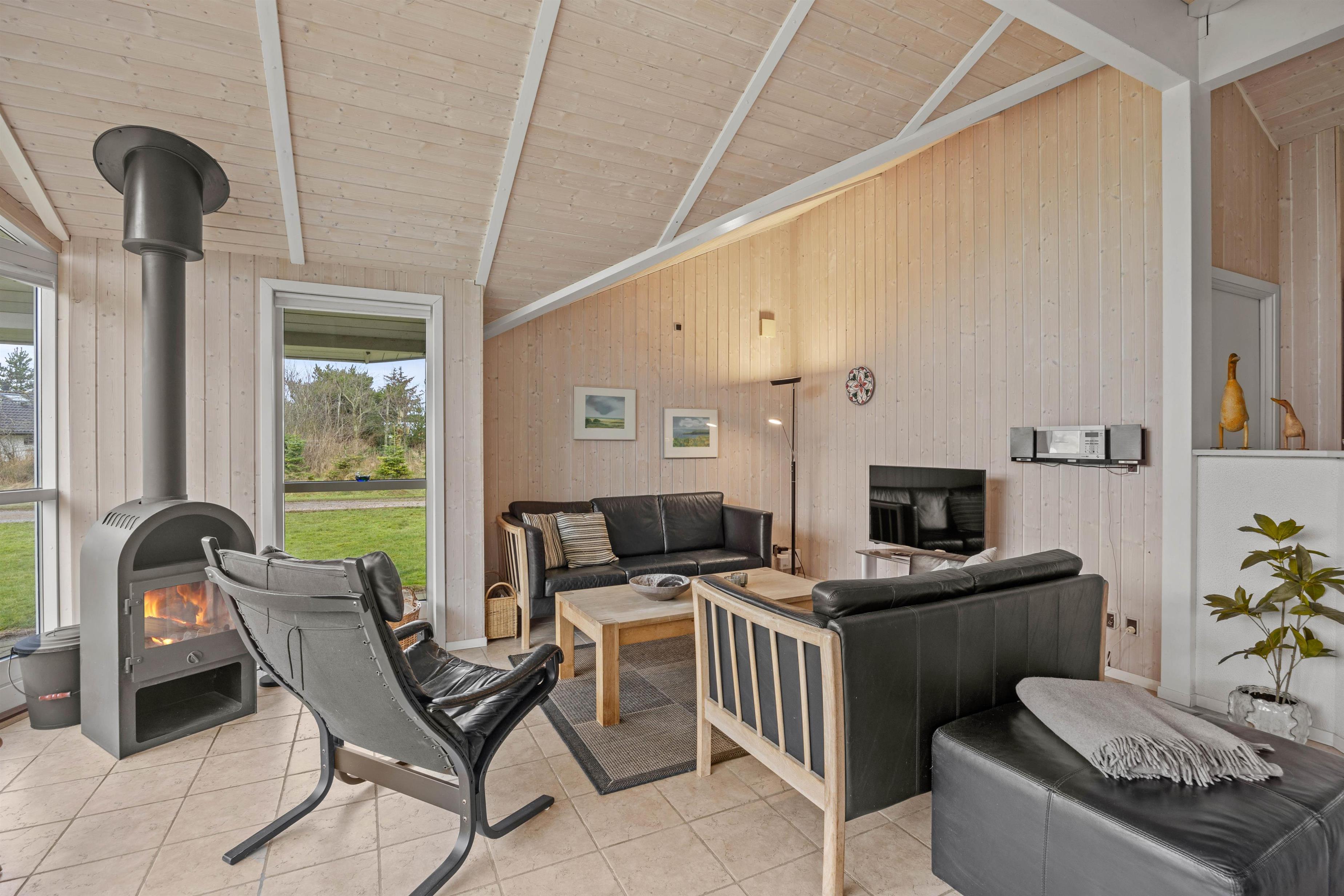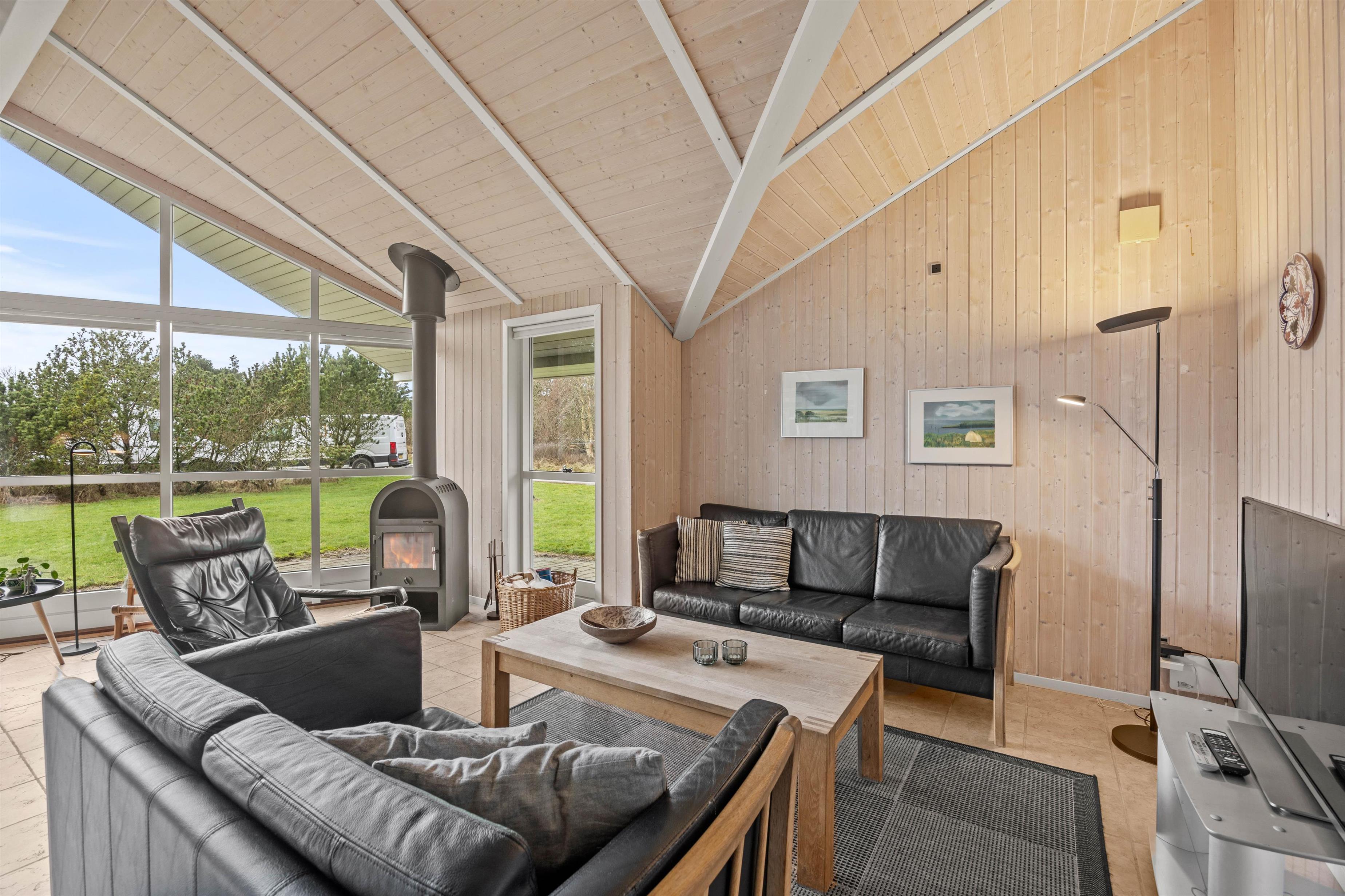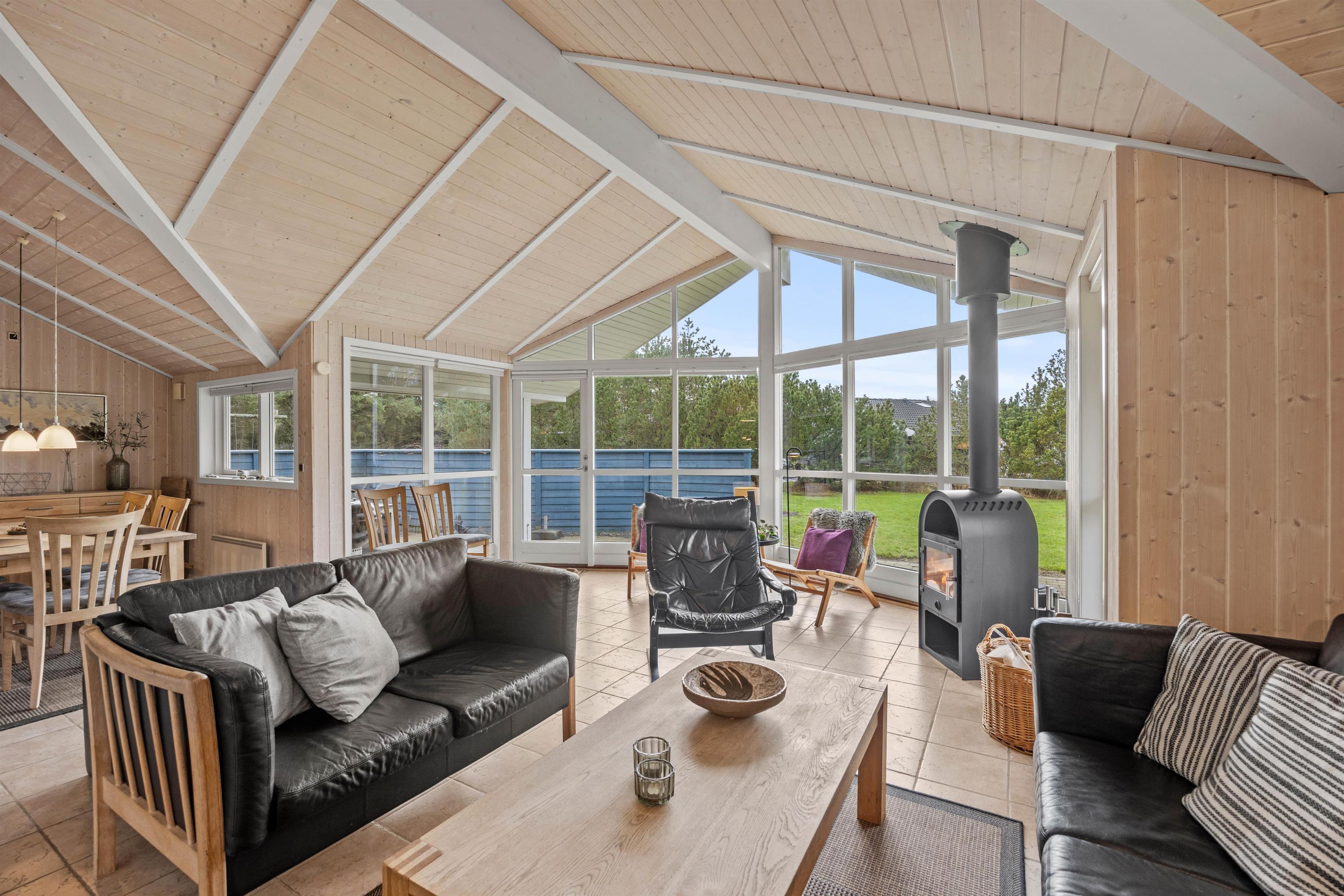 Den store stue er udstyret med store vinduesfronter, som inviterer solens lys og den smukke natur indenfor. På regnvejrsdage kan I nyde udsigten fra sofaen.