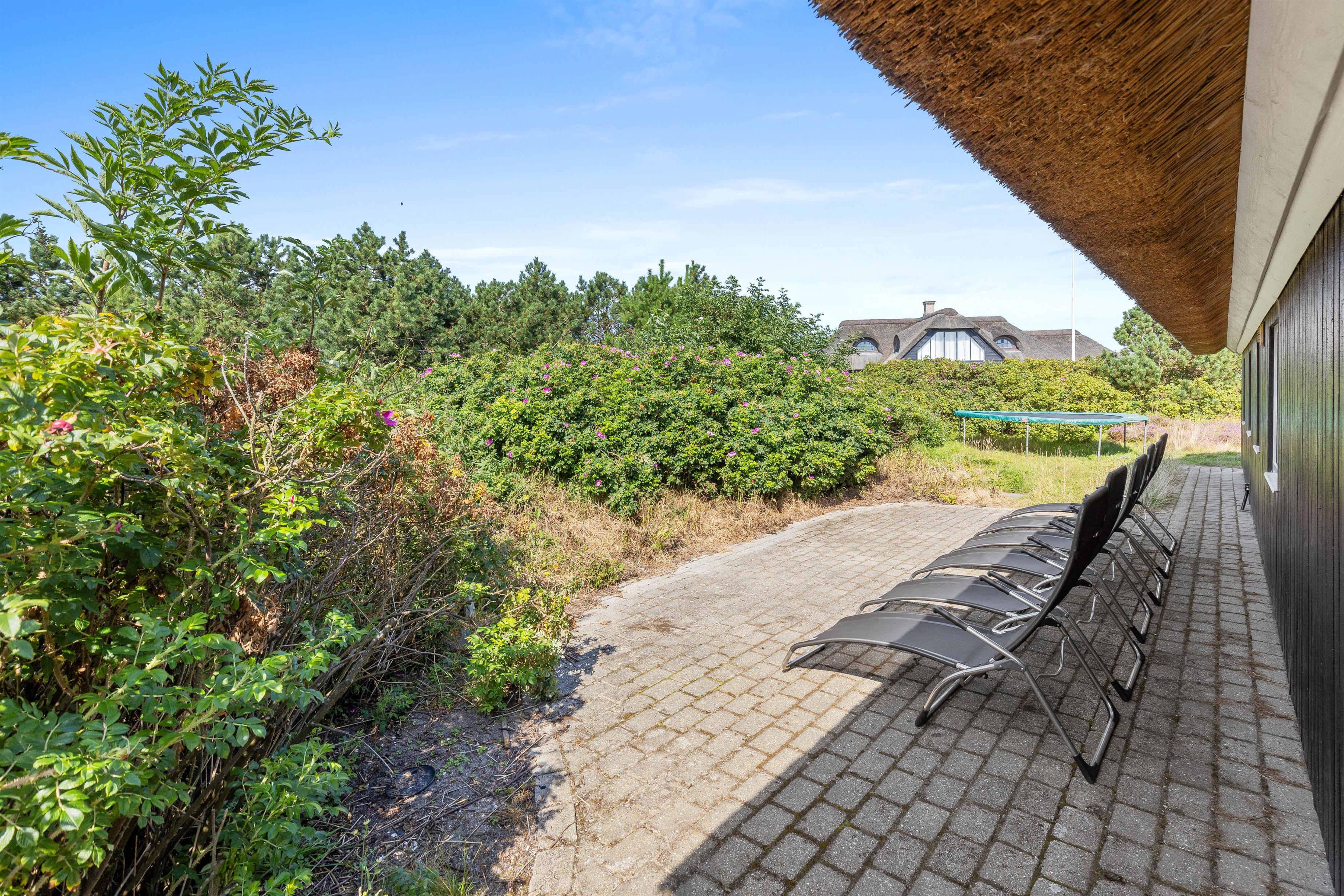 Stor terrasse med hyggelige siddekroge, legetårn og trampolin, kun 250m til stranden