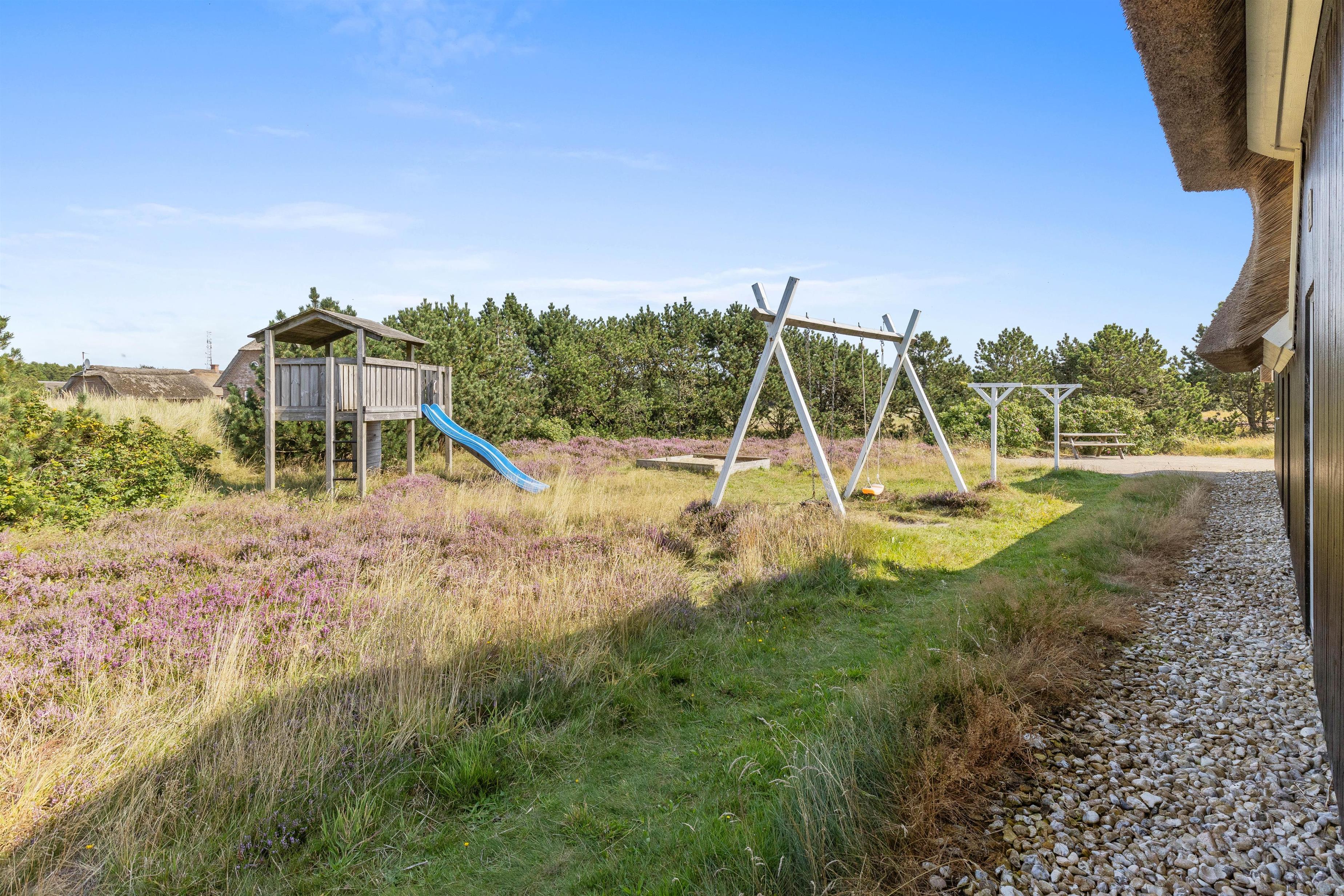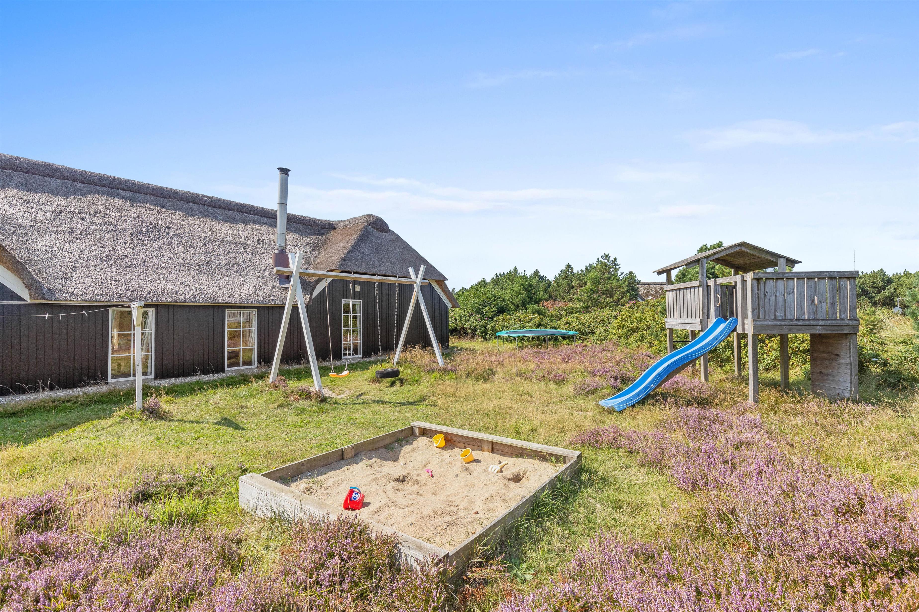 På den ene side af feriehuset er der desuden lavet en lille have med græsplæne, hvor der både er legetårn, trampolin, gyngestativ og sandkasse; et sikkert hit hos børnene!