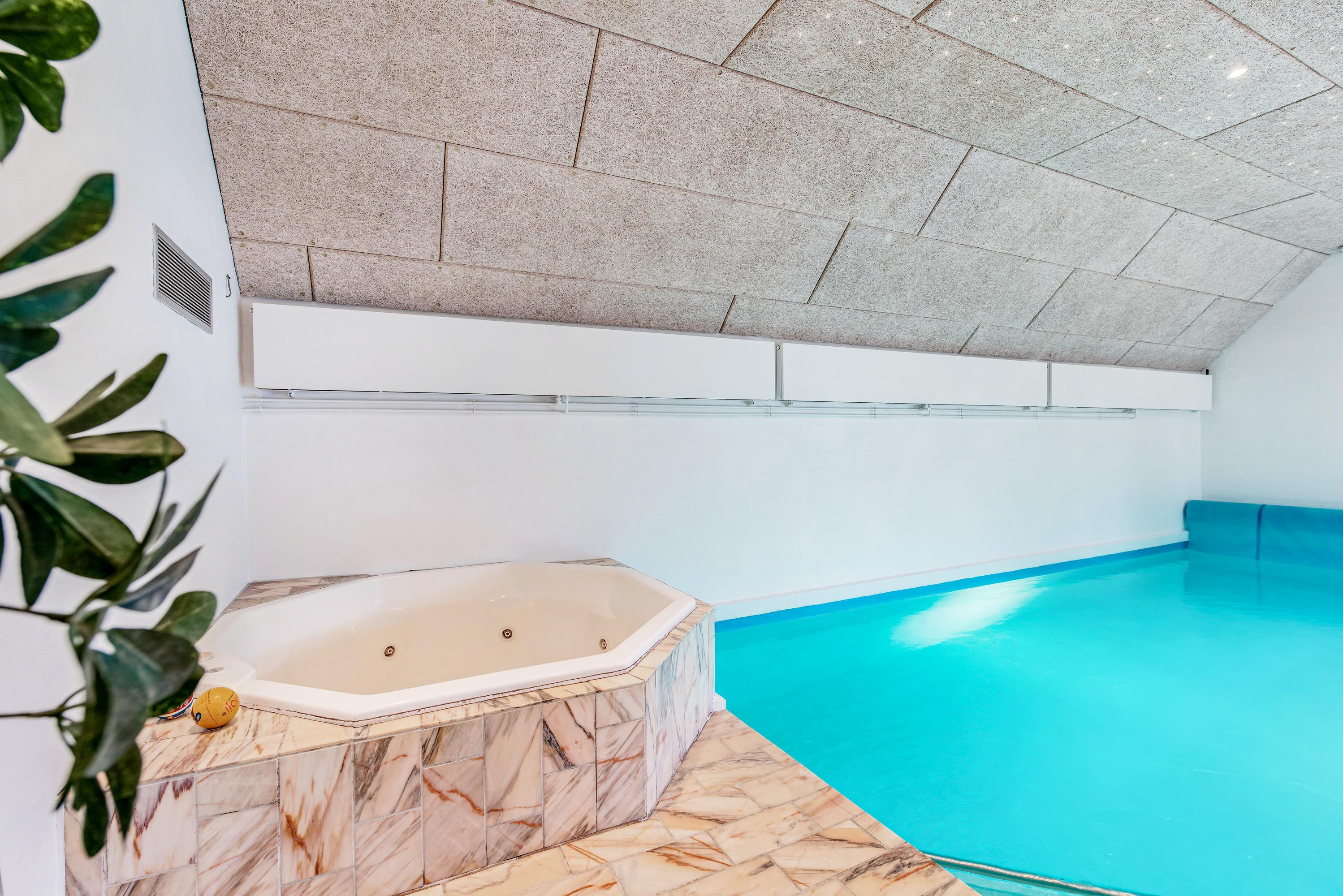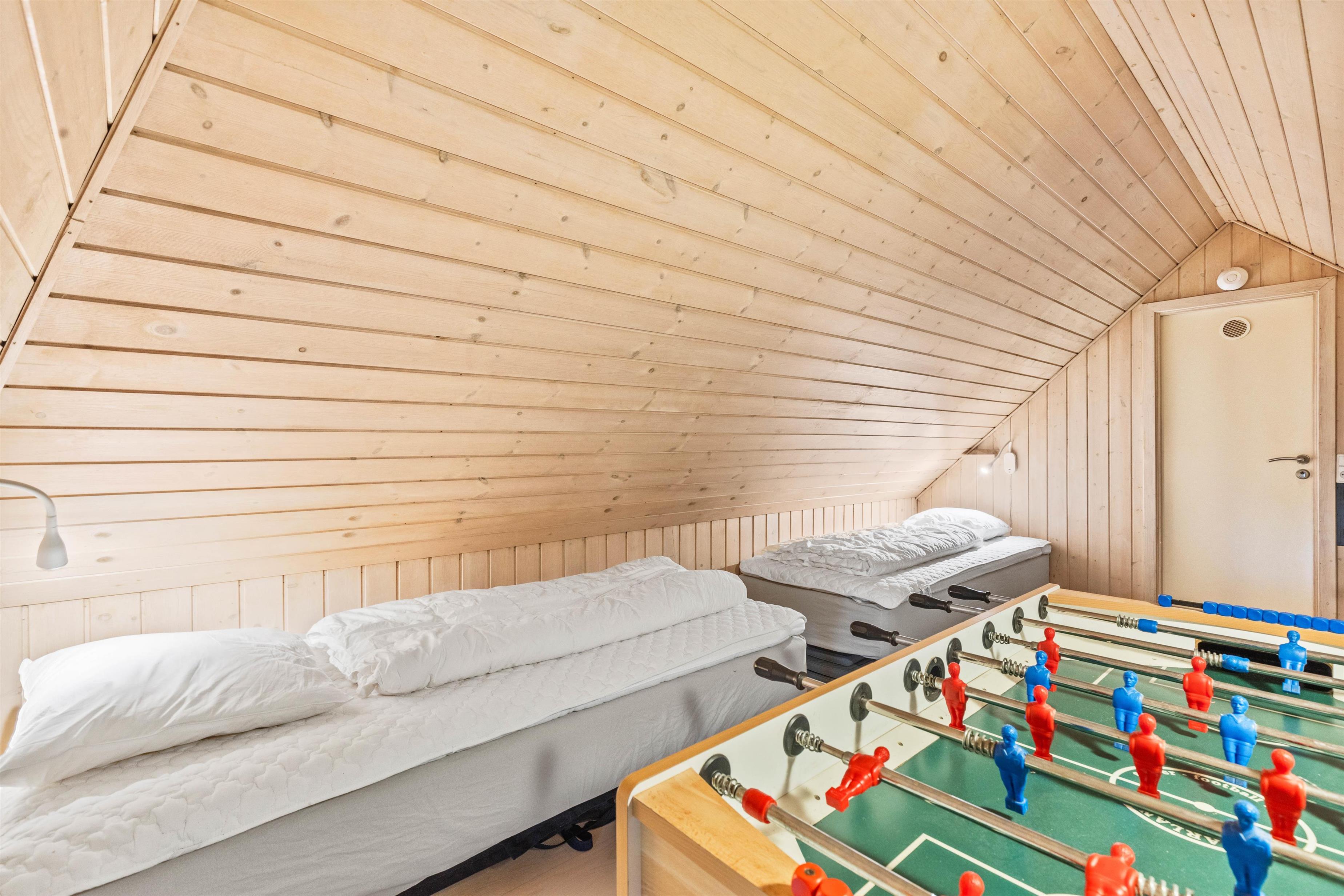 I poolrummet finder I en indendørs swimmingpool med rutsjebane og et spabad med plads til 6 personer. Det ene af feriehusets 2 badeværelser er desuden indrettet med sauna, så I hurtigt kan blive tørre efter en frisk dukkert. Endnu et highlight befinder sig på hemsen, der blandt andet råder over et bordfodboldbord.