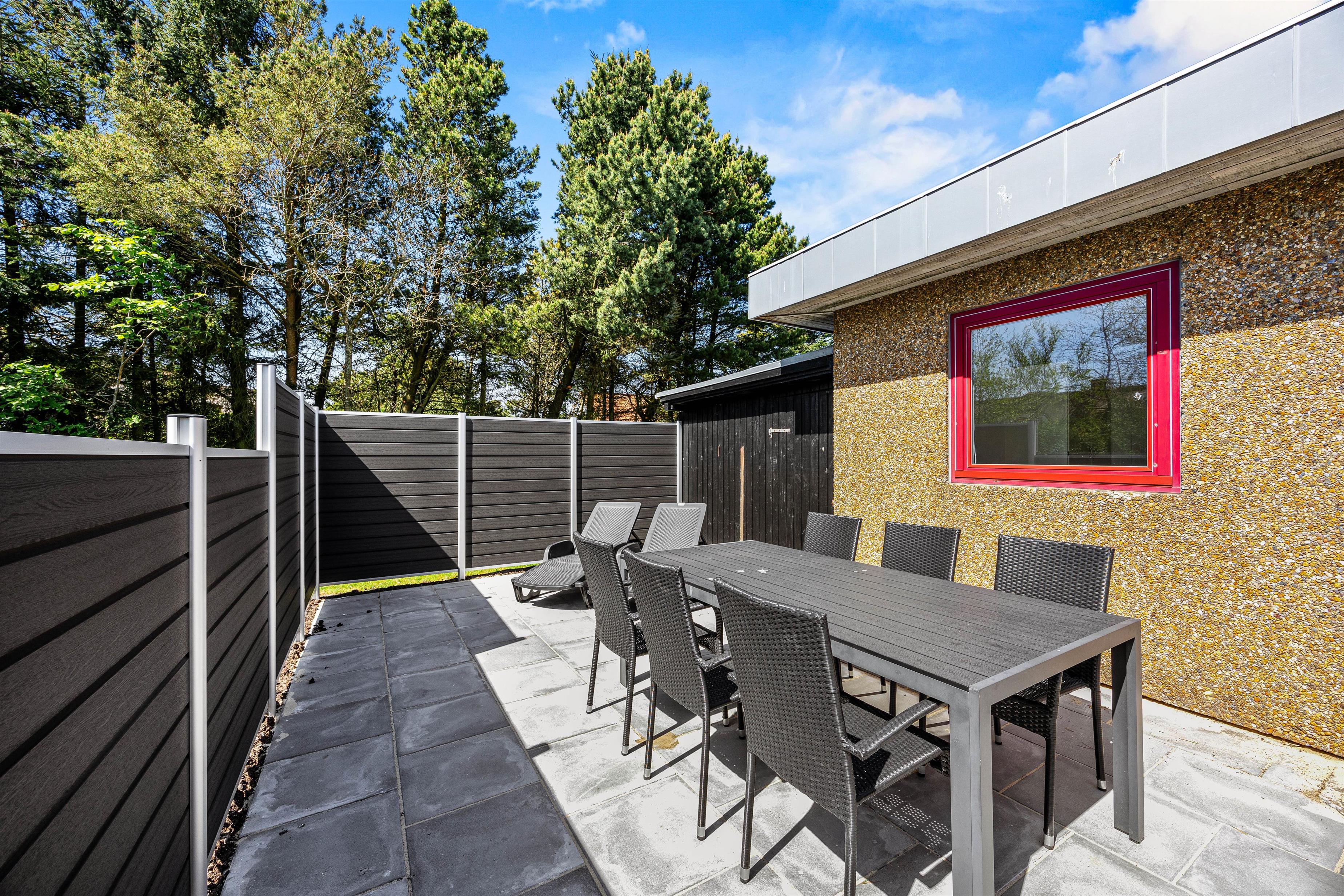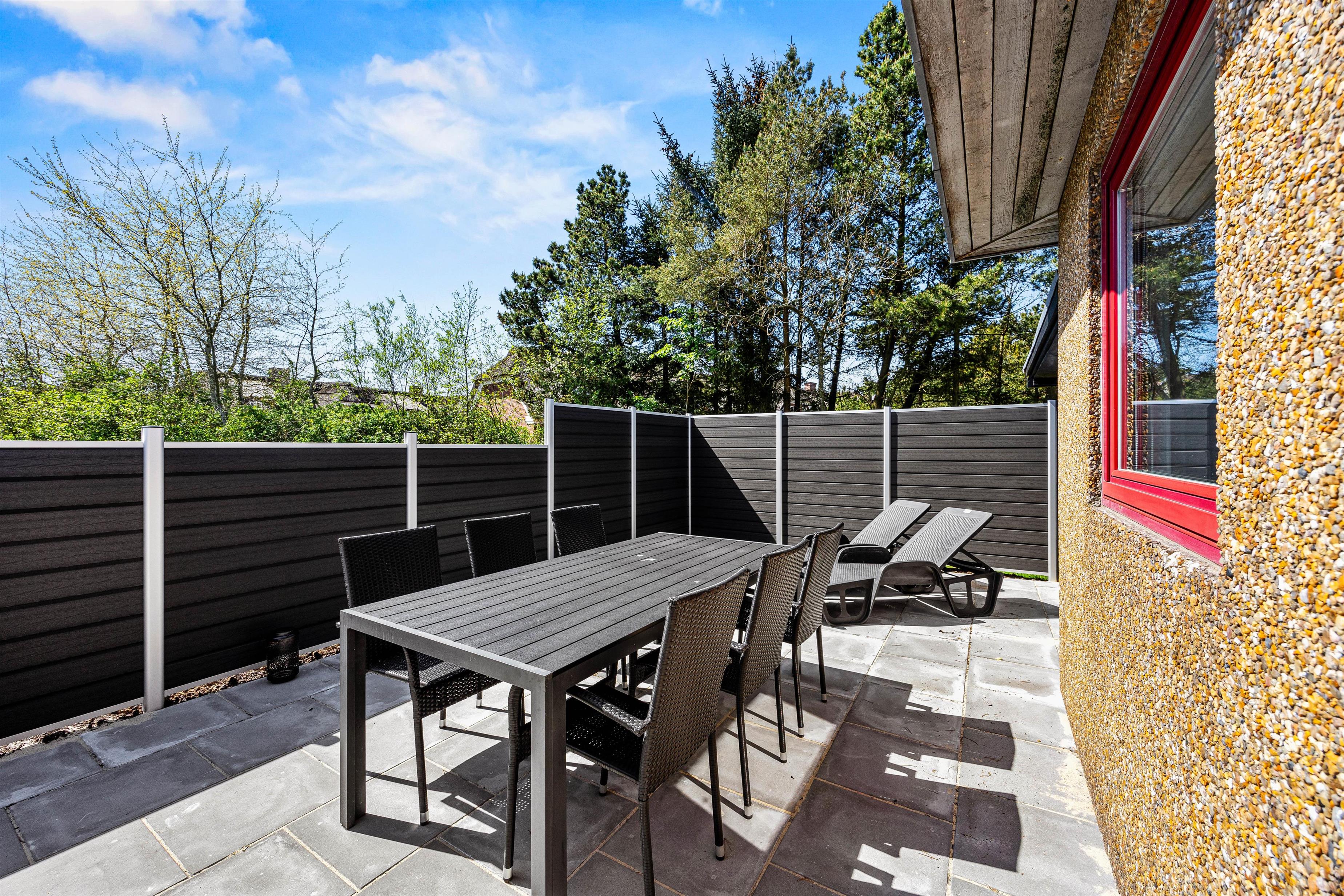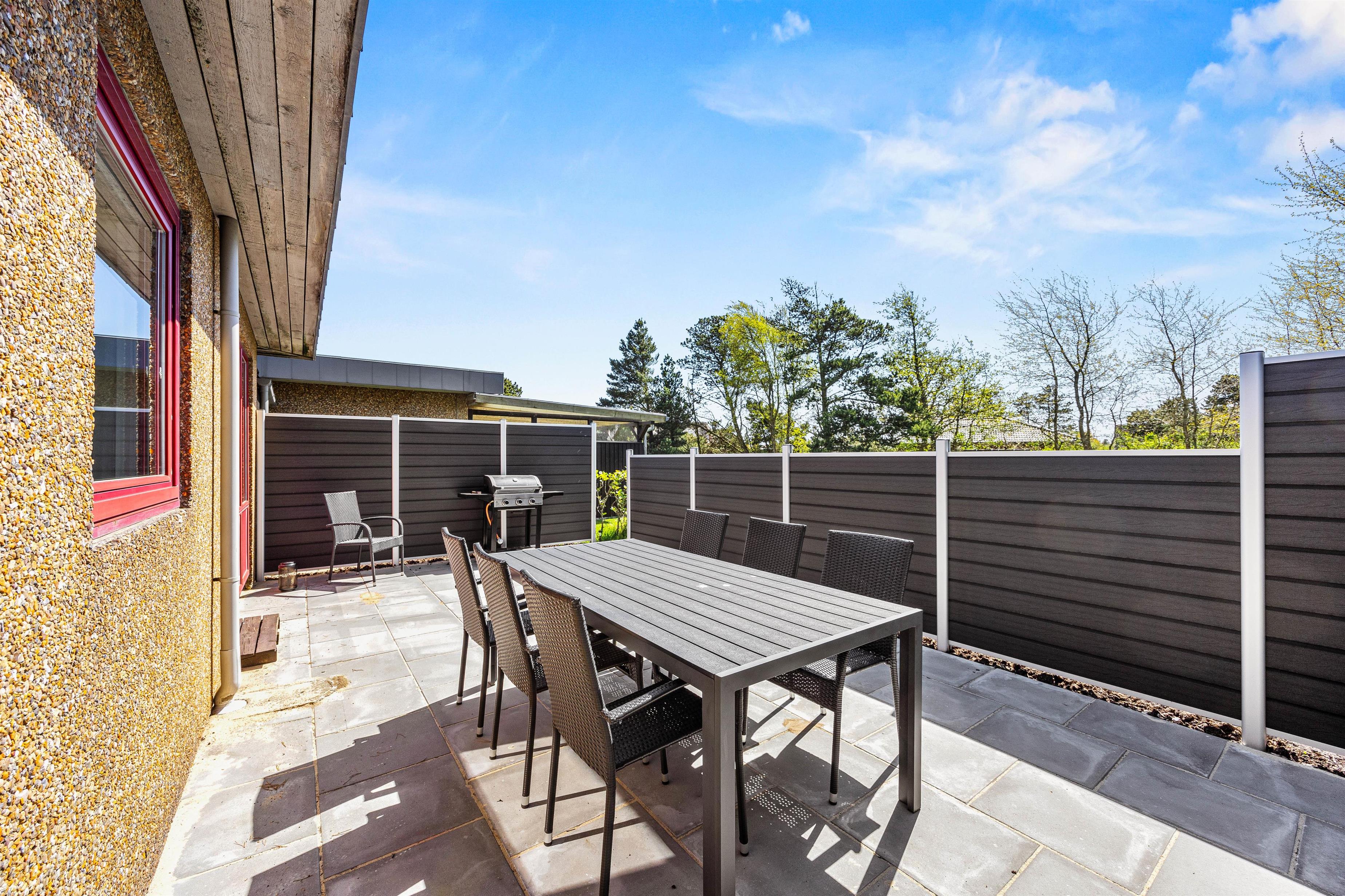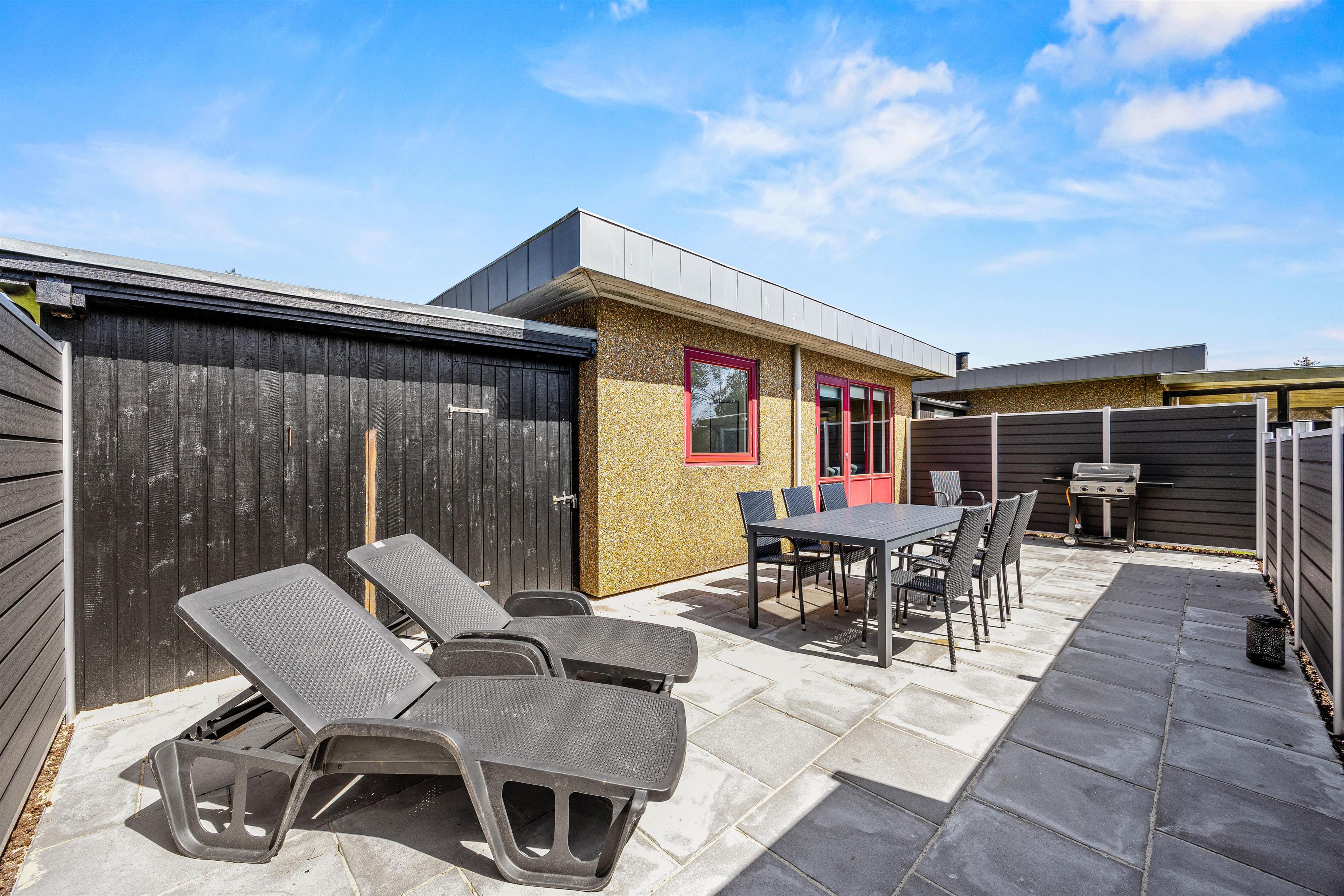 Udendørs har I flere muligheder for at nyde de varme, solrige feriedage. Her venter jer både en skøn have og en lukket terrasse, hvor I kan tilbringe de dage, hvor ferievejret er i top. I har både havemøbler og liggestole til rådighed, som I kan finde jer til rette i på terrassen.