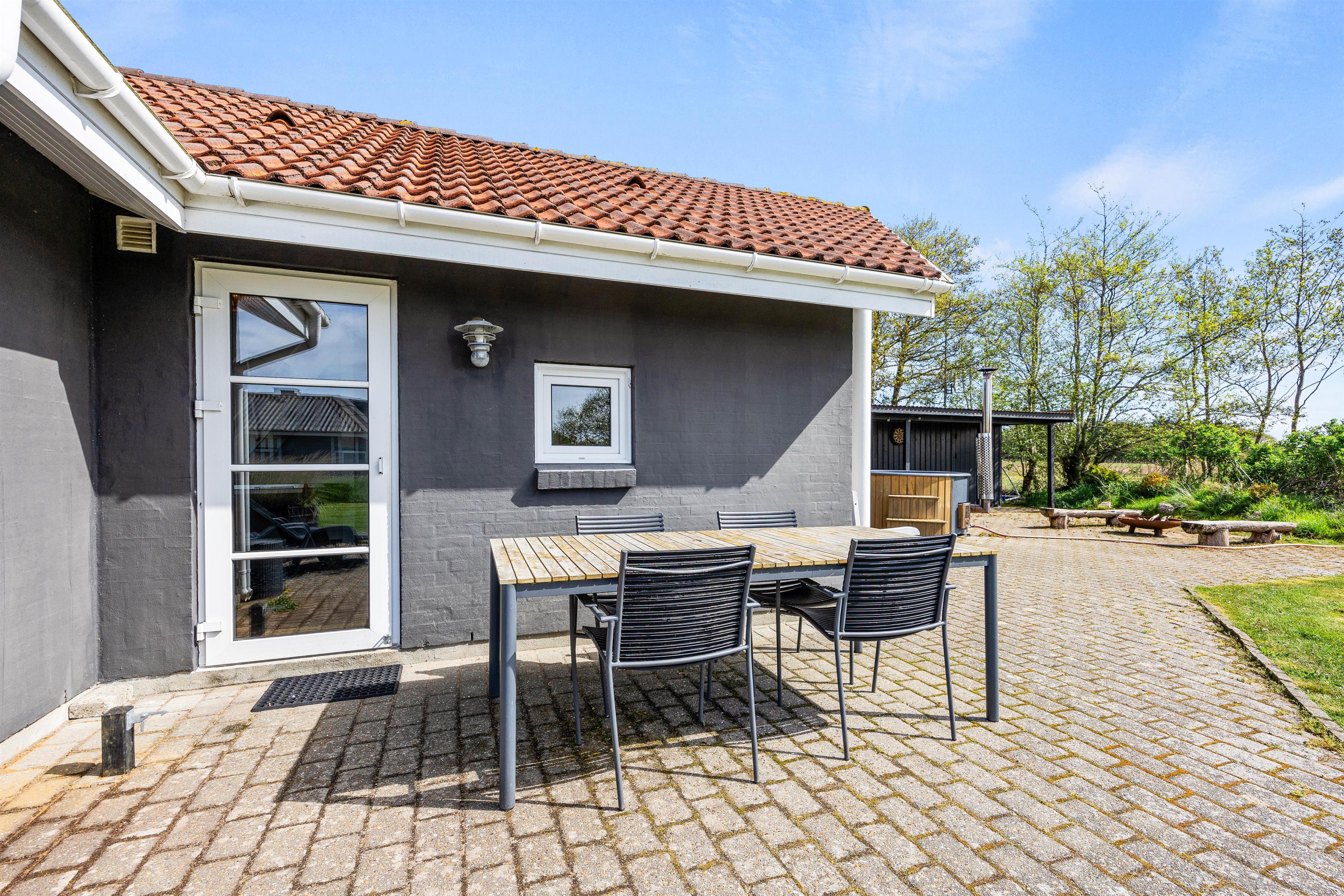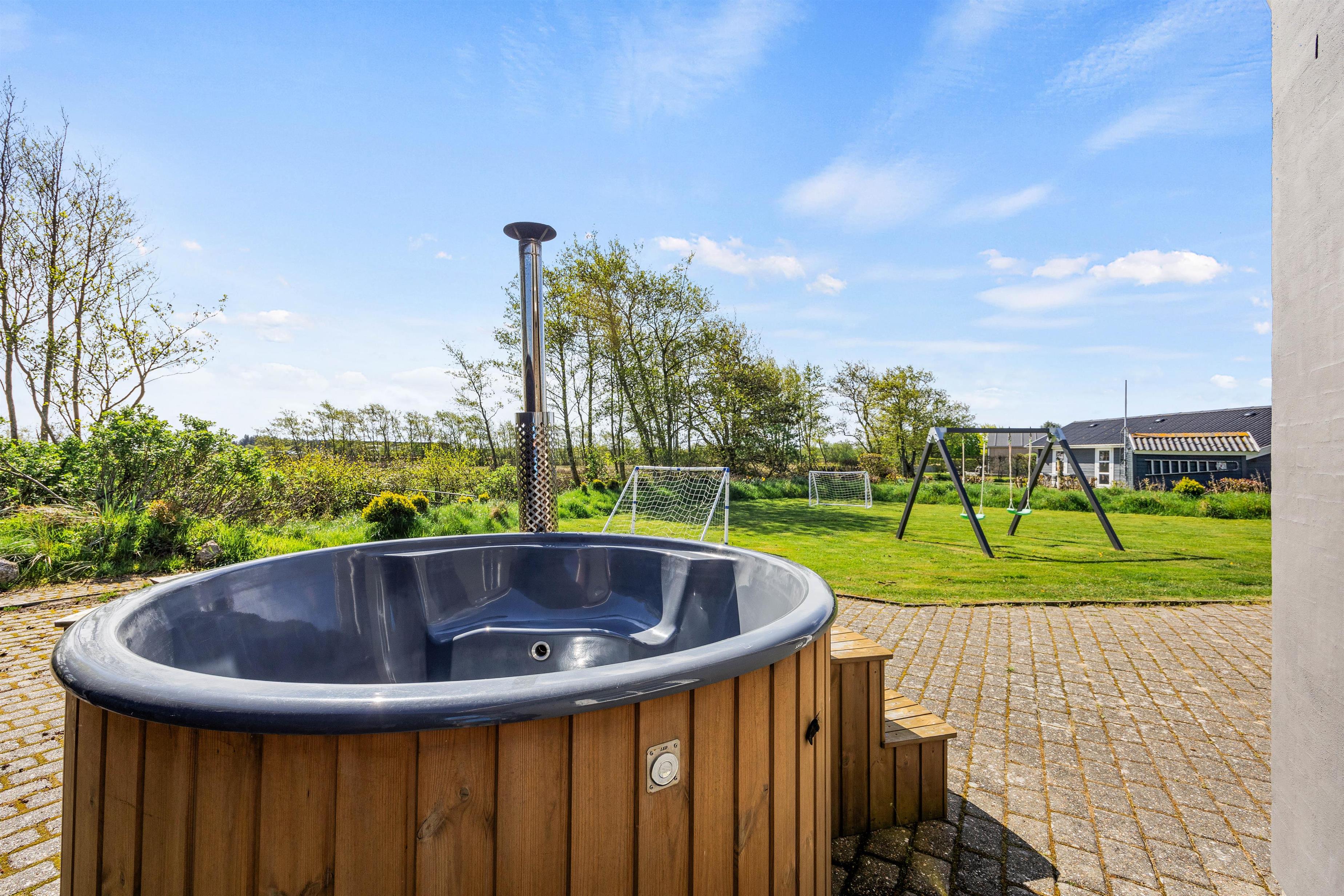 Også udendørs har I mulighed for virkelig at få slappet af, da der på sommerhusets terrasse står et vildmarksbad. Her kan I nyde masser af afslapning i det varme vand under åben himmel. I kan også sætte jer i vildmarksbadet om aftenen, hvor I kan nyde en afslappende stund under stjernehimmelen.