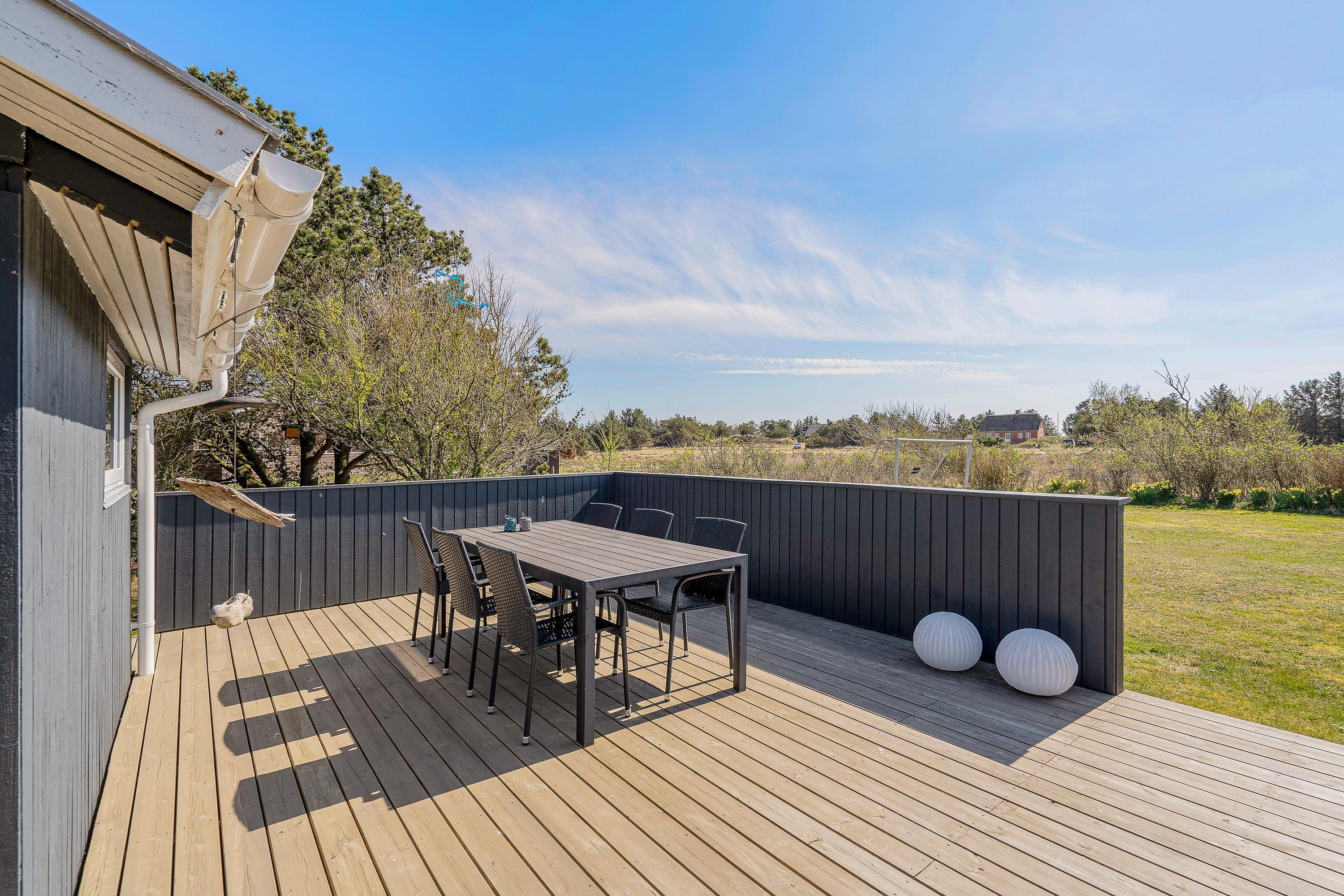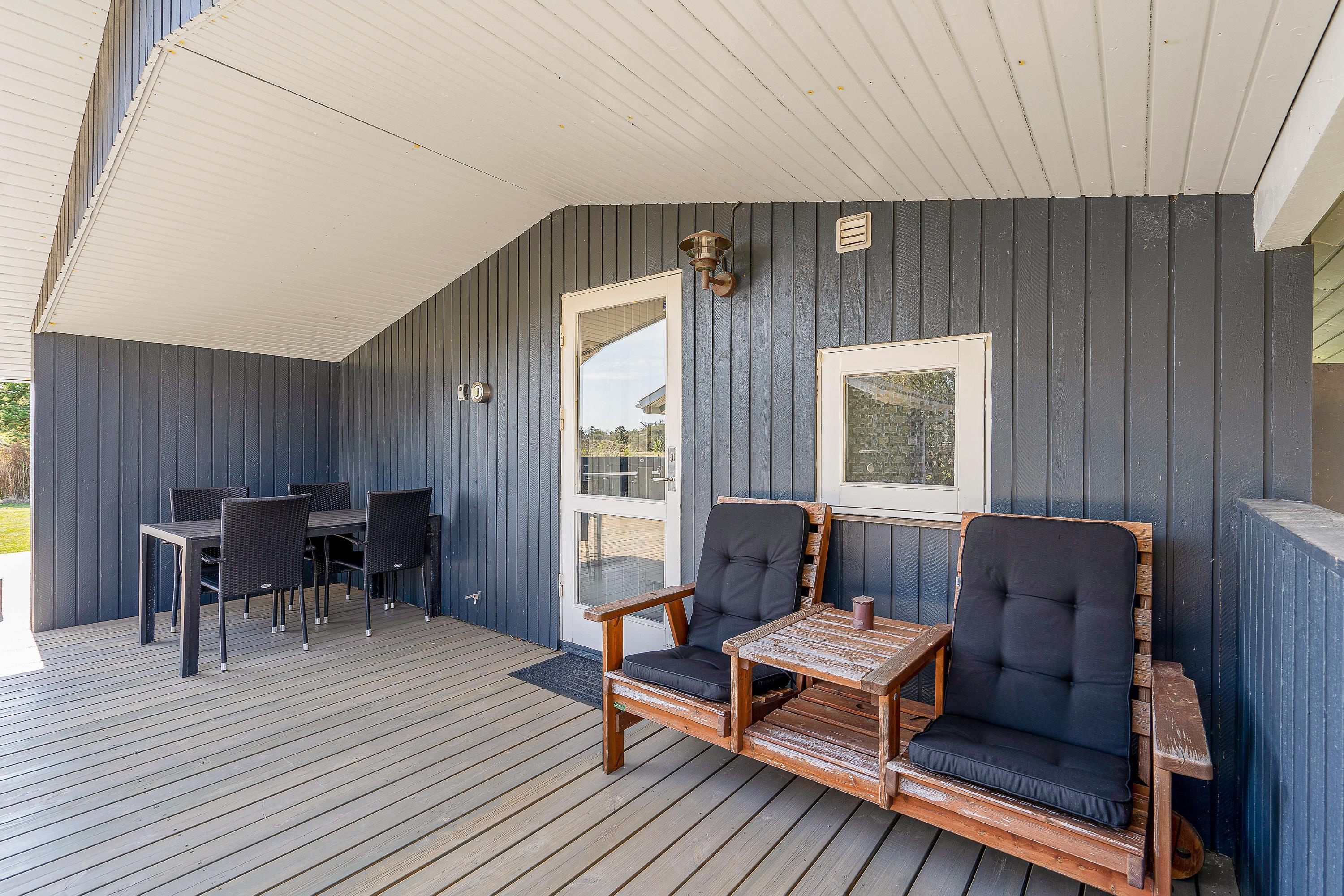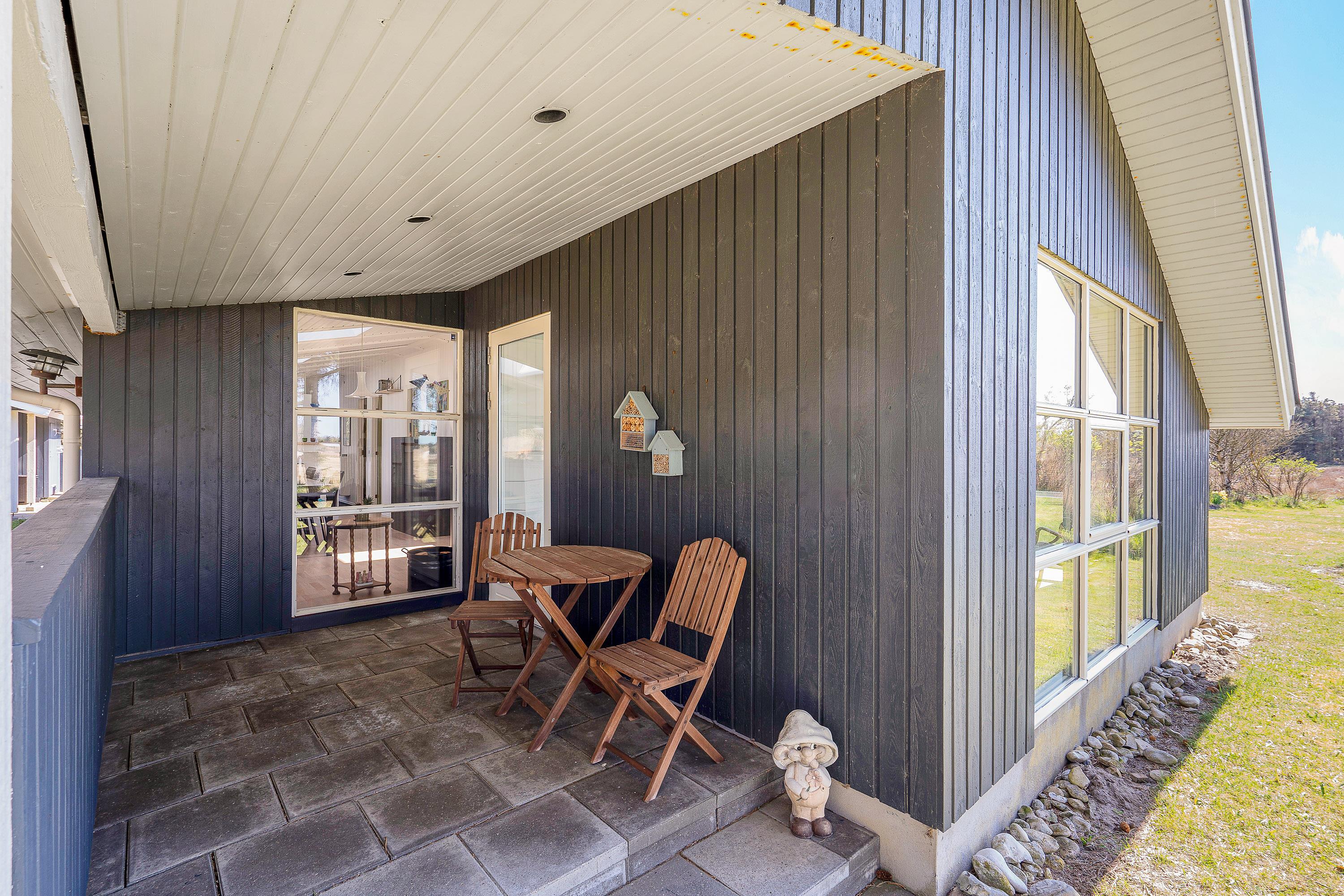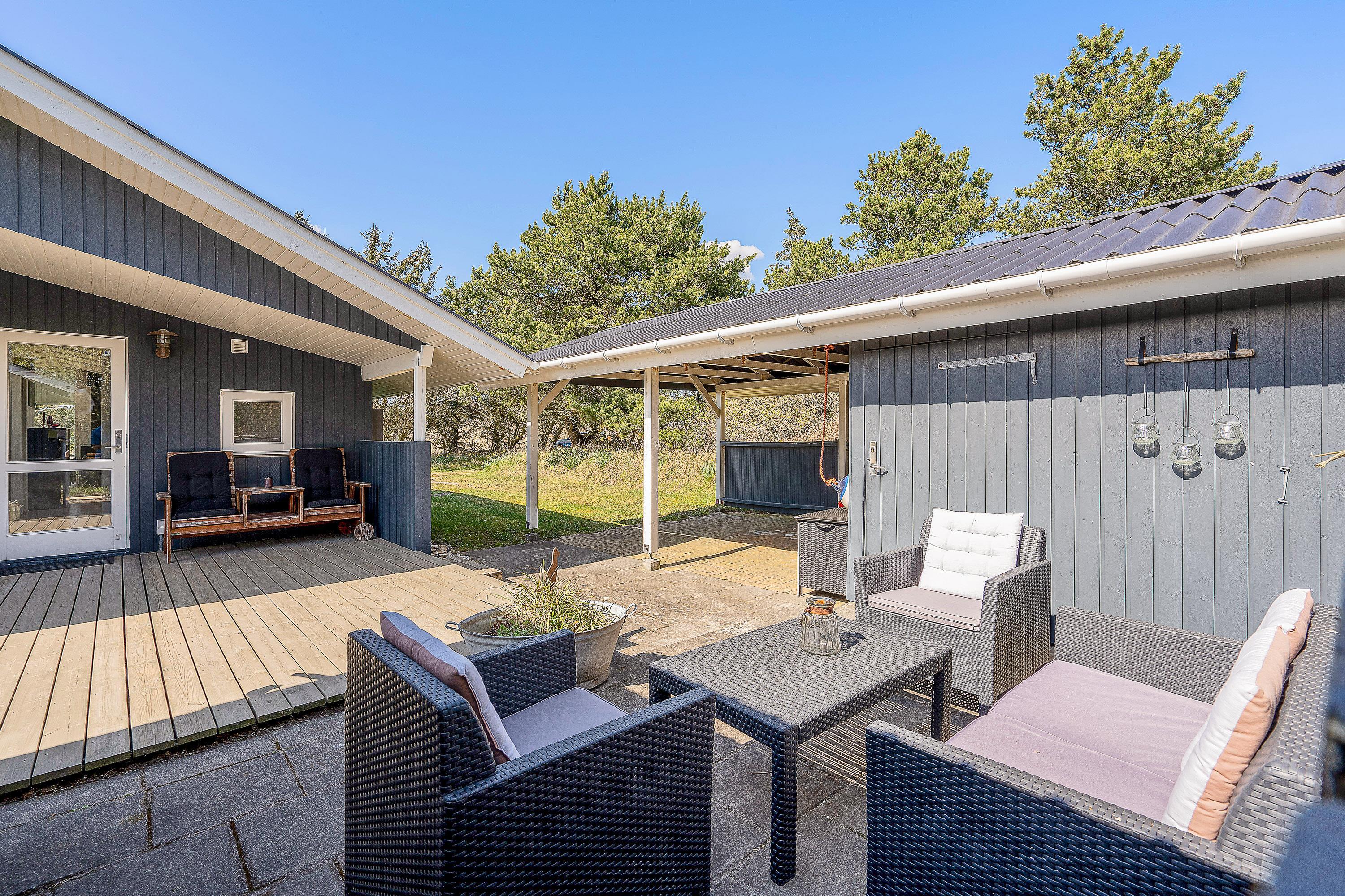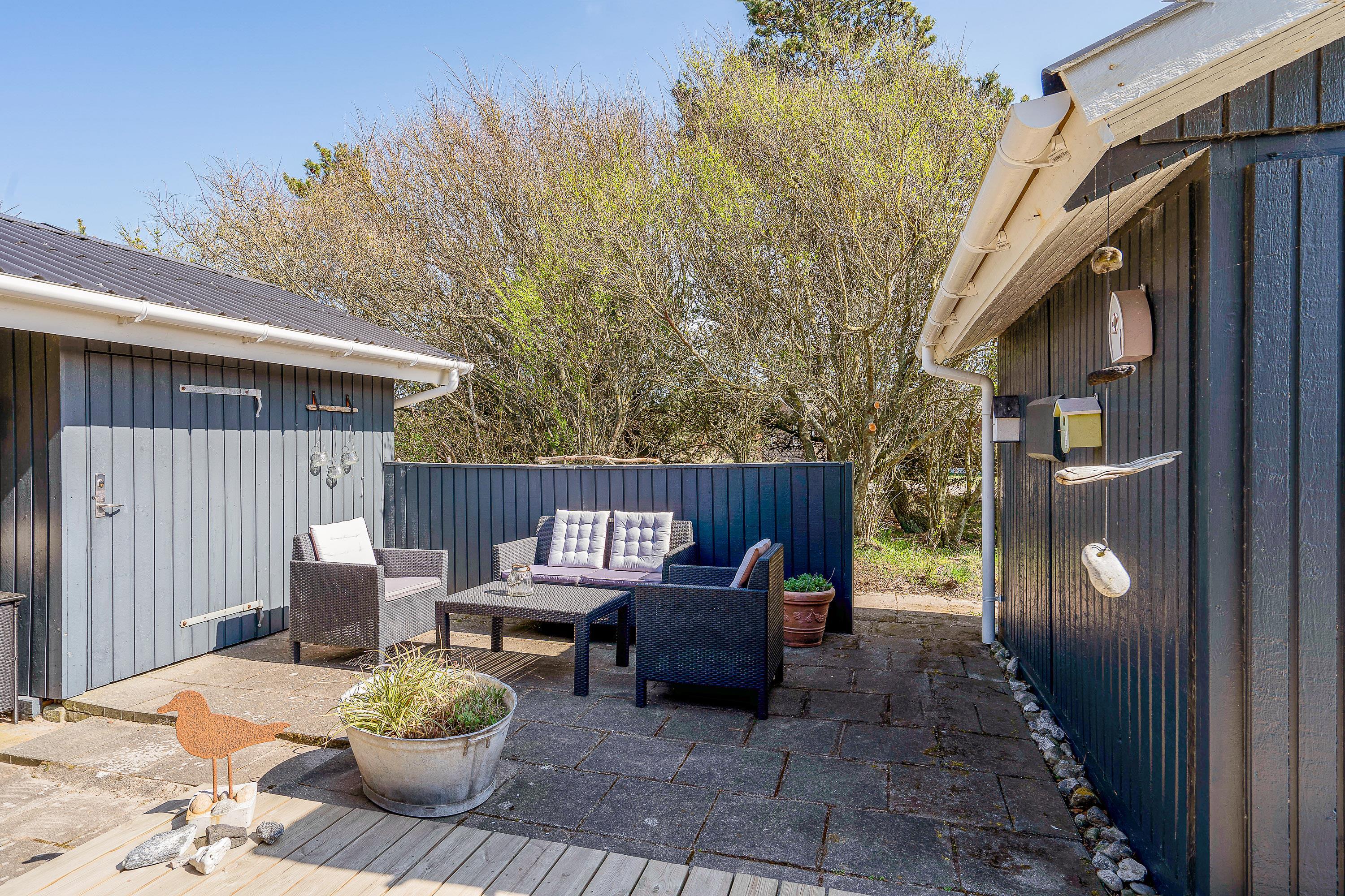 Udendørs byder sommerhuset på en dejlig terrasse, der er delvist overdækket og afskærmet, som I kan nyde feriens solrige dage på. Her har I havemøbler og liggestole til rådighed, som I kan finde jer til rette i på en god plads i solen.