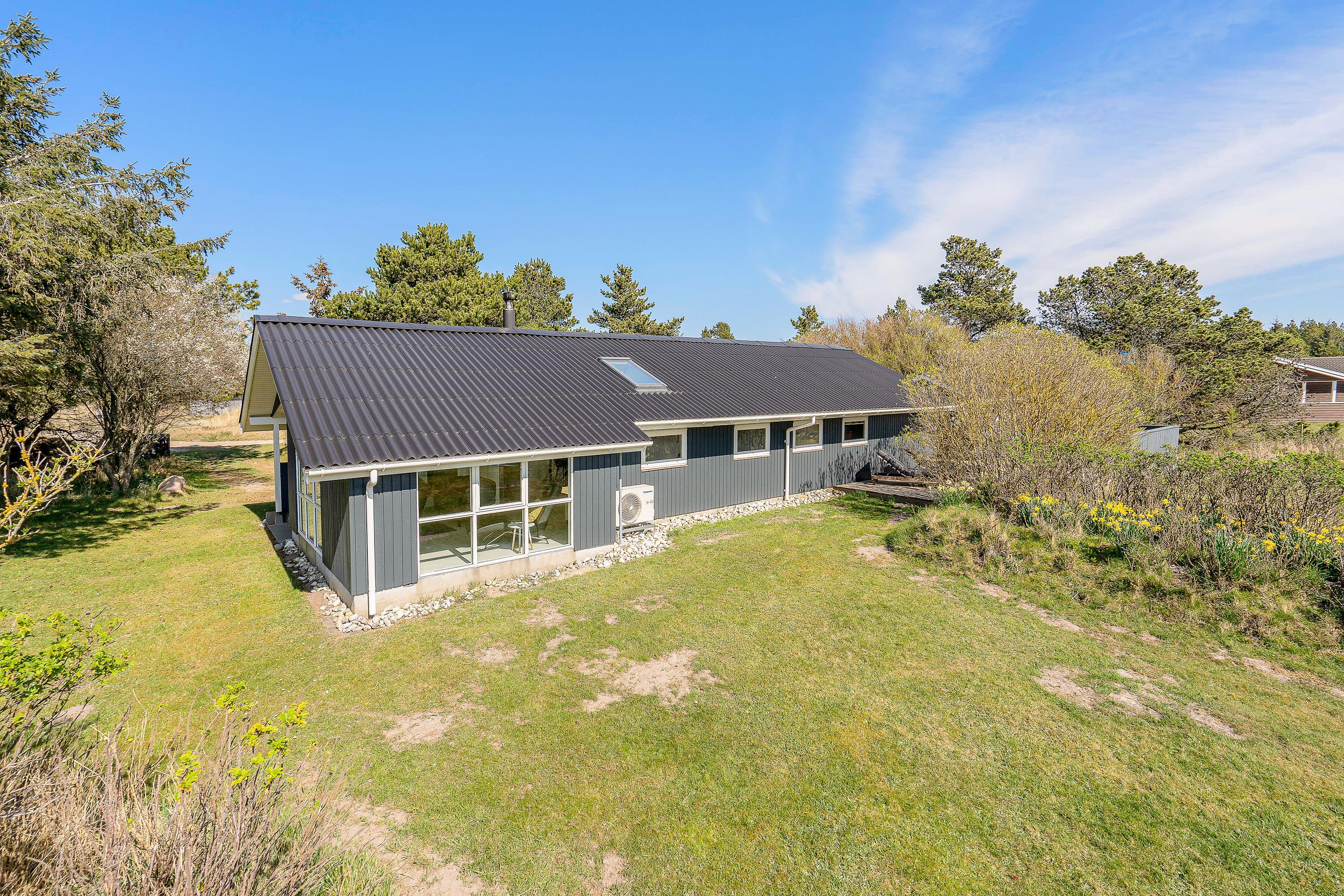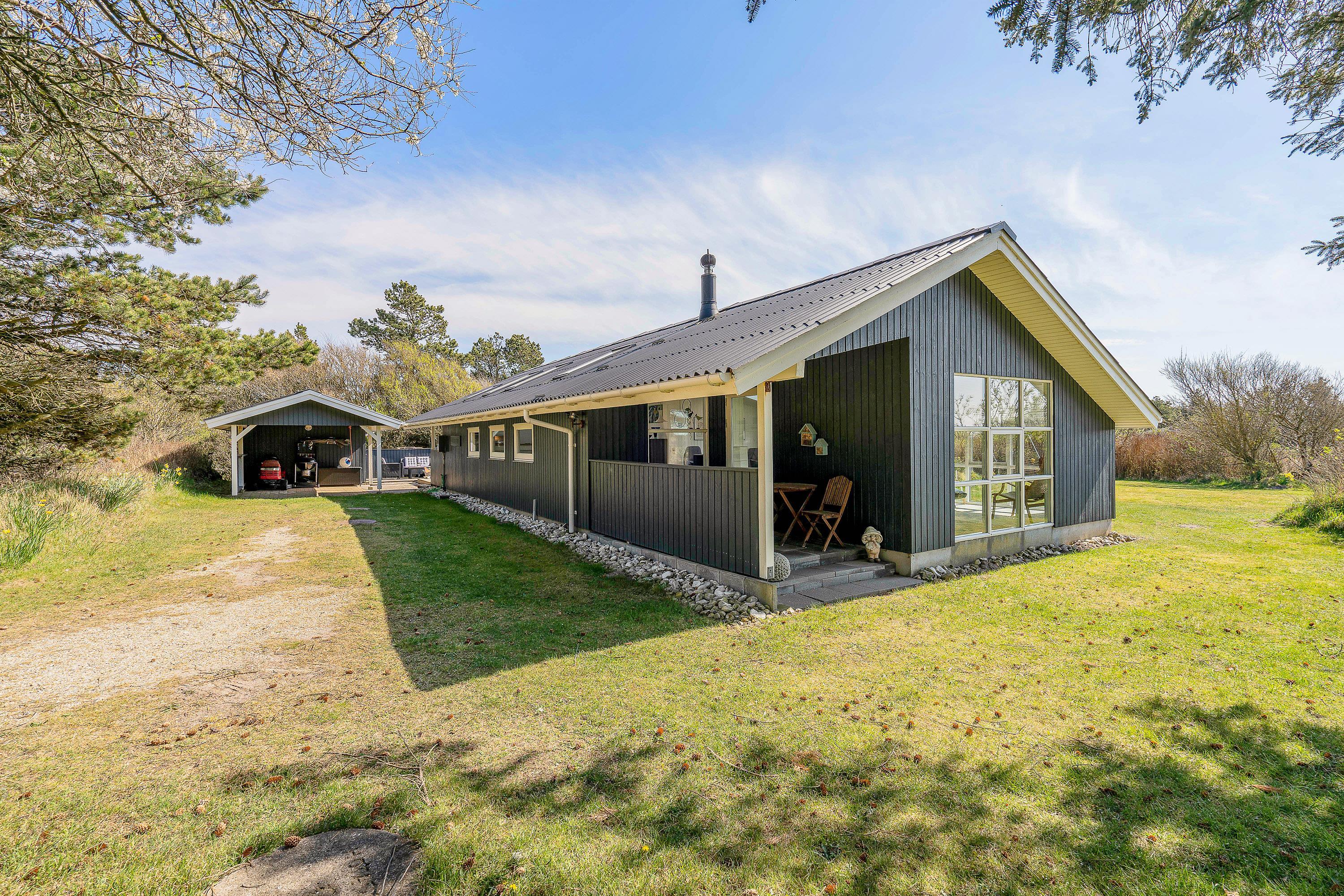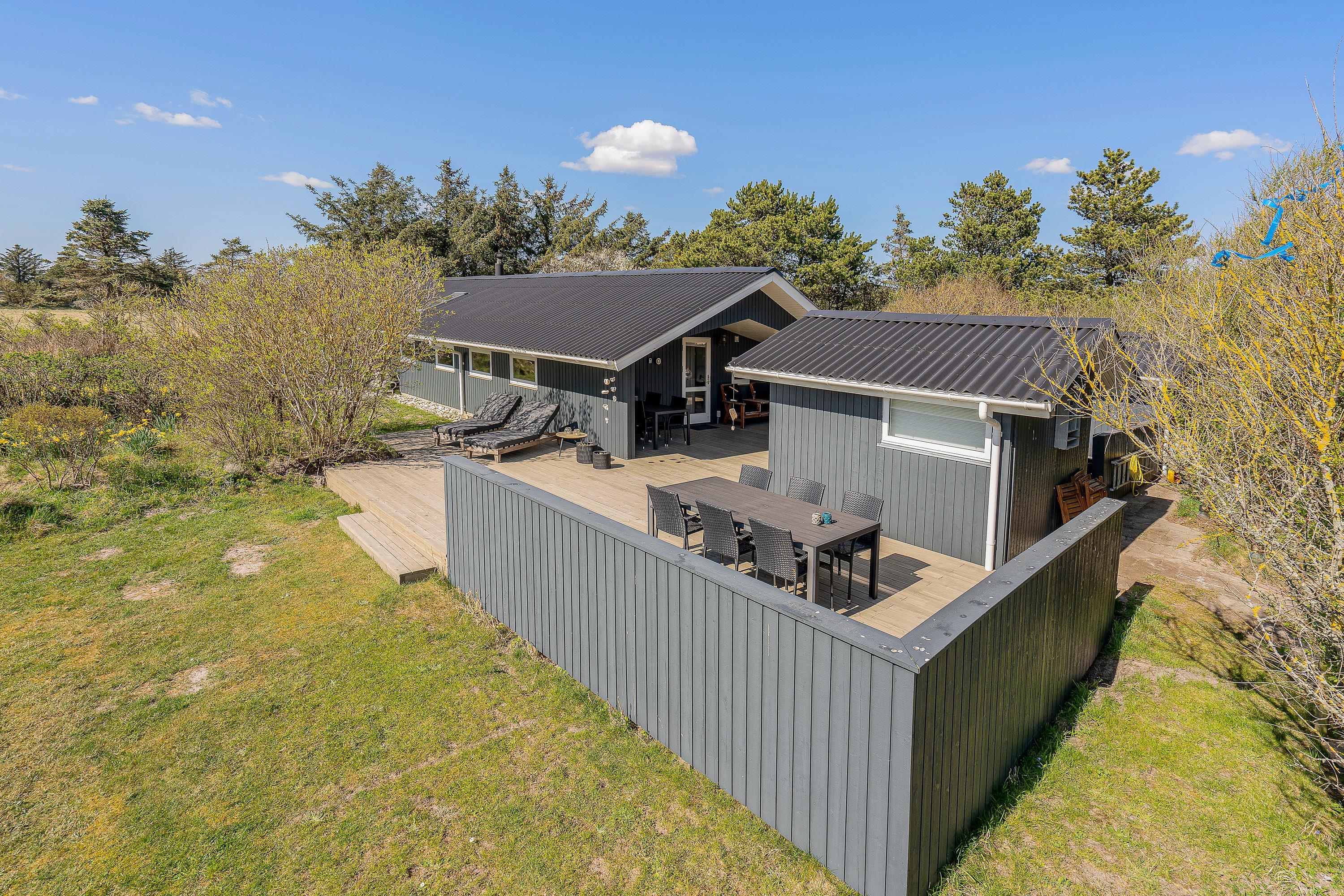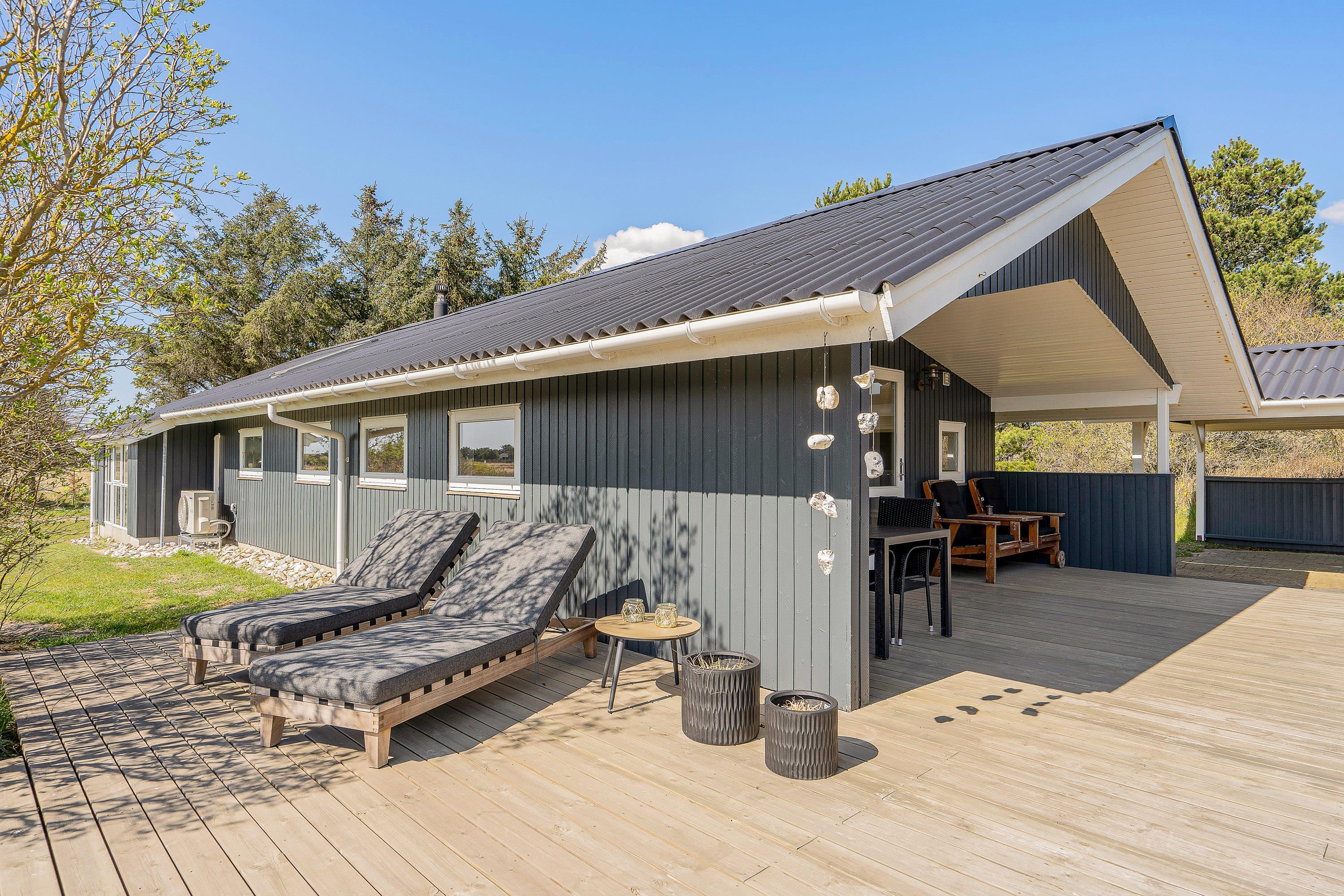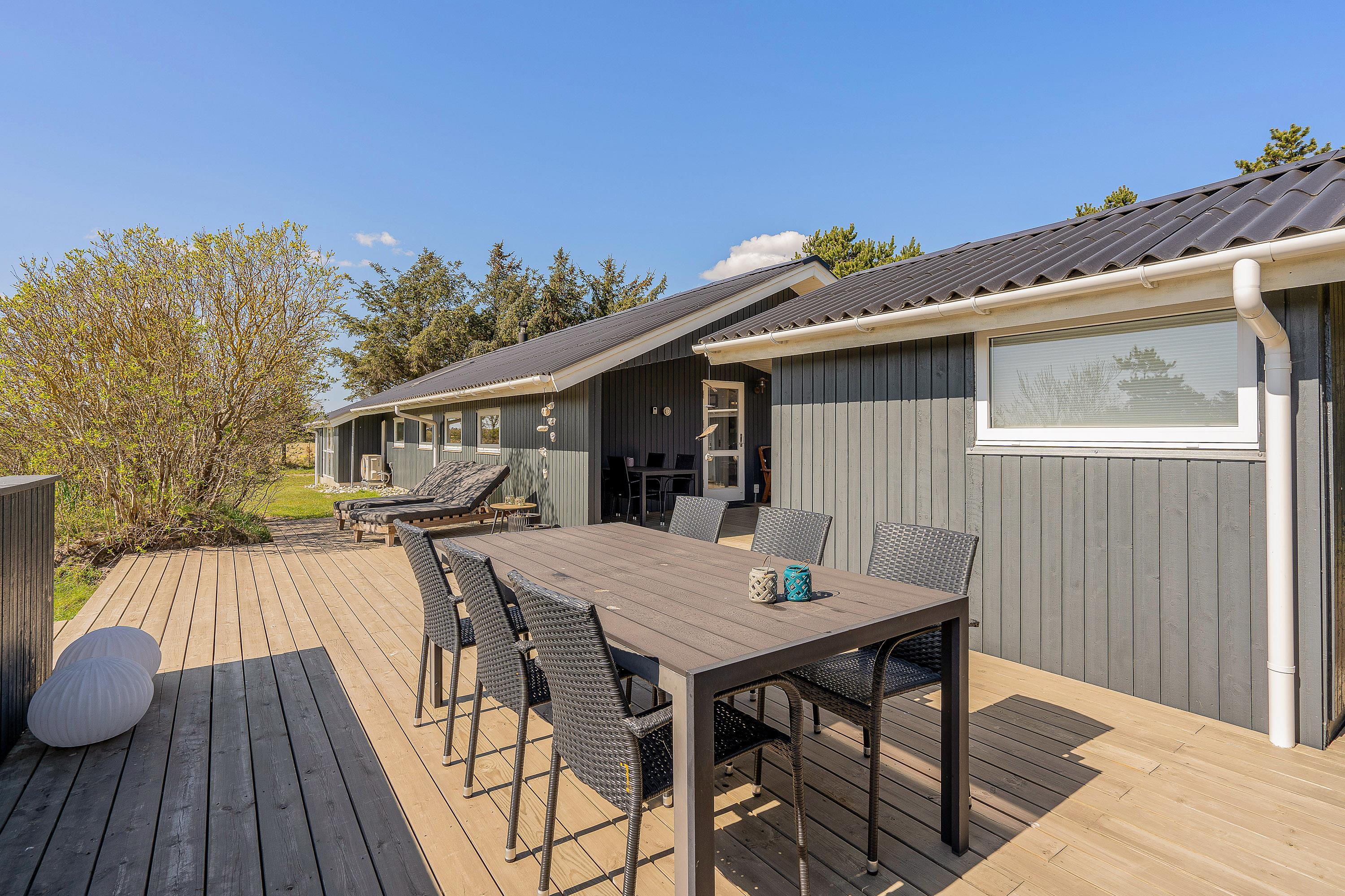 Udendørs byder sommerhuset på en dejlig terrasse, der er delvist overdækket og afskærmet, som I kan nyde feriens solrige dage på. Her har I havemøbler og liggestole til rådighed, som I kan finde jer til rette i på en god plads i solen.