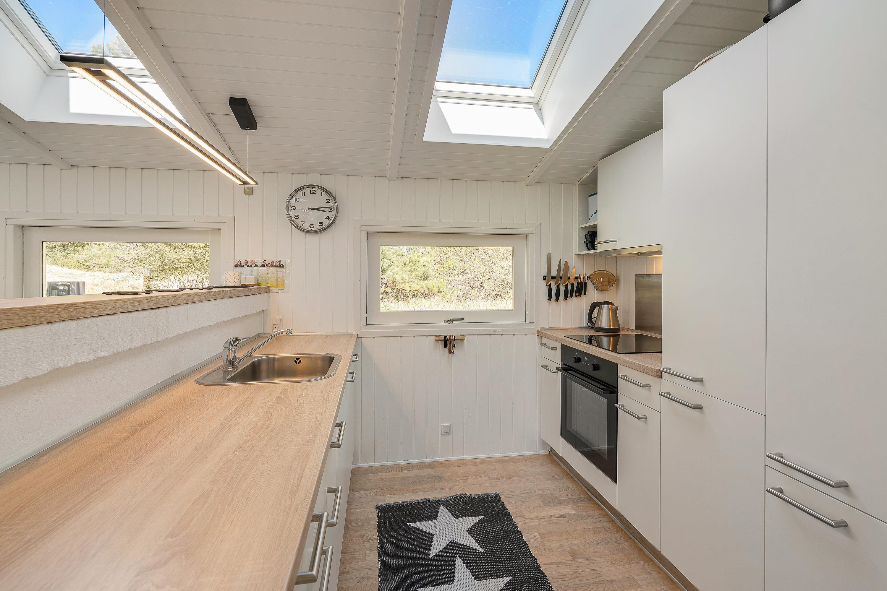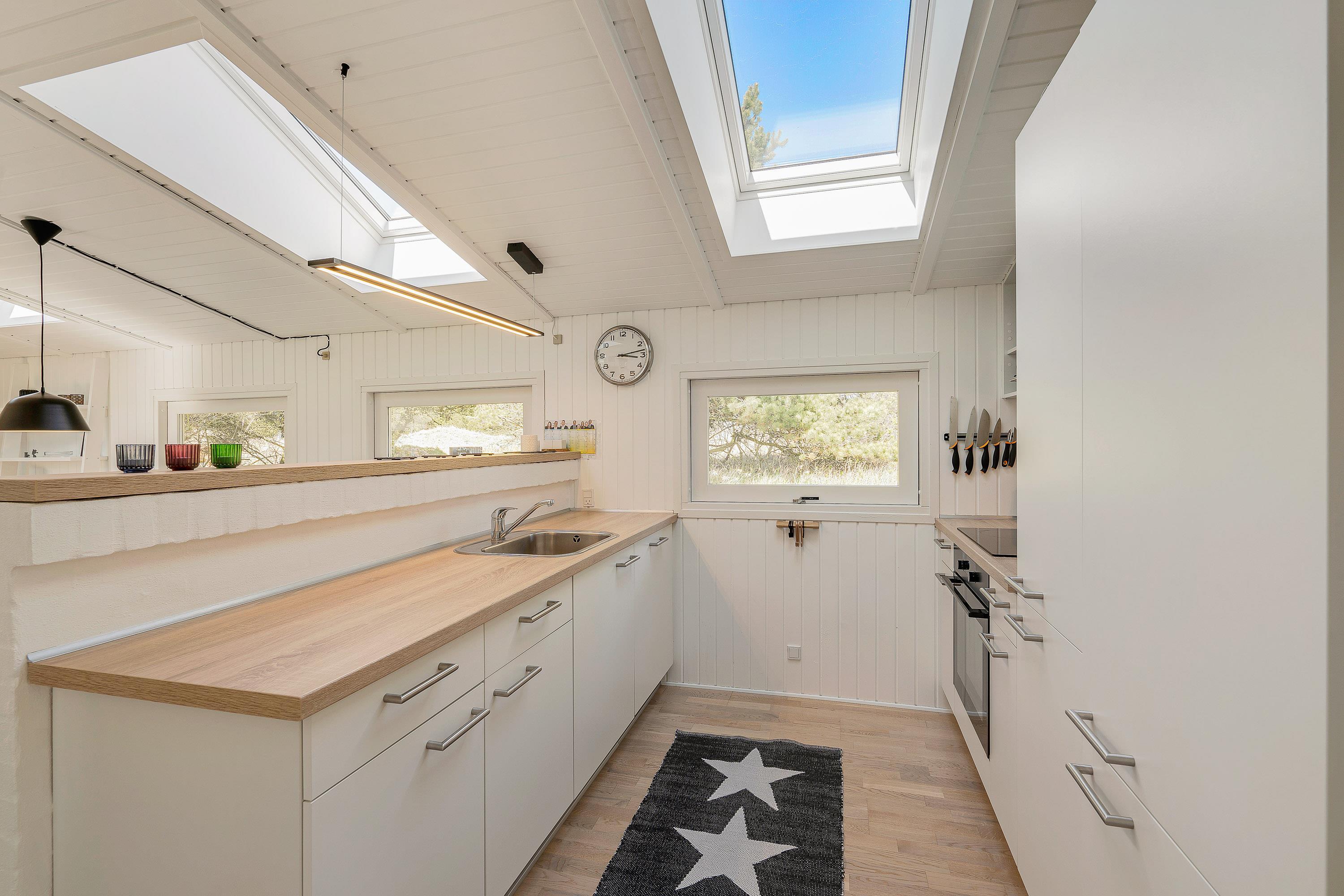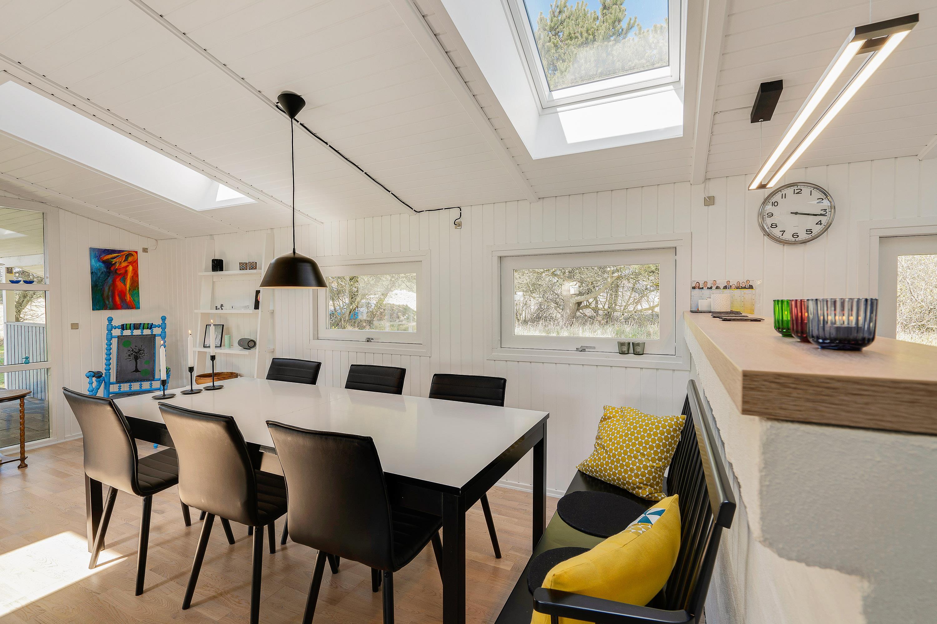 Sommerhusets køkken, spiseplads og stue ligger i åben forbindelse og danner tilsammen alrummet, hvor I kan nyde mange hyggelige feriestunder sammen, der blandt andet kan stå på madlavning, spil og film – I kan endda streame jeres yndlingsfilm via sommerhusets Apple TV.