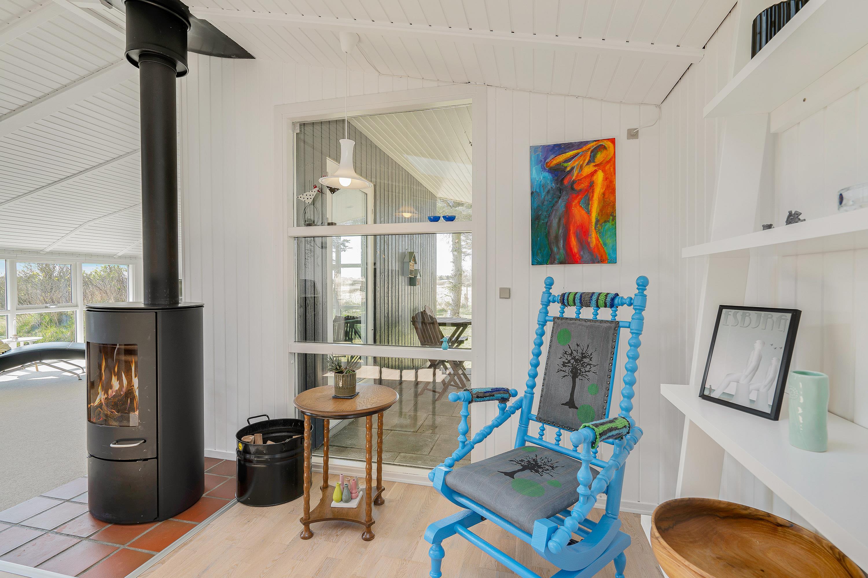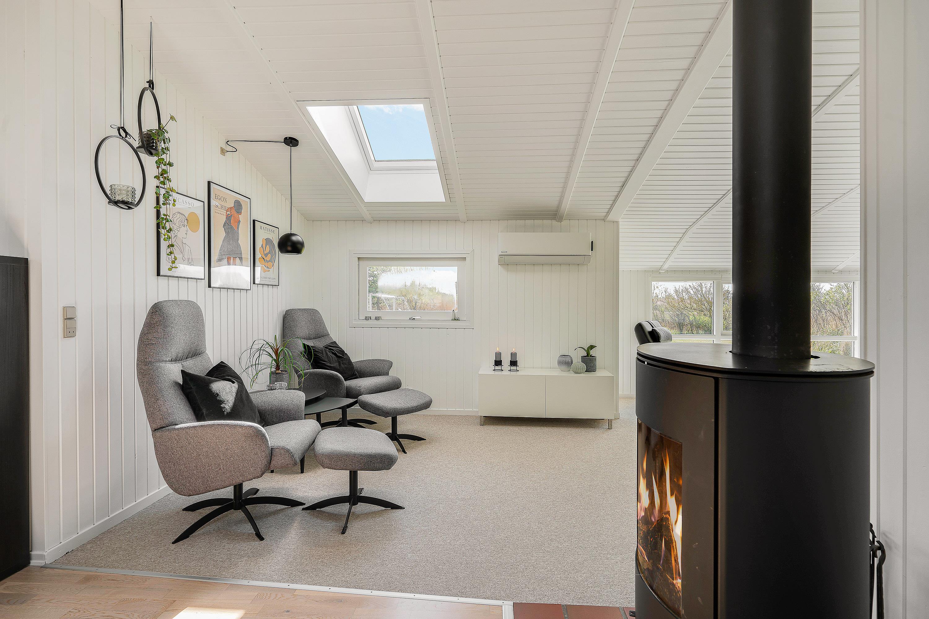I alrummet sørger brændeovnen for at fuldende feriestemningen, og samtidig spreder den dejlig varme i feriehuset. Desuden har I også en energivenlig varmepumpe, der til lave omkostninger sørger for, at I har gode temperaturer i feriehuset.