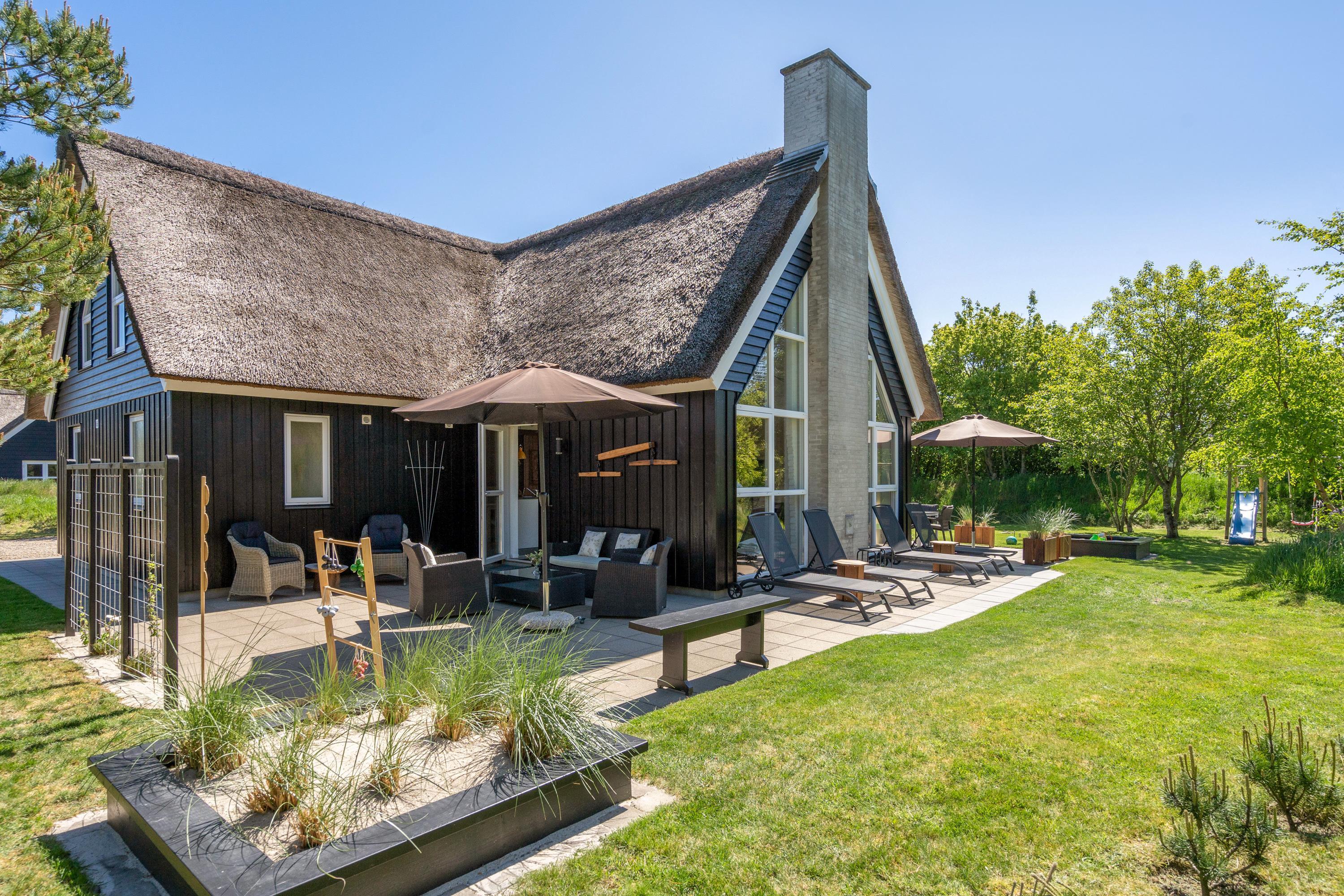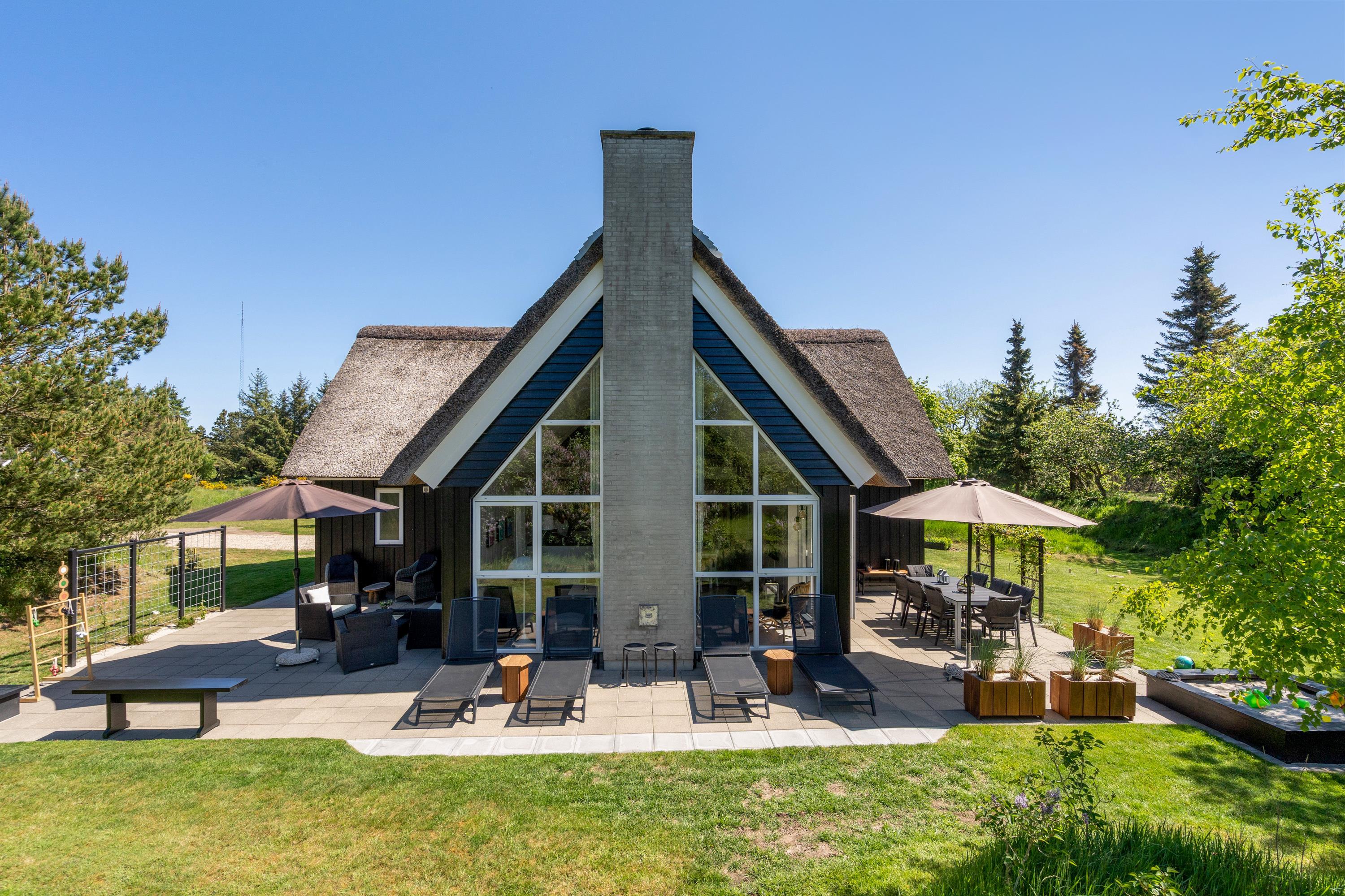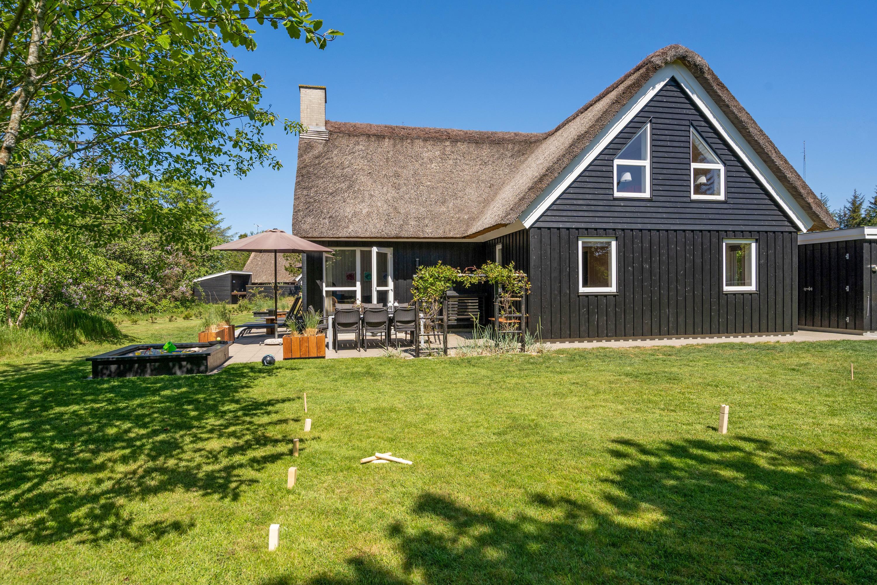 For enden af en lukket vej, ved indgangen til Blåvands populære ferieområde, ligger dette hyggelige, stråtækte sommerhus med plads til 8 personer. Sommerhuset er helt ideelt til en familieferie – med en imødekommende indretning med et personligt touch, der blandt andet byder på sauna, spabad og bordfodbold, og et naturskønt ydre med gode terrasser og legefaciliteter til de mindste.