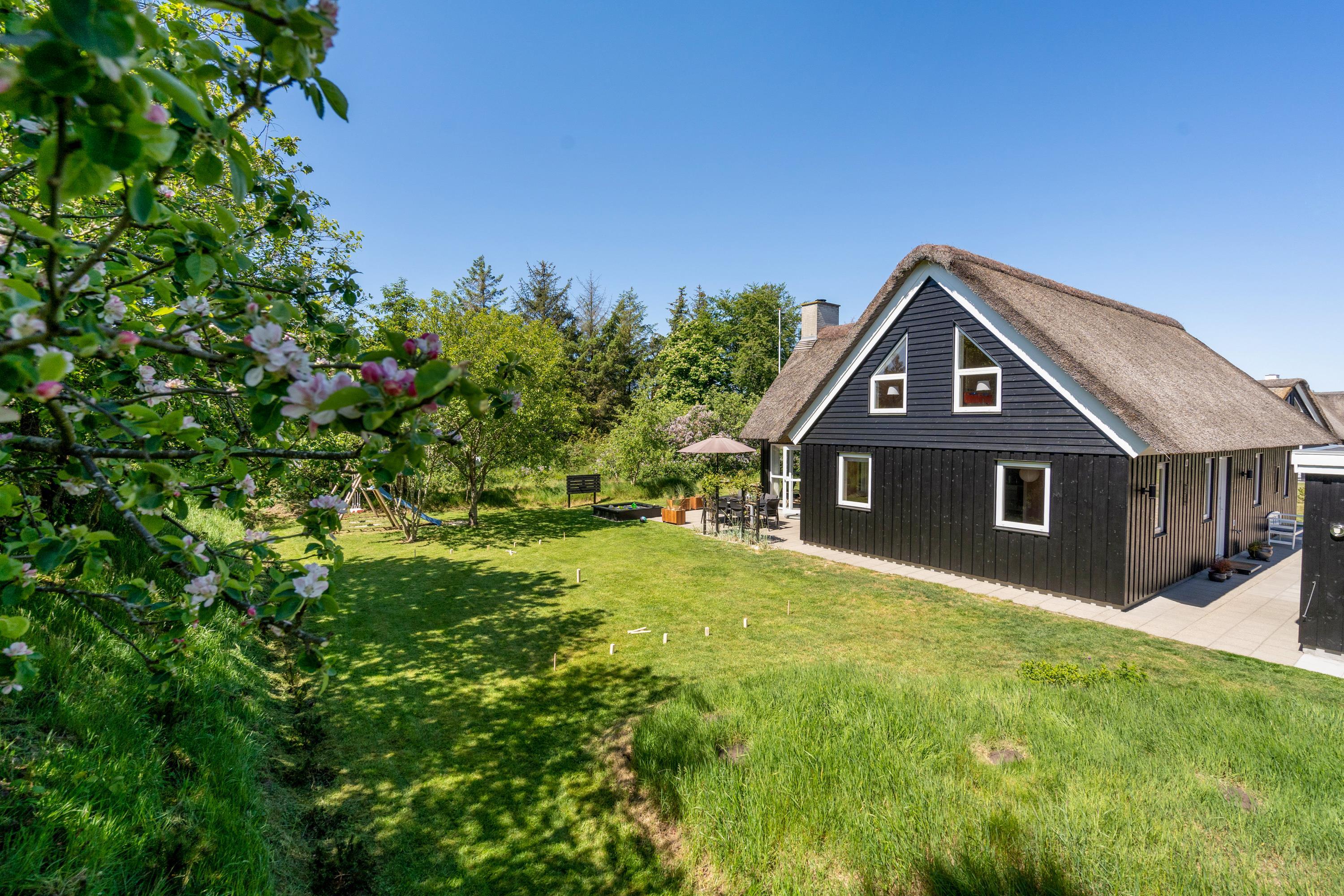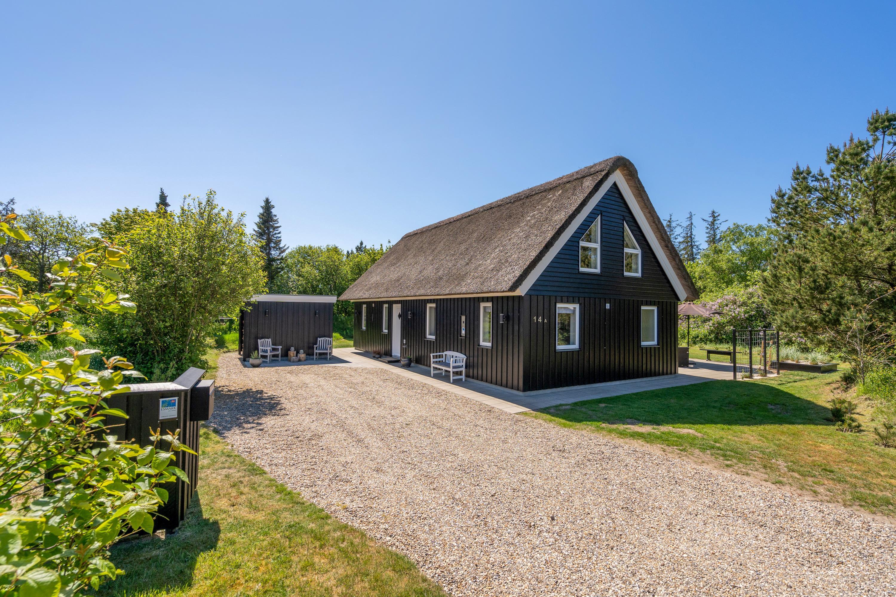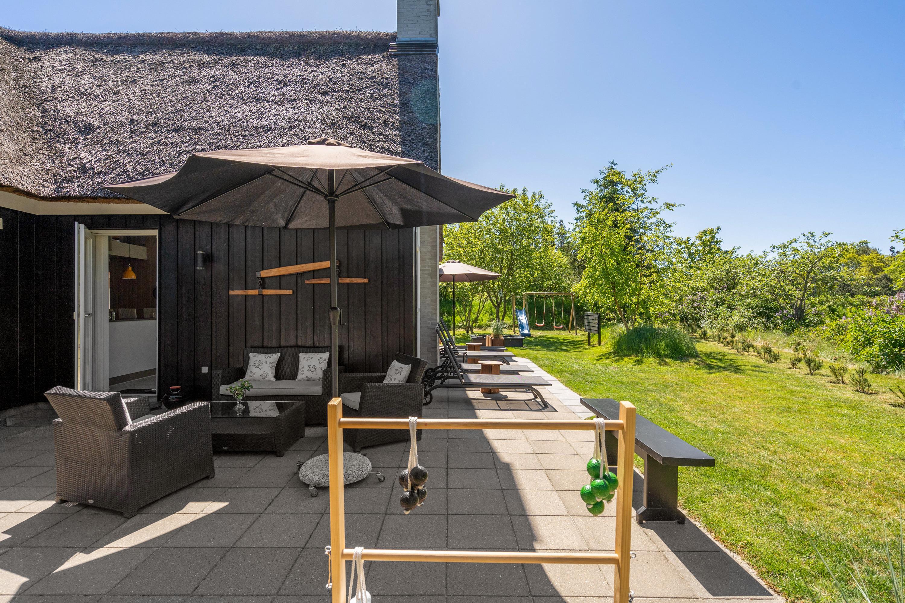 For enden af en lukket vej, ved indgangen til Blåvands populære ferieområde, ligger dette hyggelige, stråtækte sommerhus med plads til 8 personer. Sommerhuset er helt ideelt til en familieferie – med en imødekommende indretning med et personligt touch, der blandt andet byder på sauna, spabad og bordfodbold, og et naturskønt ydre med gode terrasser og legefaciliteter til de mindste.
