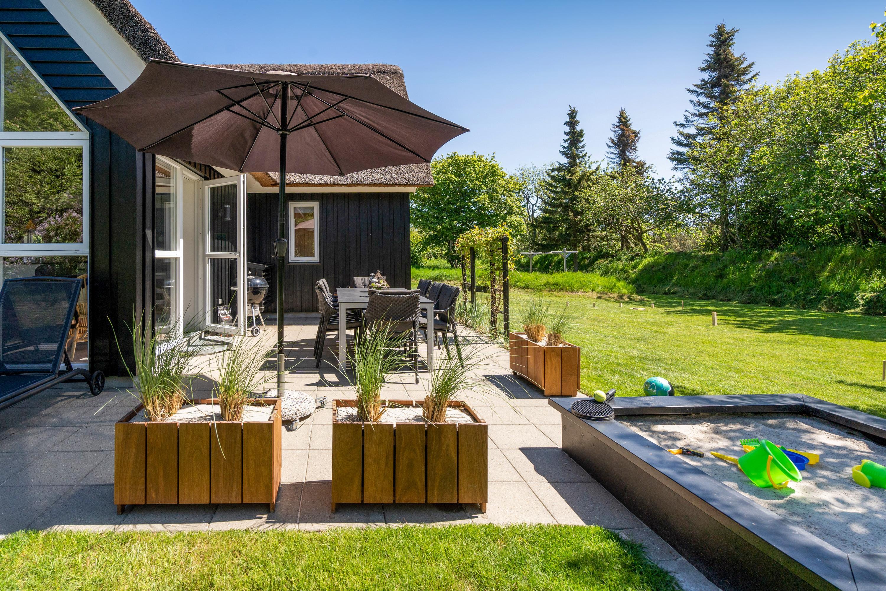 En flisebelagt terrasse løber hele vejen rundt om sommerhuset, så I hele tiden kan følge med solen og få det bedste ud af de varme dage i sommerhalvåret. På den velholdte græsplæne kan børnene få fri leg, mens I ser til fra terrassen, og blandt de mindste i flokken vil sandkassen helt sikkert falde i god jord.