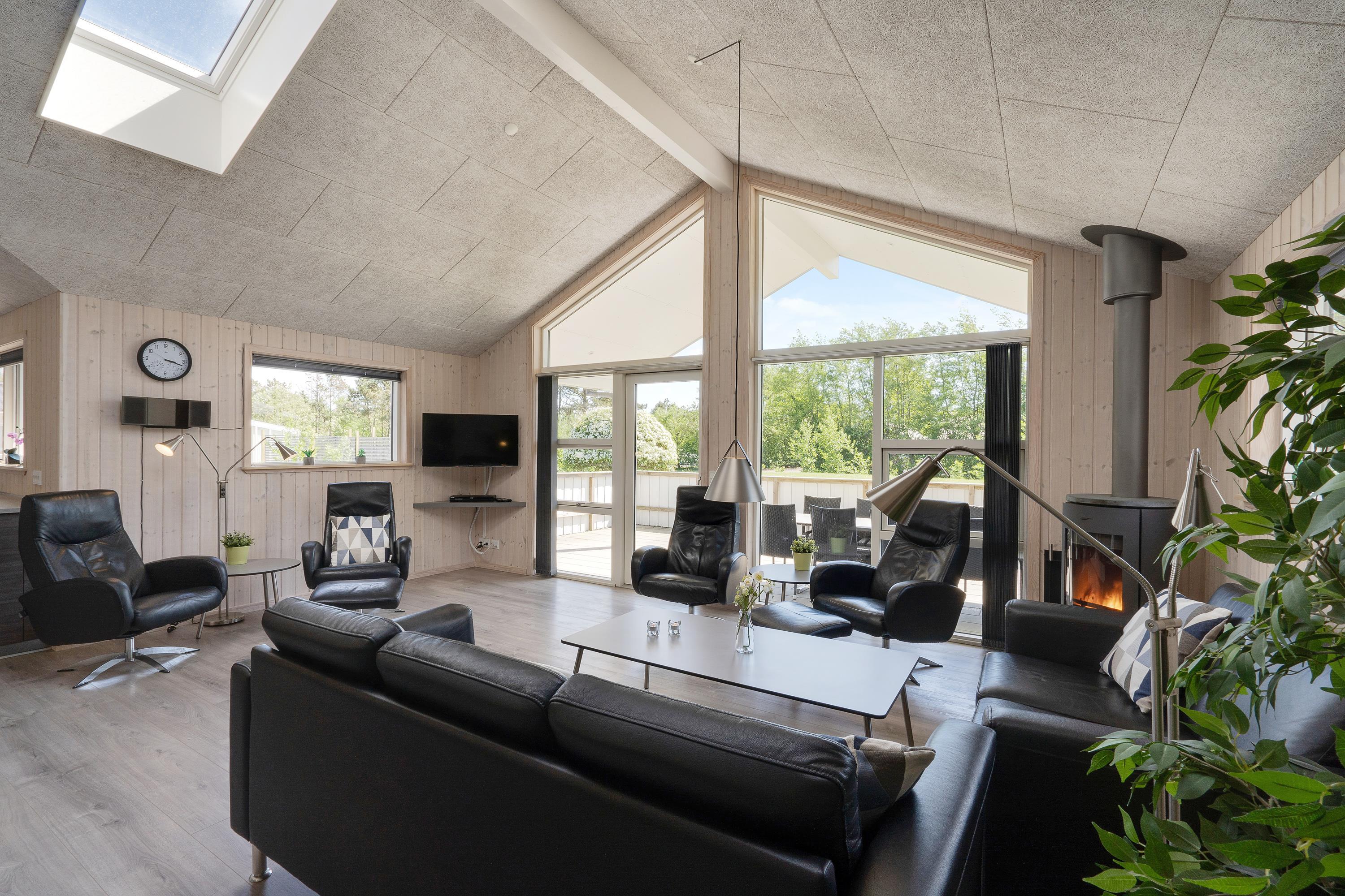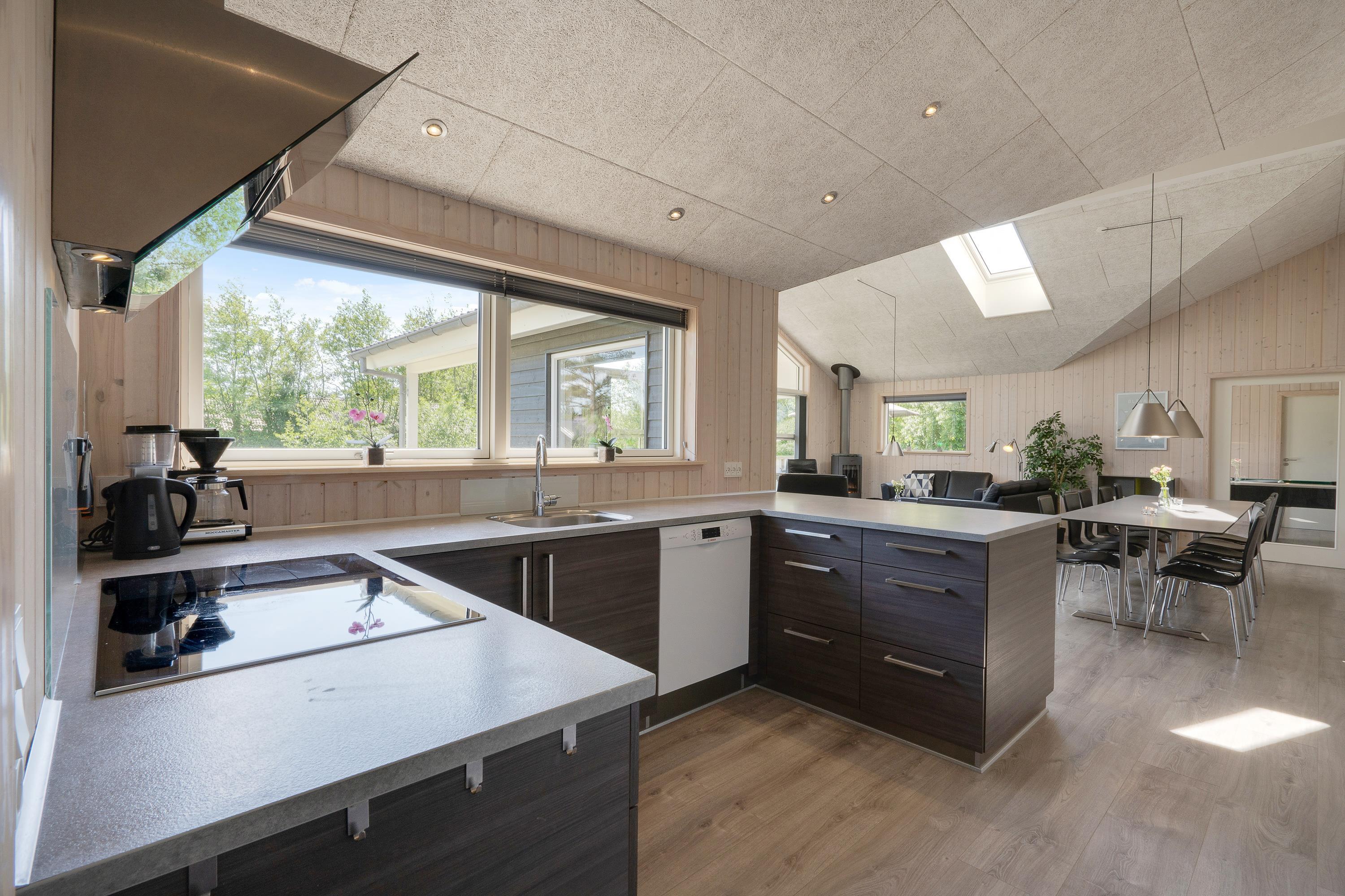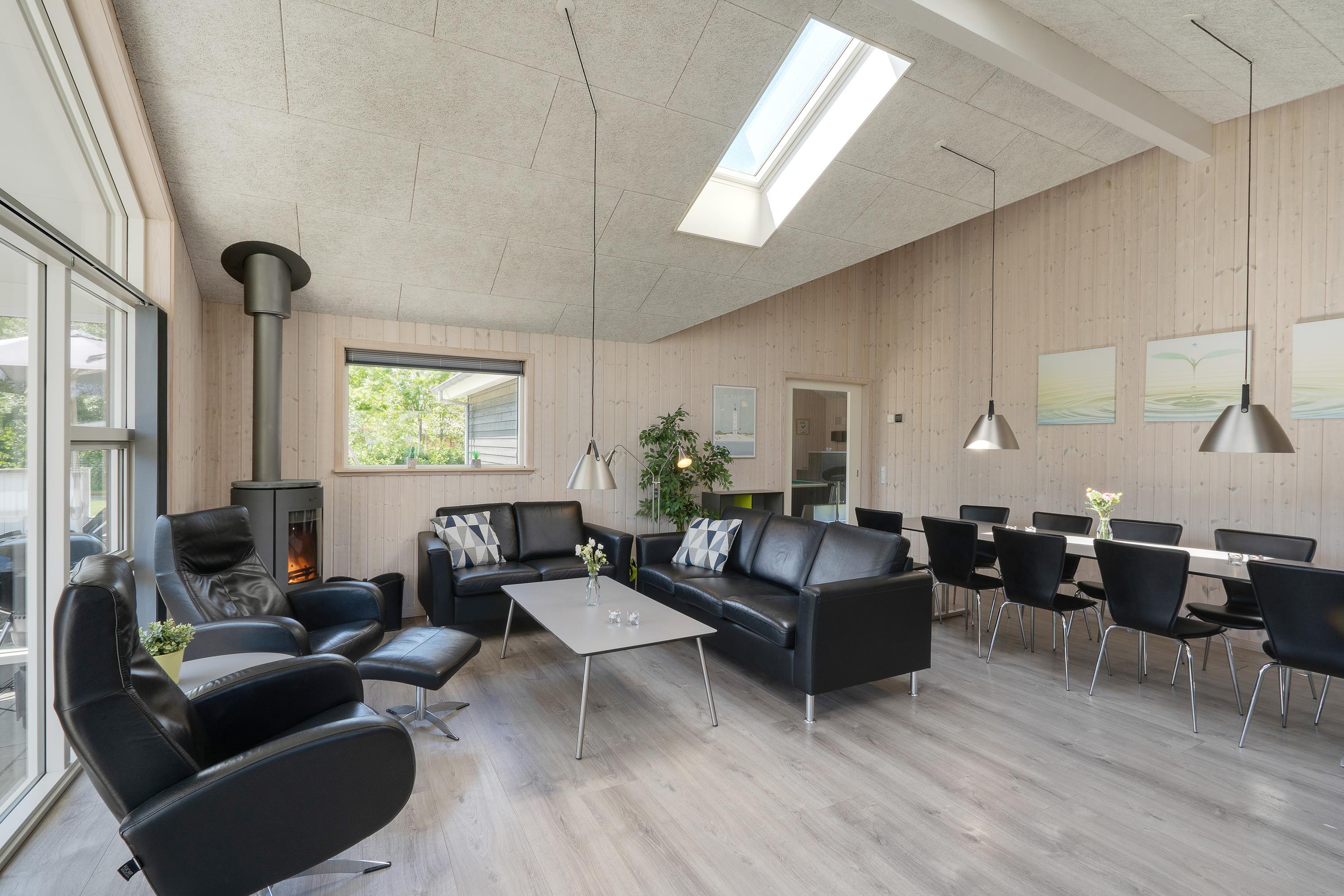 Hjertet i feriehuset er det store alrum, der danner rammerne for mange dejlige feriestunder. Her kan I nyde hinandens selskab, selvom nogle står i køkkenet, og andre sidder omkring spisebordet eller i sofaerne. Takket være Chromecasten kan I streame jeres favoritfilm på ferien. Brændeovnen sørger for god varme og spreder hyggelig stemning med sin knitren.