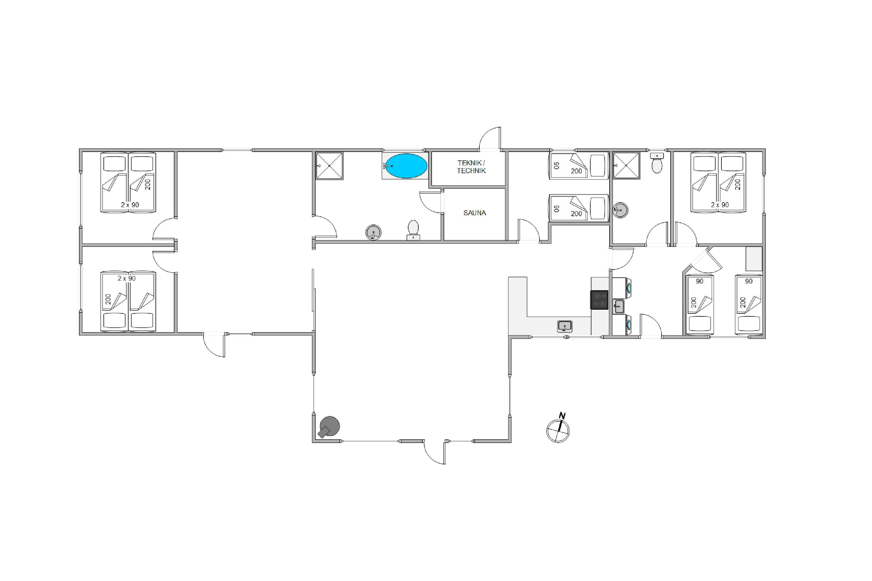 Sommerhuset på 165 kvadratmeter er et rummeligt et af slagsen – her er der god plads til alle feriens gæster. I sommerhuset finder I 5 soveværelser – 3 værelser med dobbeltseng og 2 soveværelser med enkeltsenge. Med hele 2 badeværelser skal I ikke stå i kø om morgenen.