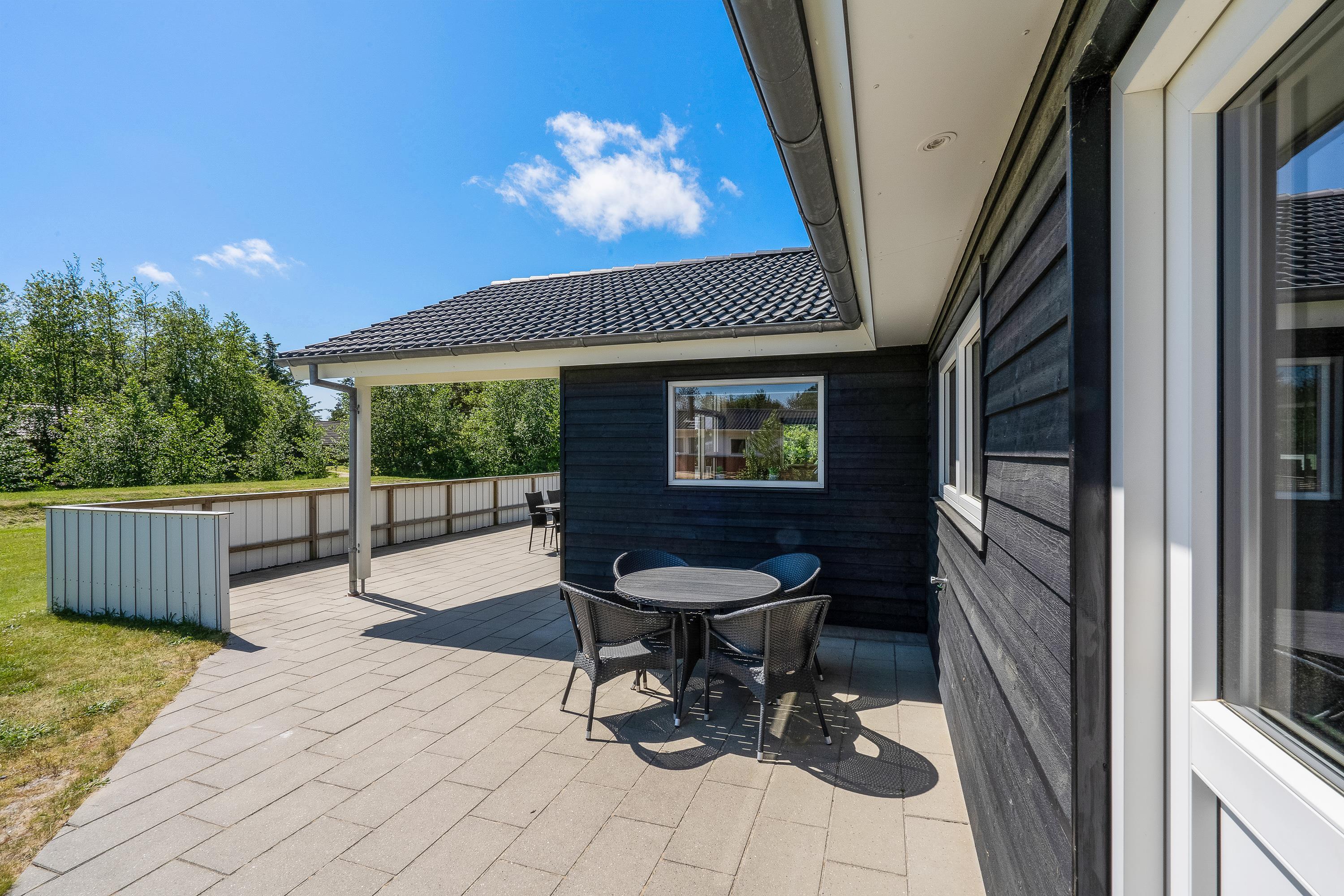 Sommerhusets udeområde er fantastisk at tilbringe feriens varme og solrige dage på. Her har I en skøn terrasse, der er afskærmet og delvist overdækket. Hvad end I foretrækker at sidde i sol eller skygge, er det altså muligt her. Og takket være afskærmning og overdækning kan I også sidde i ly og læ.