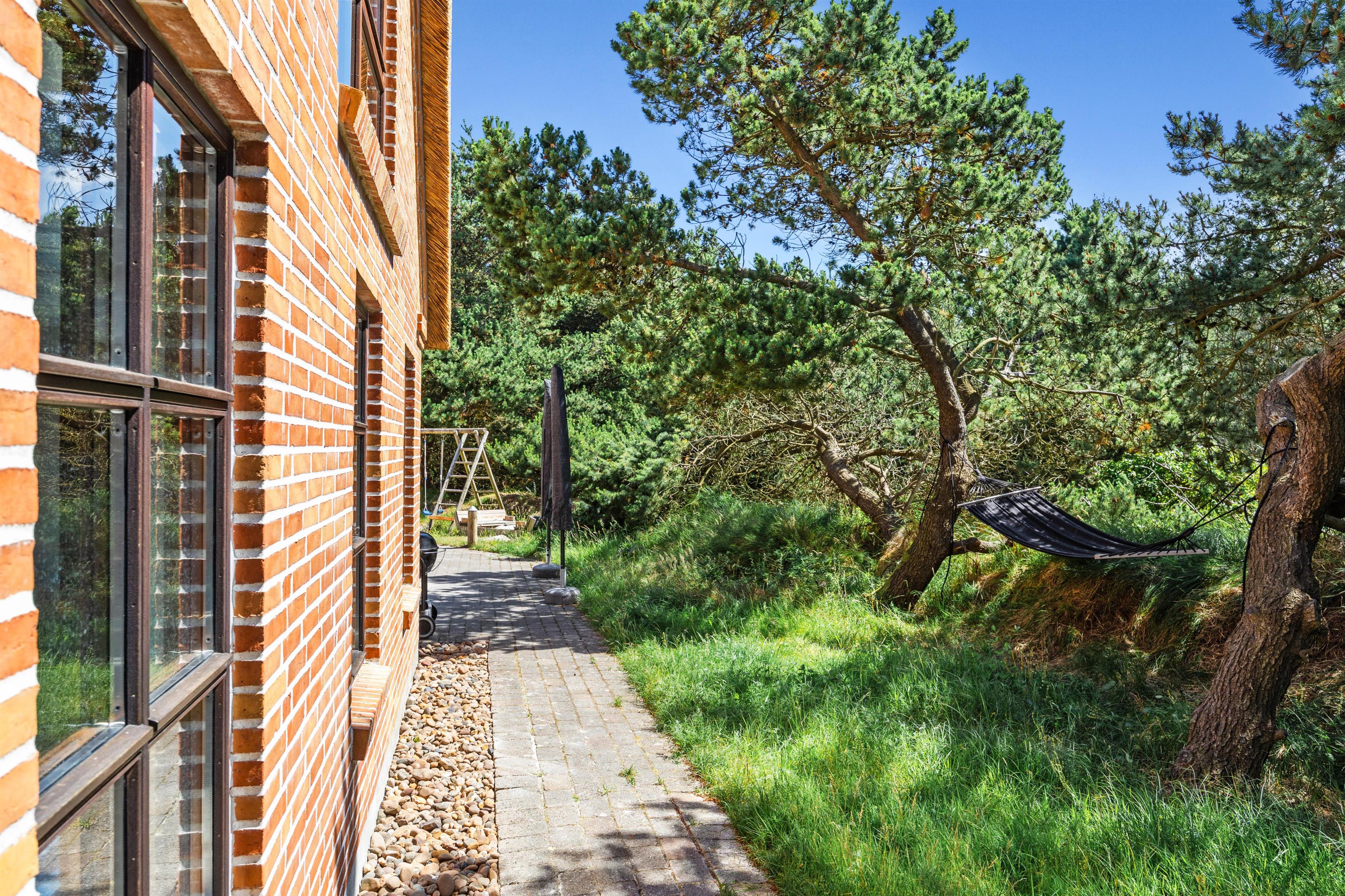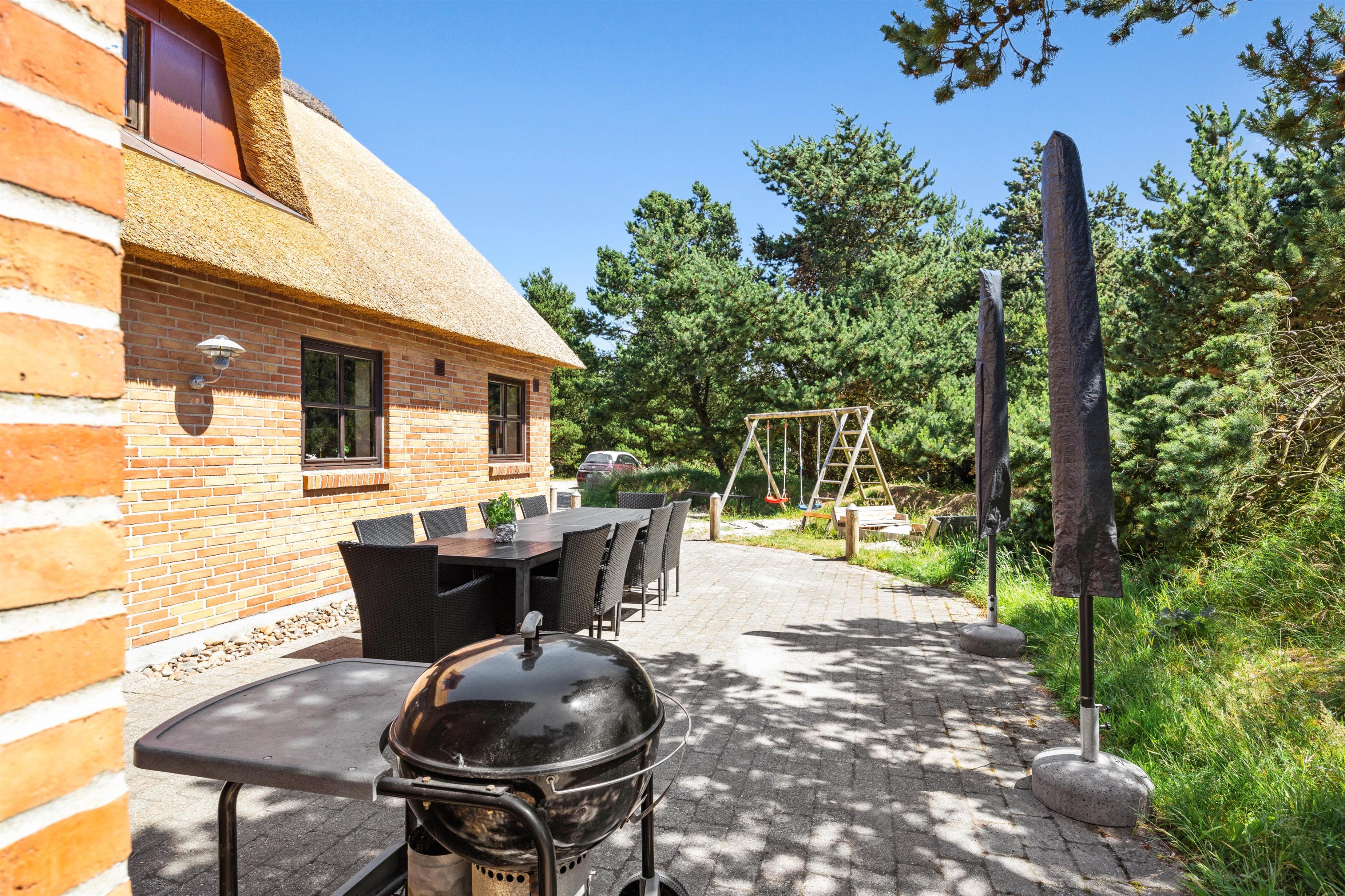 Den store naturgrund er omgivet af høje træer, som giver jer en fuldstændig ugeneret beliggenhed midt i den vestjyske natur. Slæng jer i havemøblerne og nyd solens varme stråler, mens fuglene synger i trætoppene, og børnene leger på græsplænen. Til de yngste er der gynge og sandkasse.