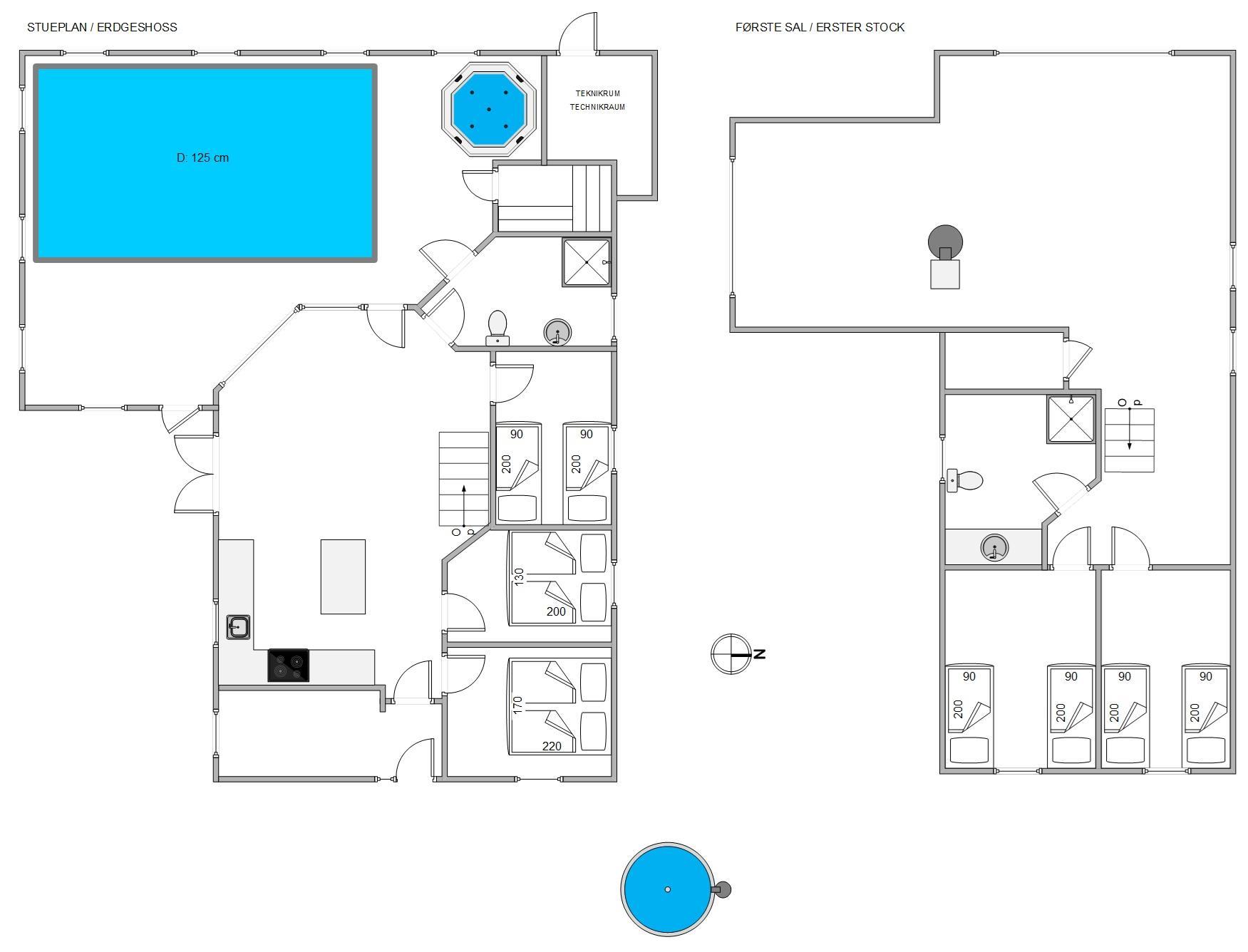 Poolhuset råder over 2 etager med sovepladser både i stueetagen og på første sal samt et badeværelse på hver etage. Der er både opvaskemaskine, vaskemaskine, tørretumbler og en hurtig og stabil internetforbindelse i huset.