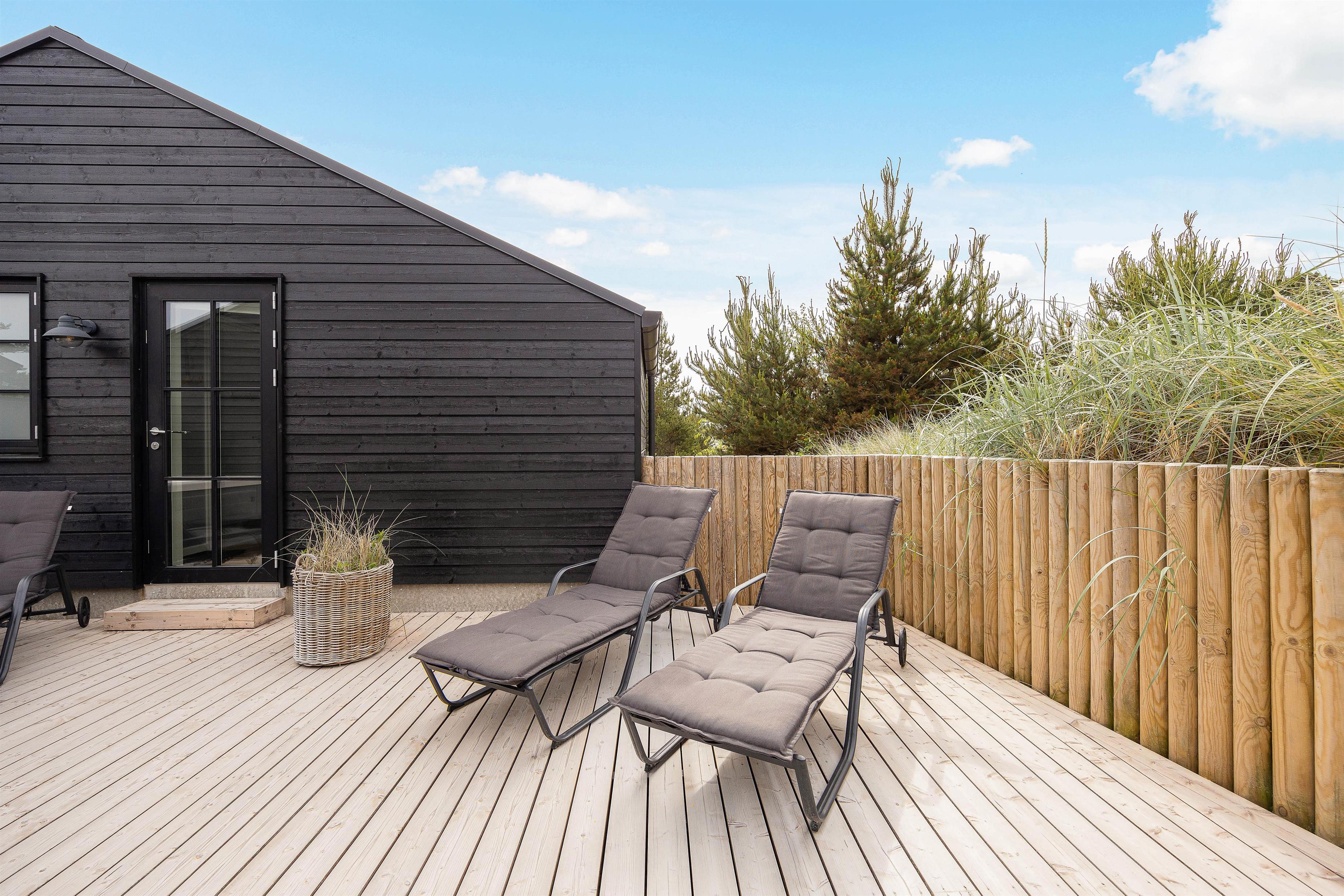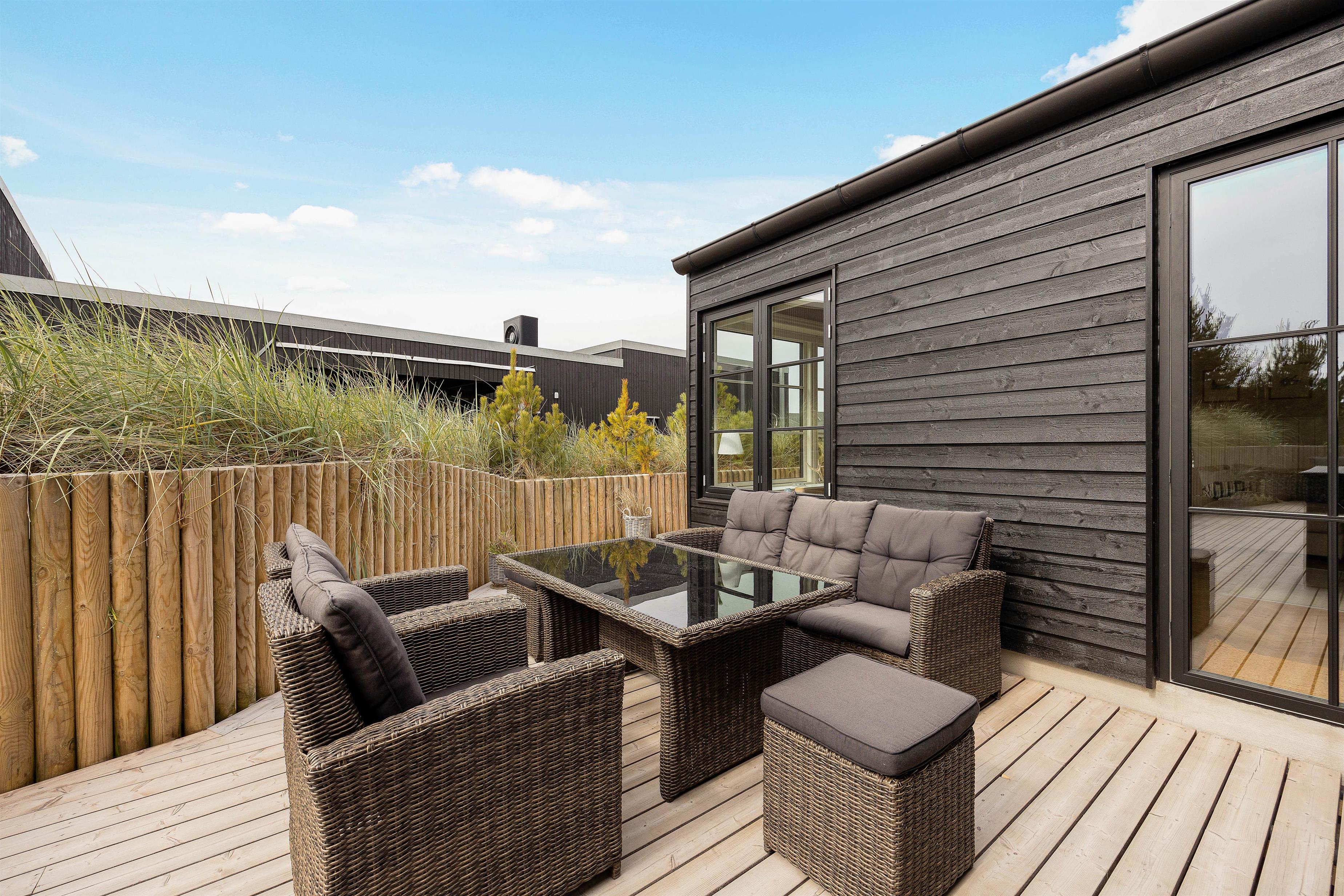 Sommerhuset emmer ikke kun af luksus indenfor; udemiljøet er også helt i top. Her er en tilsvarende stor terrasse, hvor der er flere fine kroge med havemøbler, liggestole og en grill. Dele af terrassen er tilmed overdækket, så I kan runde dagen af med en lækker grillaften i aftensolen på den overdækkede vestvendte terrasse med terrassevarmer.
