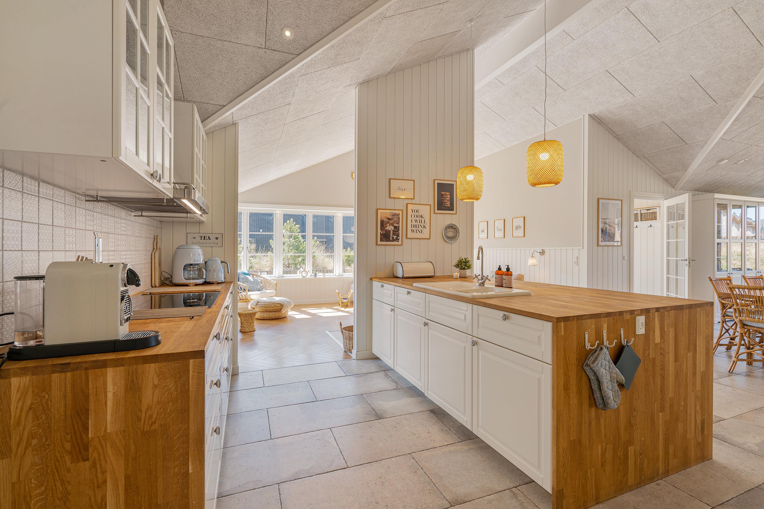 Feriehusets hjerte er uden tvivl det store køkkenalrum. I køkkenet er der rigeligt plads til at samles om madlavningen, mens resten af familien spiller spil ved spisebordet eller slapper af i den komfortable sofa foran brændeovnen. Køkkenet er veludstyret og indeholder både 2 køleskabe, 2 ovne, opvaskemaskine, vinkøler og Nespressomaskine med mælkeskummer.