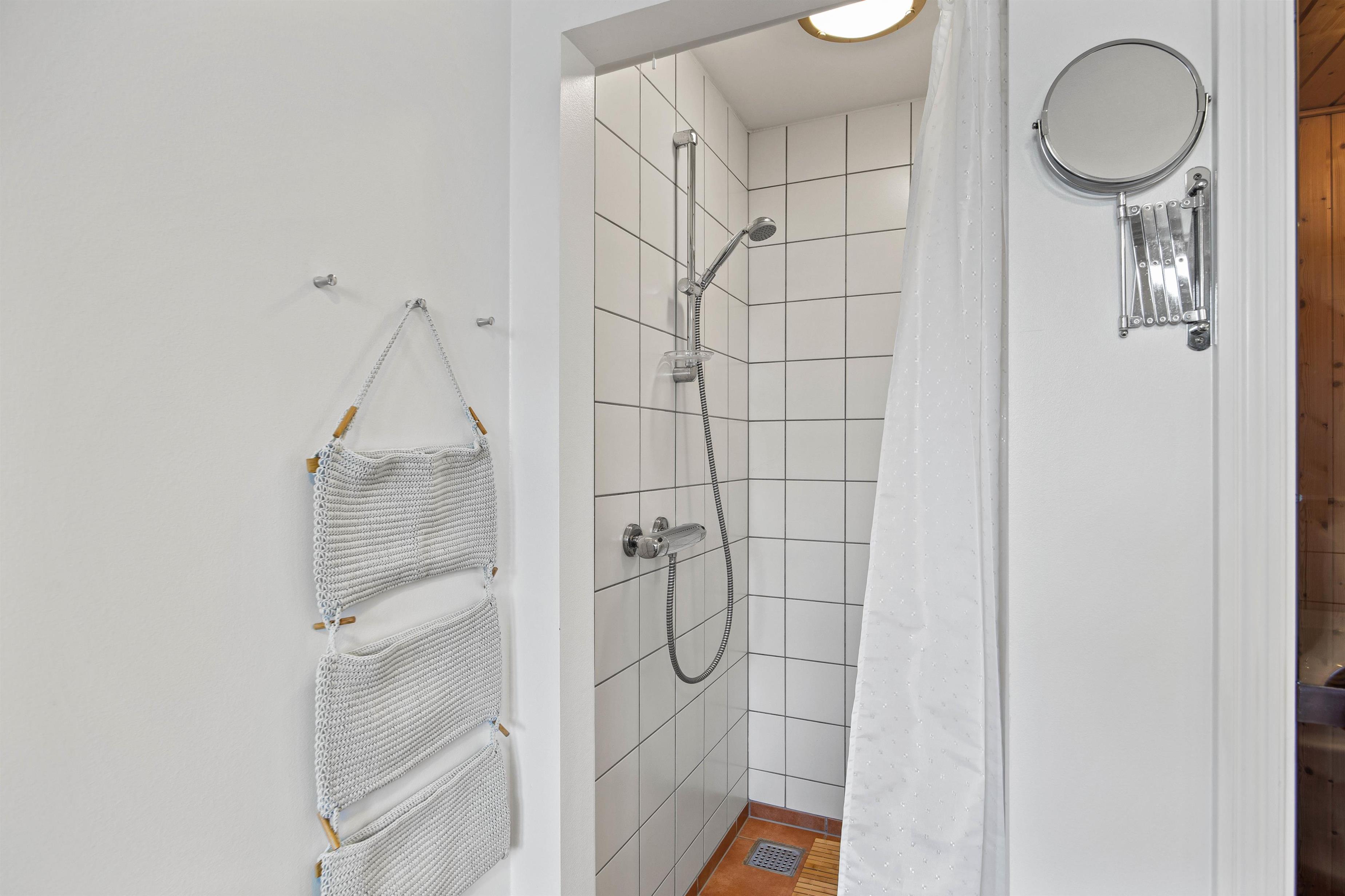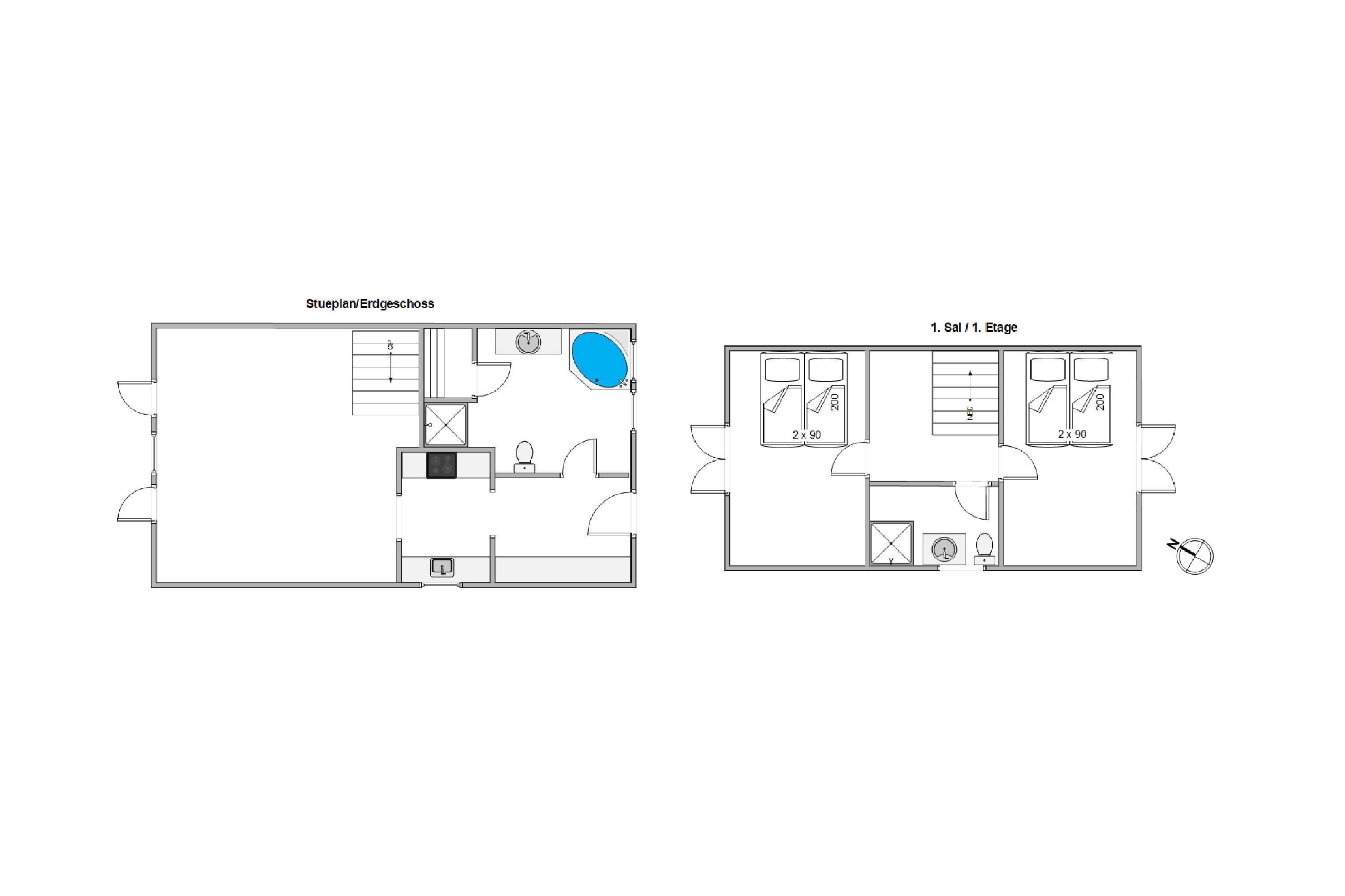 I feriehusets stueplan finder I desuden det ene af sommerhusets badeværelser. Her kan I se frem til masser af afslapning i spabadet og saunaen, hvor I kan slappe fuldstændig af og komme helt ned i gear. Det andet badeværelse finder I på førstesalen, og begge badeværelser er desuden udstyret med gulvvarme.
