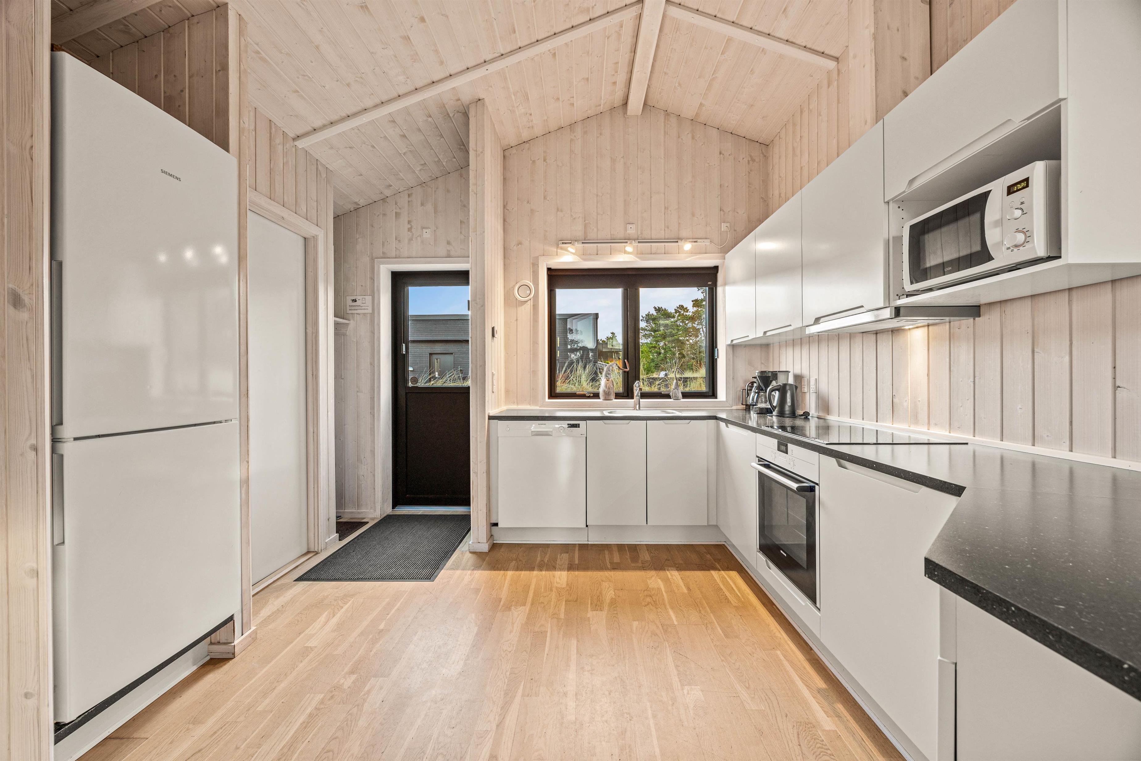 Sommerhusets midtpunkt er opholdsstuen, hvor brændeovnen ikke kun skaber en varm atmosfære, men også er et ideelt sted at mødes. Takket være det moderne køkken med opvaskemaskine kan du tilberede kulinariske lækkerier og føle dig helt hjemme. Hvis du har glemt en ingrediens, ligger det nærmeste supermarked næsten lige over for feriehuset, så du behøver ikke at gå på kompromis.