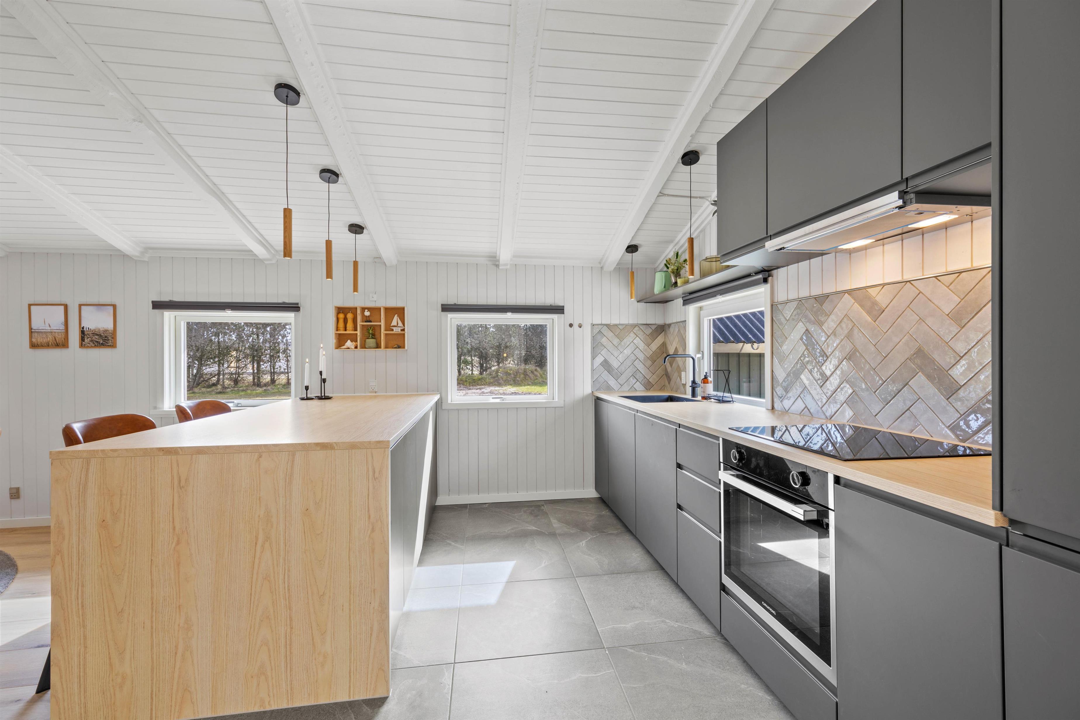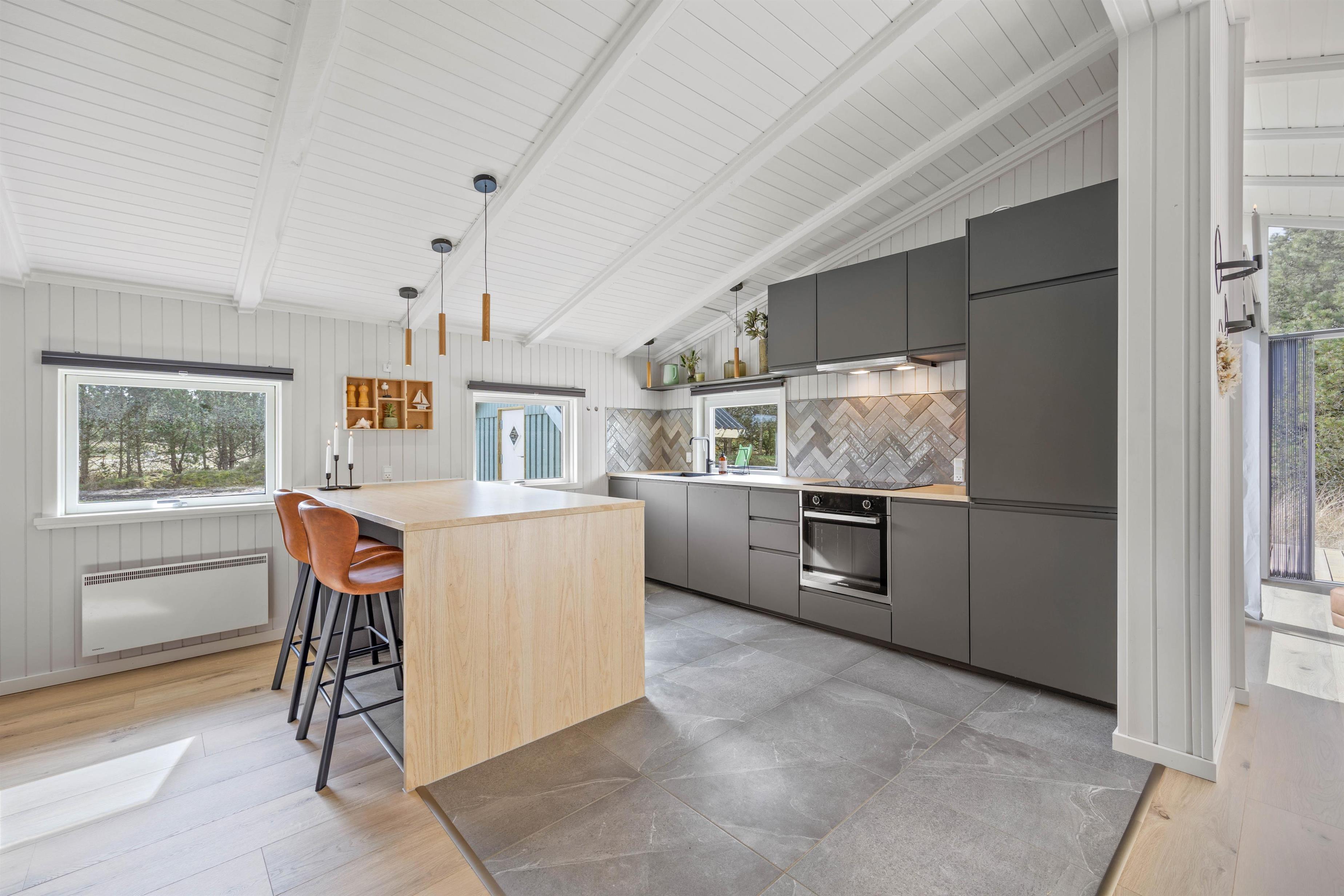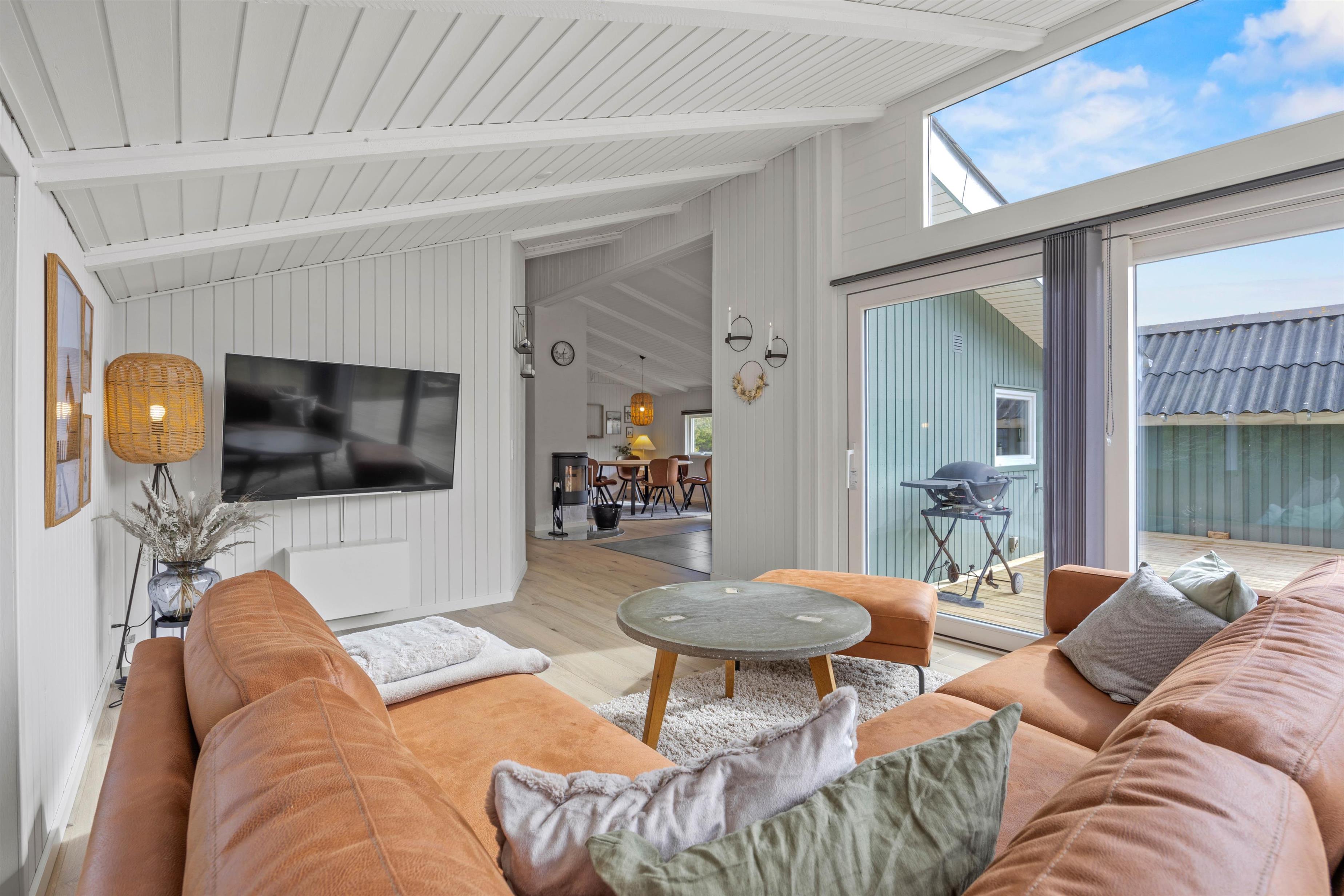 Det åbne alrum er kernen i feriehuset, hvor I kan samles til hyggelige timer med brætspil omkring spisebordet, alt imens familiens mesterkok tilbereder lækkerier i det stilfulde og velindrettede køkken med opvaskemaskine. Om aftenen kan I gøre jer det behageligt i dem komfortable sofa, og se en god film i brændeovnens skær.