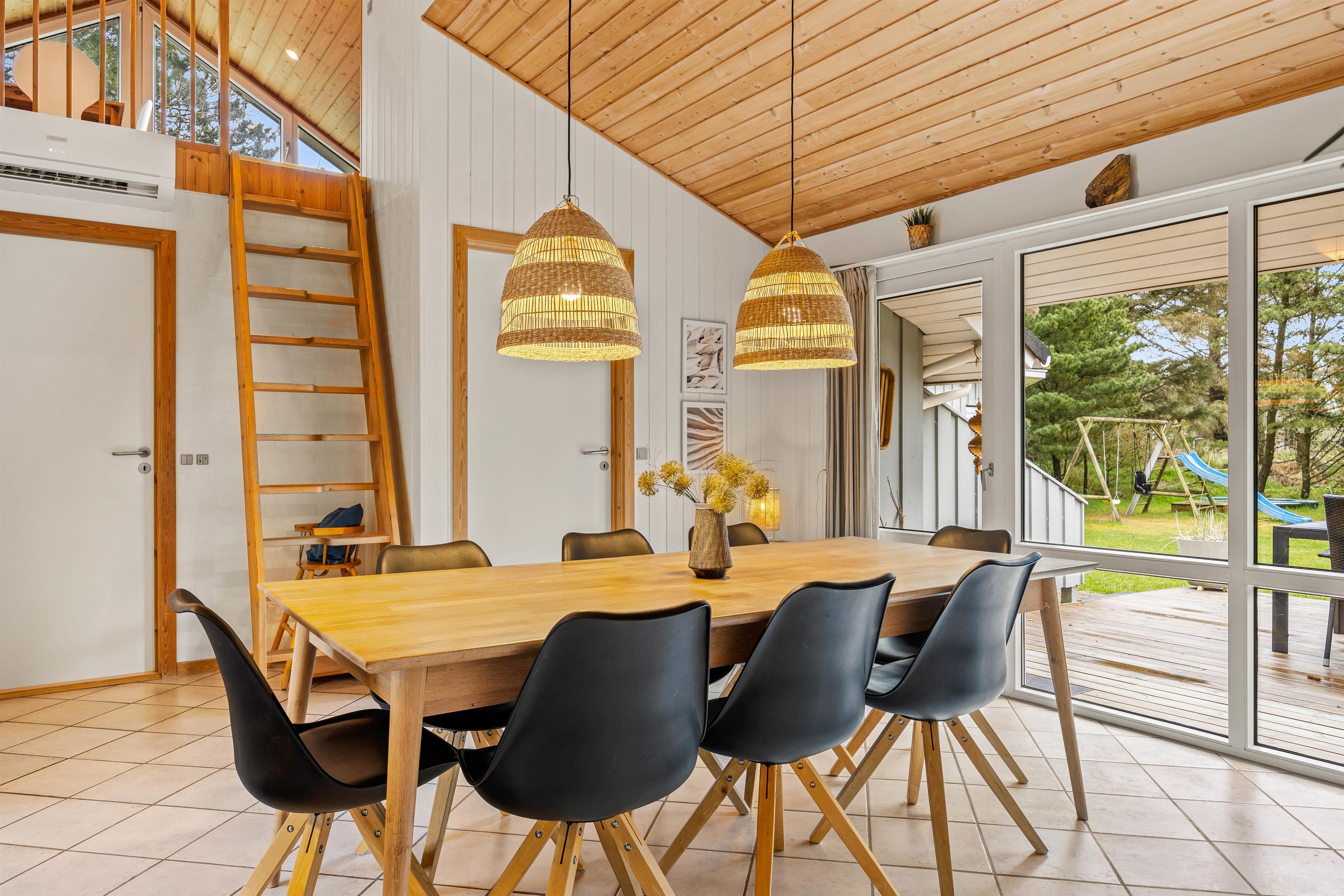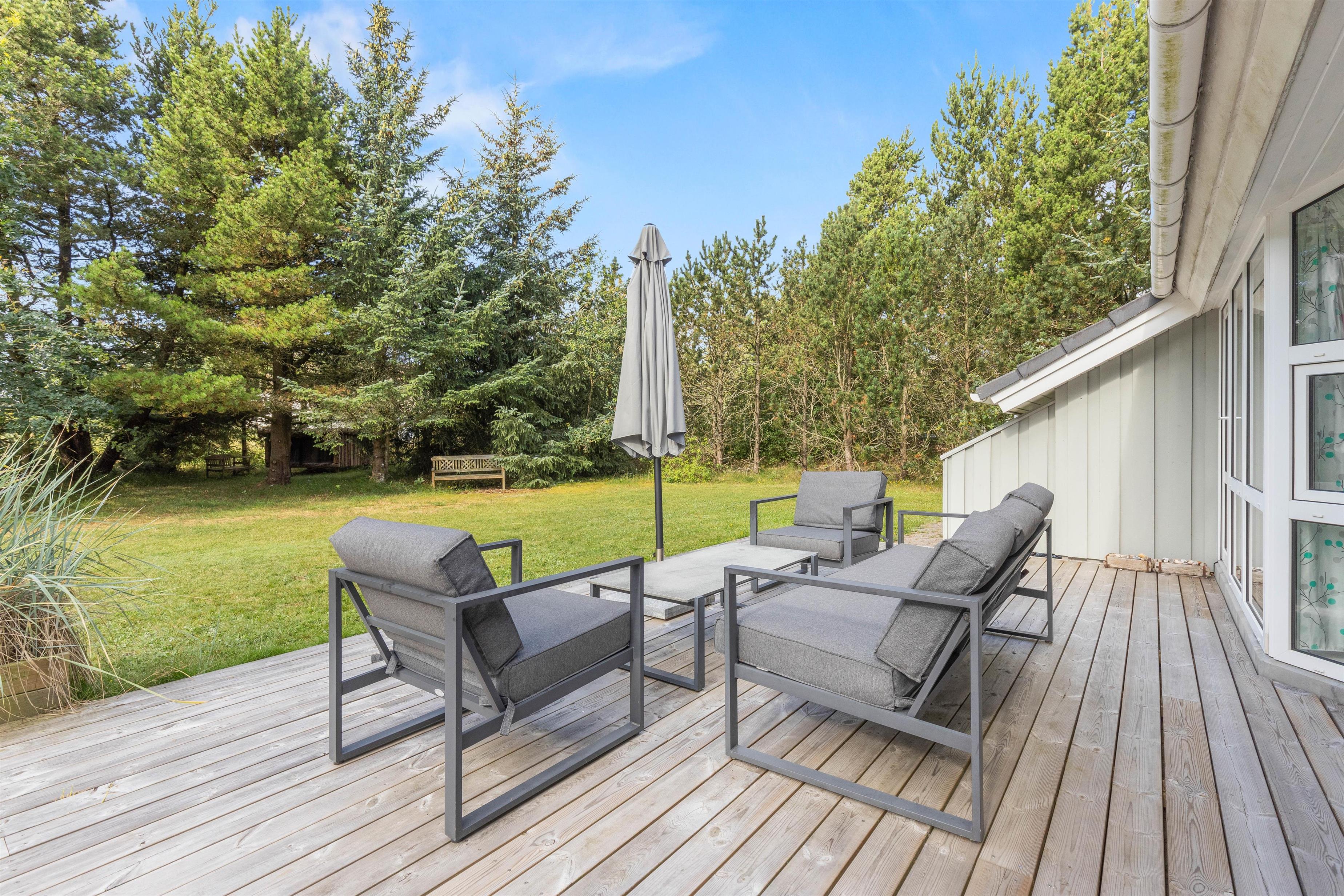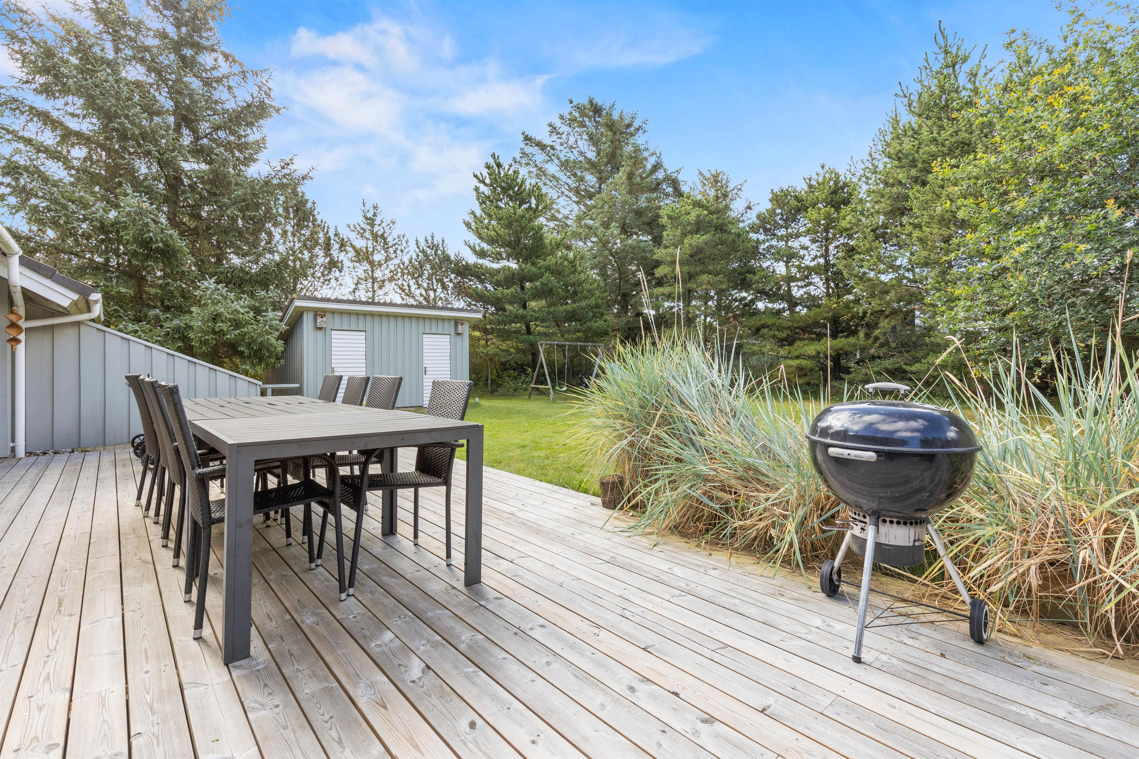 Den store træterrasse strækker sig over næsten hele feriehusets sydside. Der er flere sæt komfortable havemøbler til rådighed, så alle kan gøre sig det behageligt og slappe af med en god bog. Der er også tænkt på de yngre gæster - både et bænkesæt, sandkasse, klatrestativ med rutsjebane og trampolin er klar til børnene. På græsplæne er der også plads til leg, tummel og boldspil. Tænd op i grillen, og slut dagen af med et lækkert grillmåltid sammen. Og hvis I vil prøve noget nyt natten over, så sov en nat i shelter, dette vil børnene huske i langt ud i fremtiden.